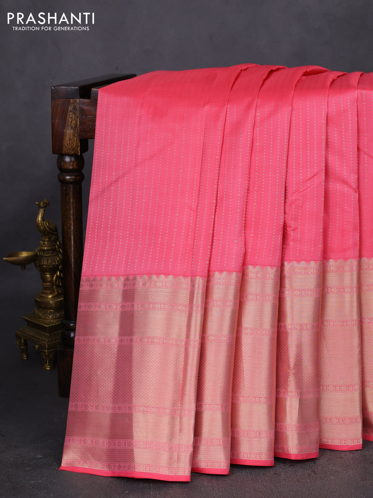Pure kanchipuram silk saree peach pink with allover zari woven butta weaves and long zari woven korvai border