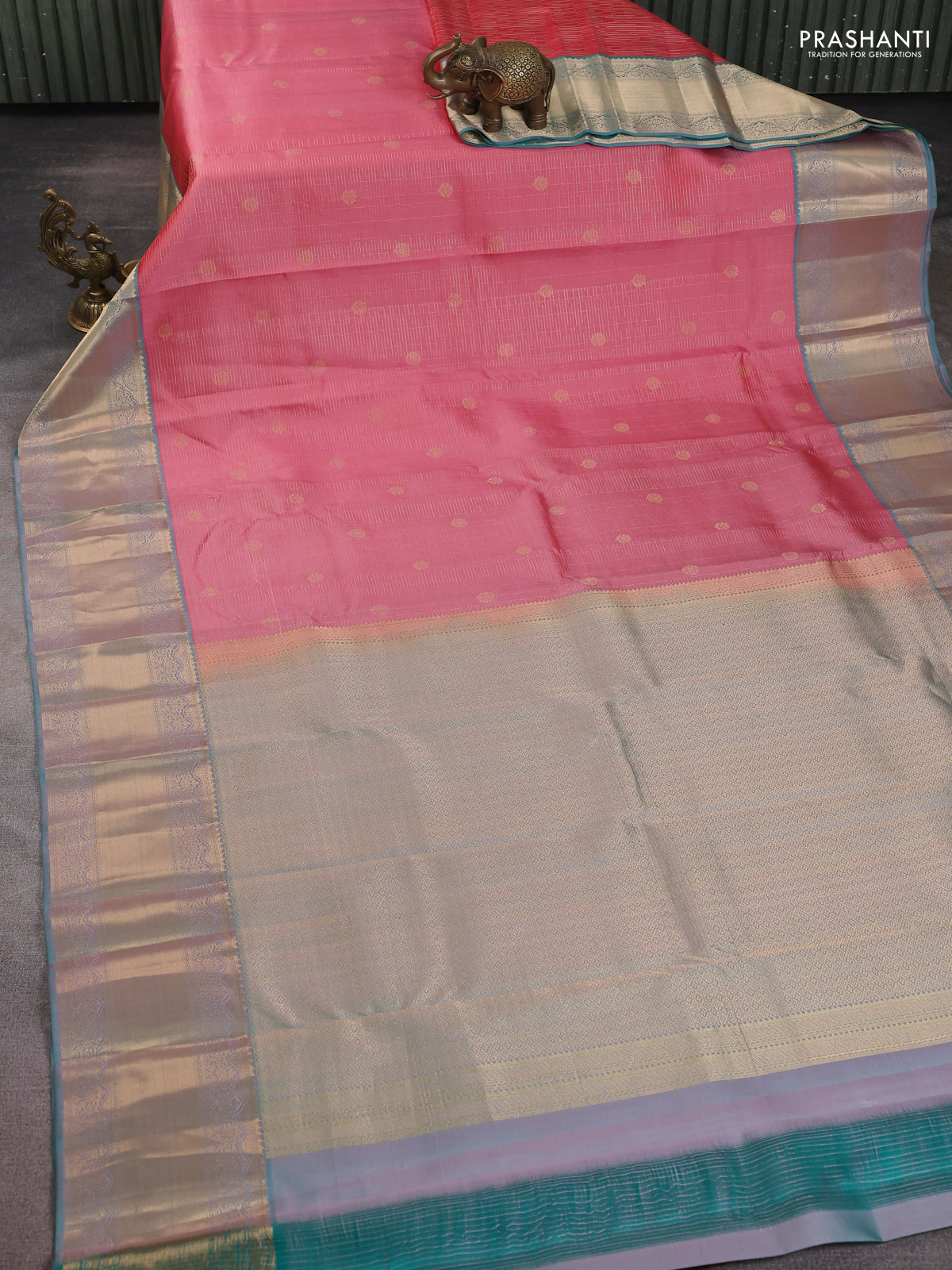 Pure kanchipuram silk saree peach shade and dual shade of teal blue with allover zari weaves & buttas and long zari woven border
