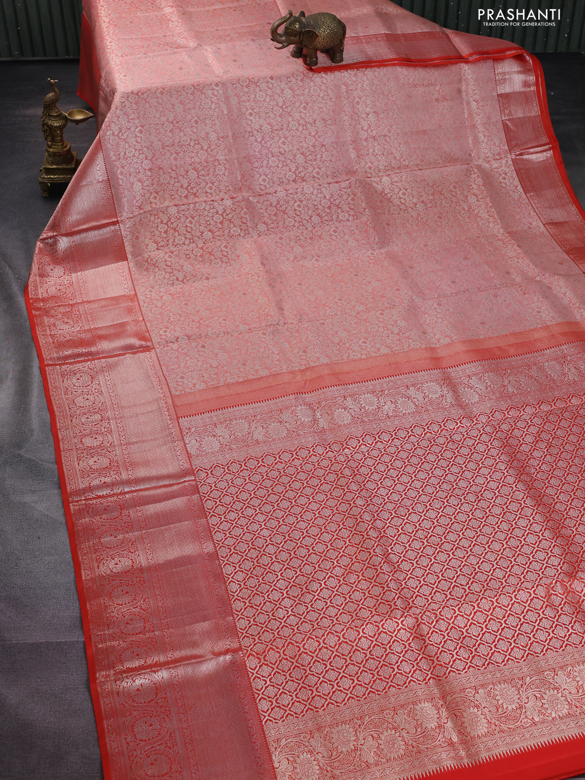 Pure kanchipuram silk saree peach shade and orange with allover silver zari woven brocade weaves and silver zari woven border