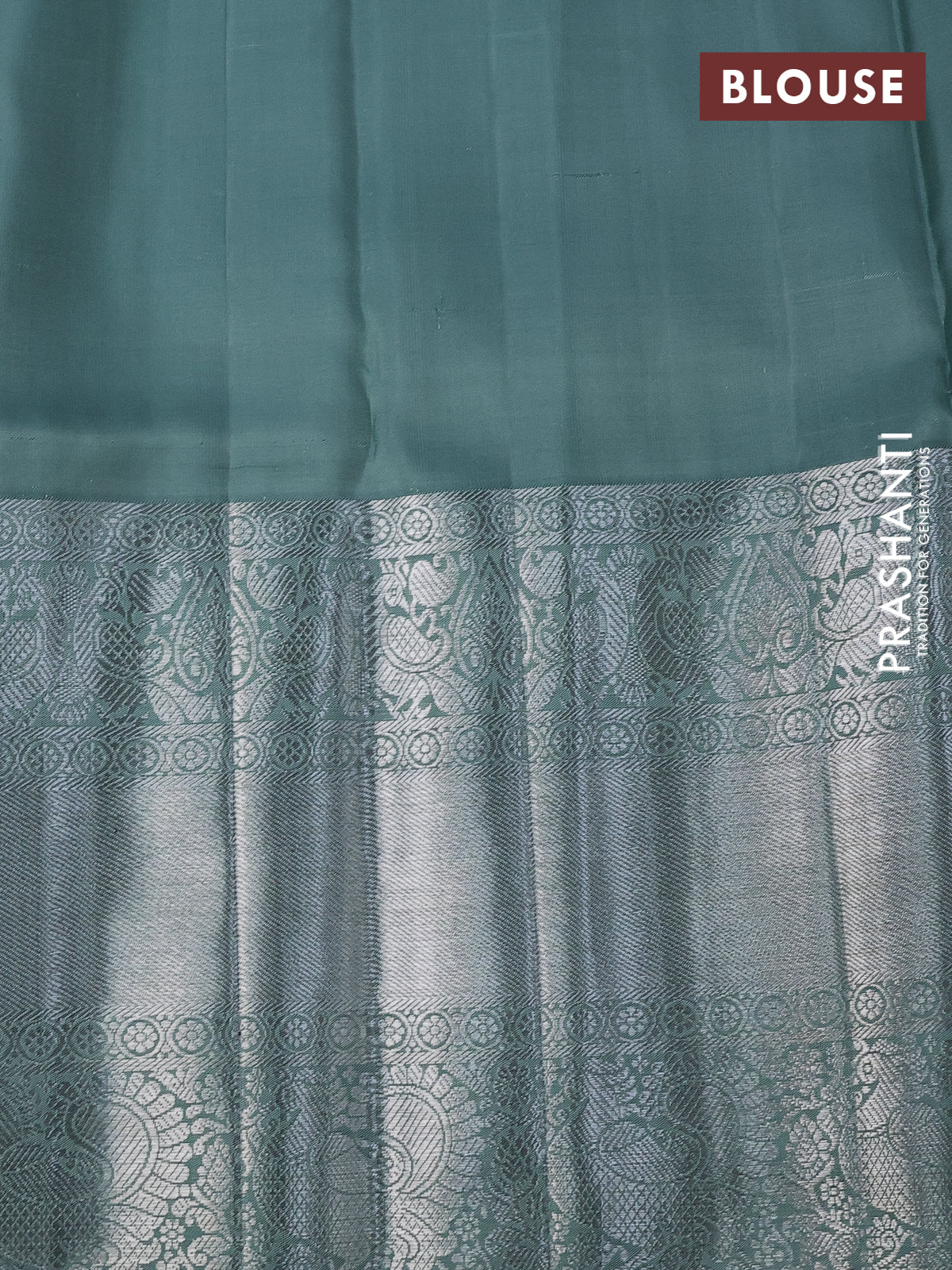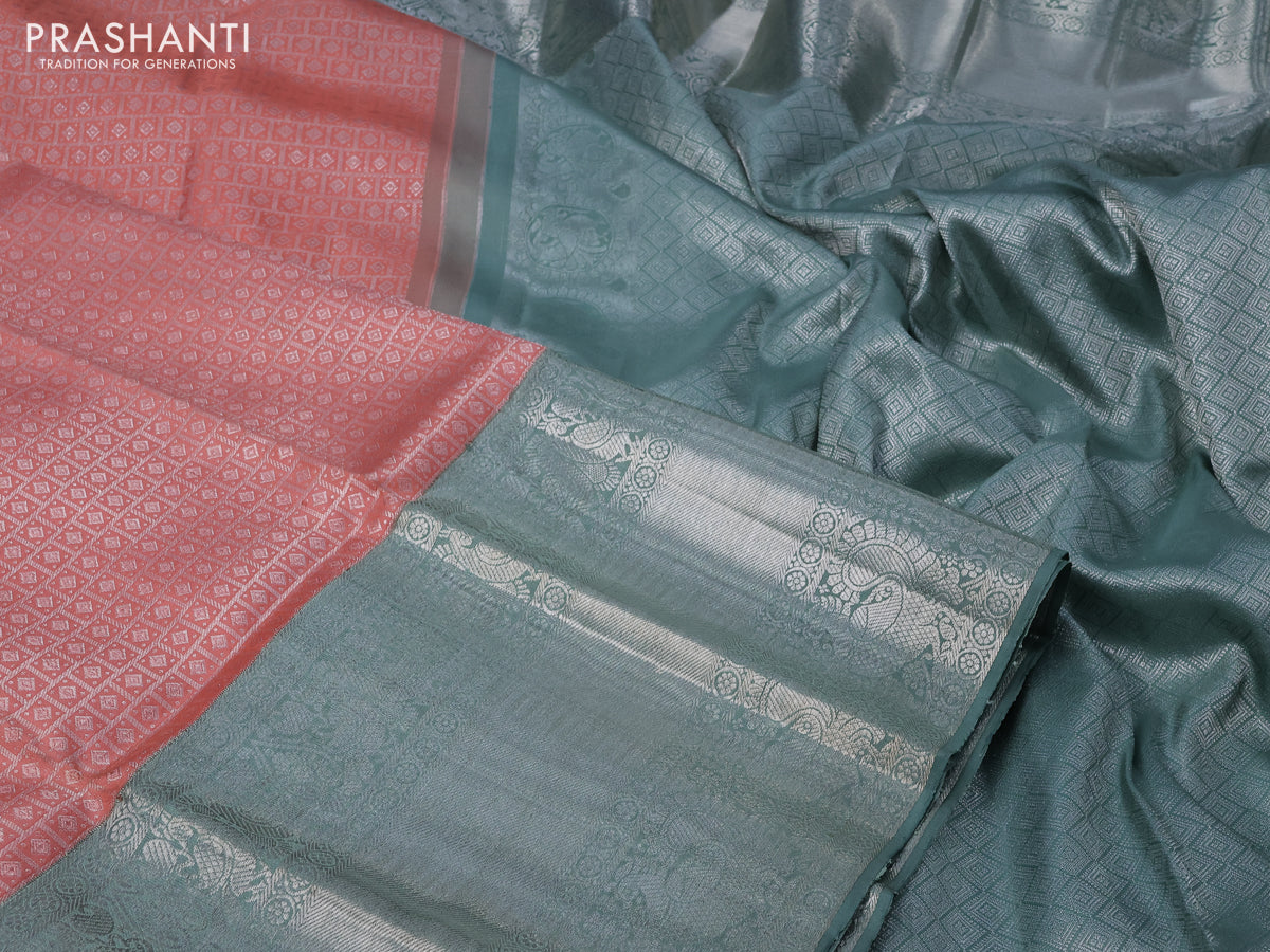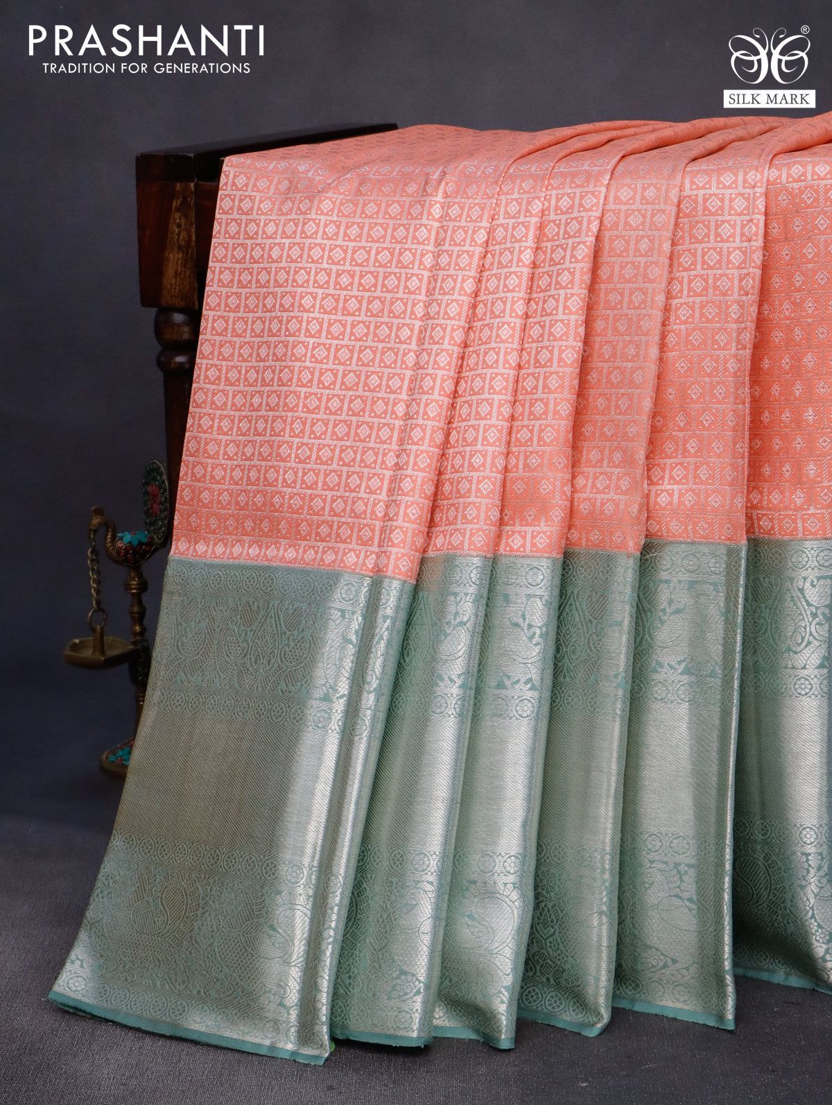 Pure kanchipuram silk saree peach shade and pastel green with allover silver zari woven brocade weaves and long silver zari woven border