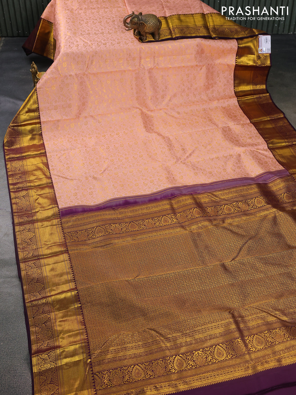 Pure kanchipuram silk saree peach shade and wine shade with allover zari woven brocade weaves and zari woven border