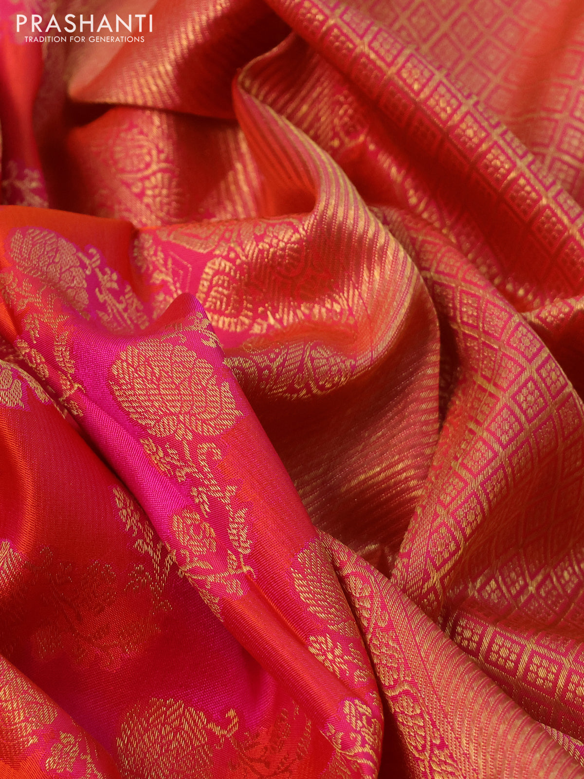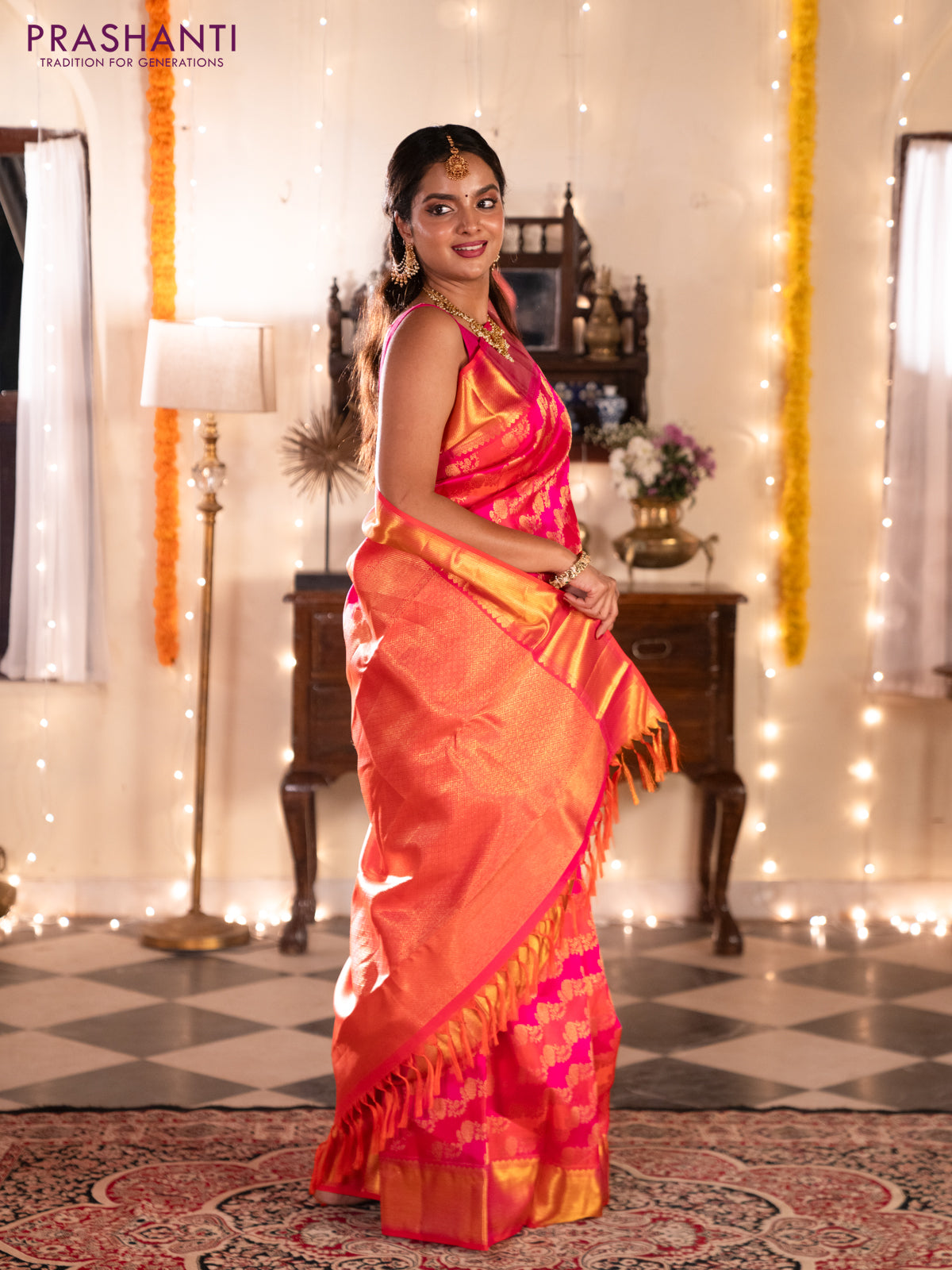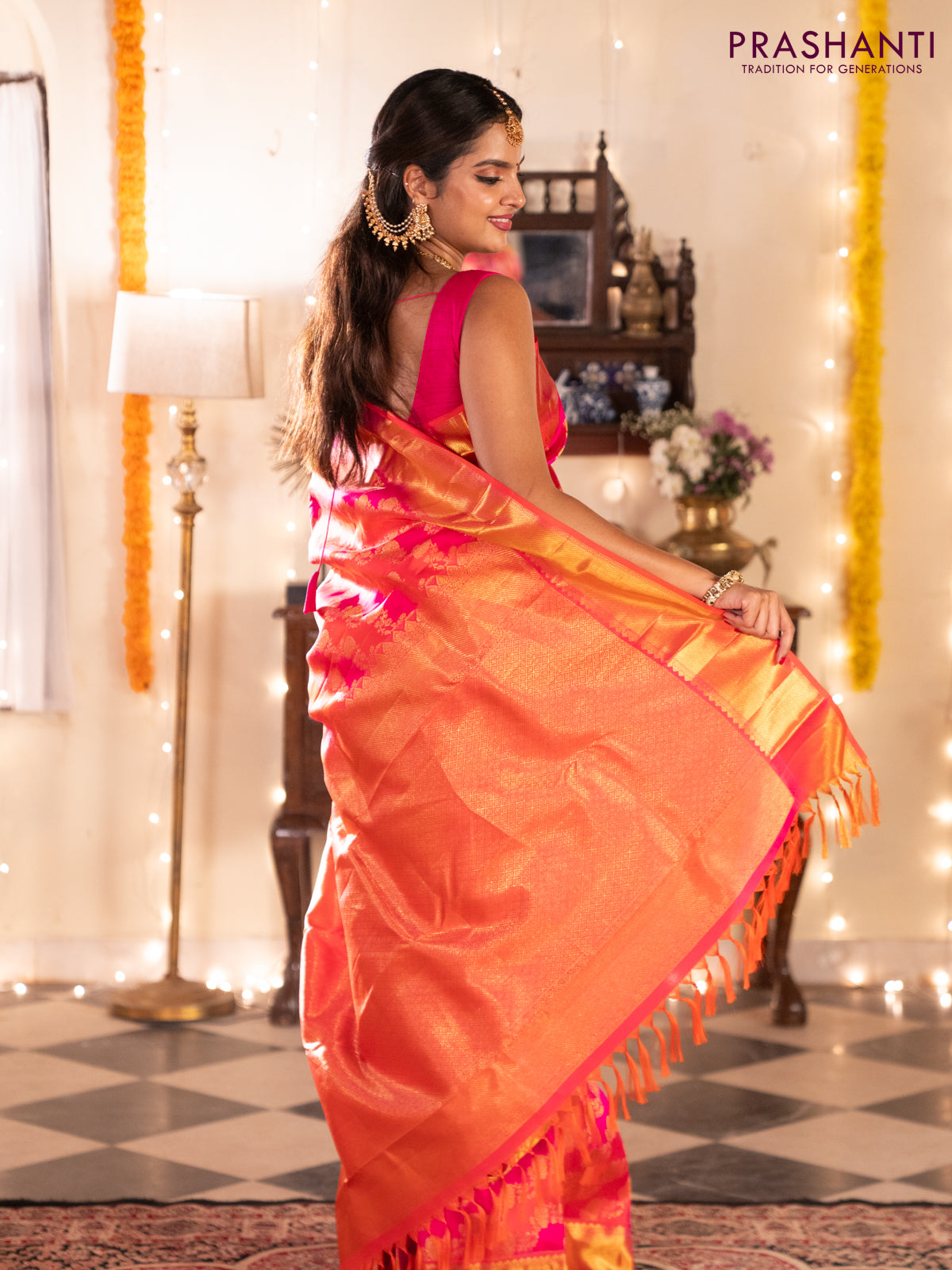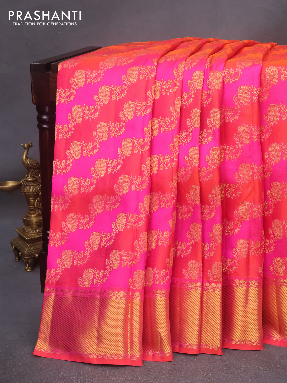 Pure kanchipuram silk saree pink and orange with allover zari woven stripes pattern and zari woven border