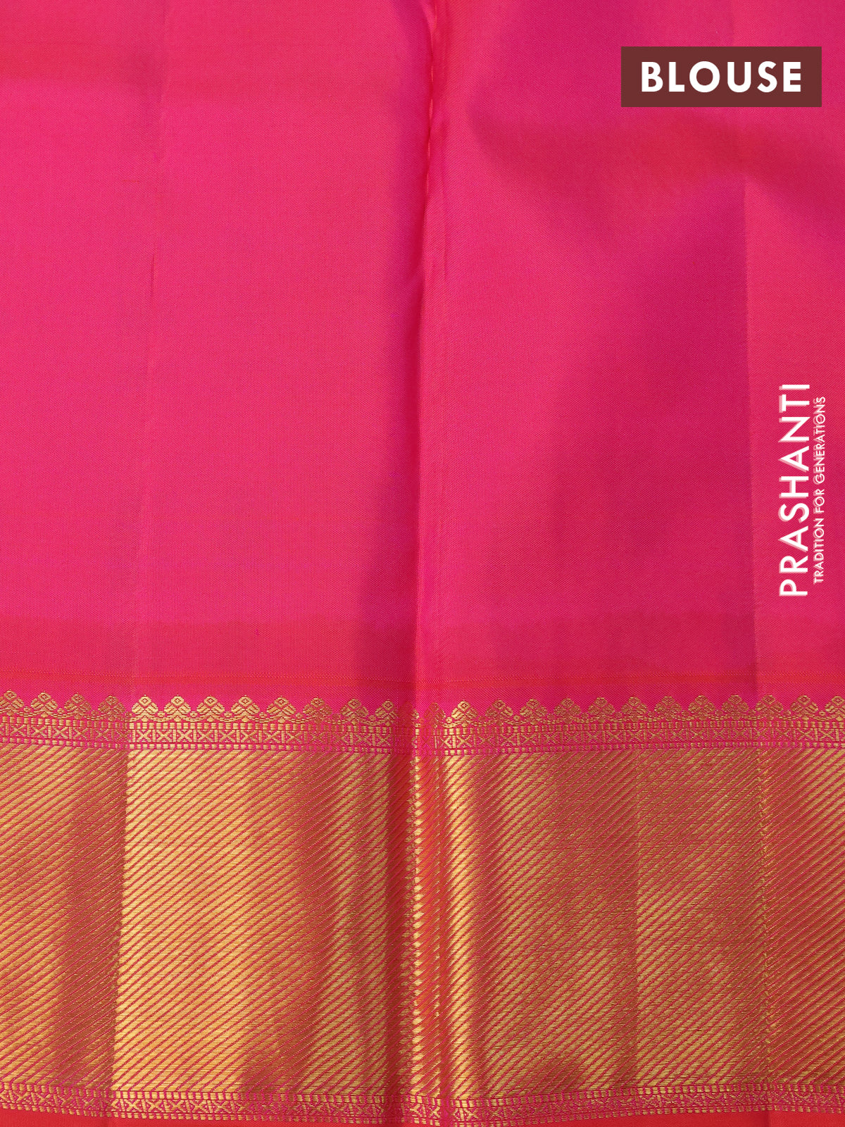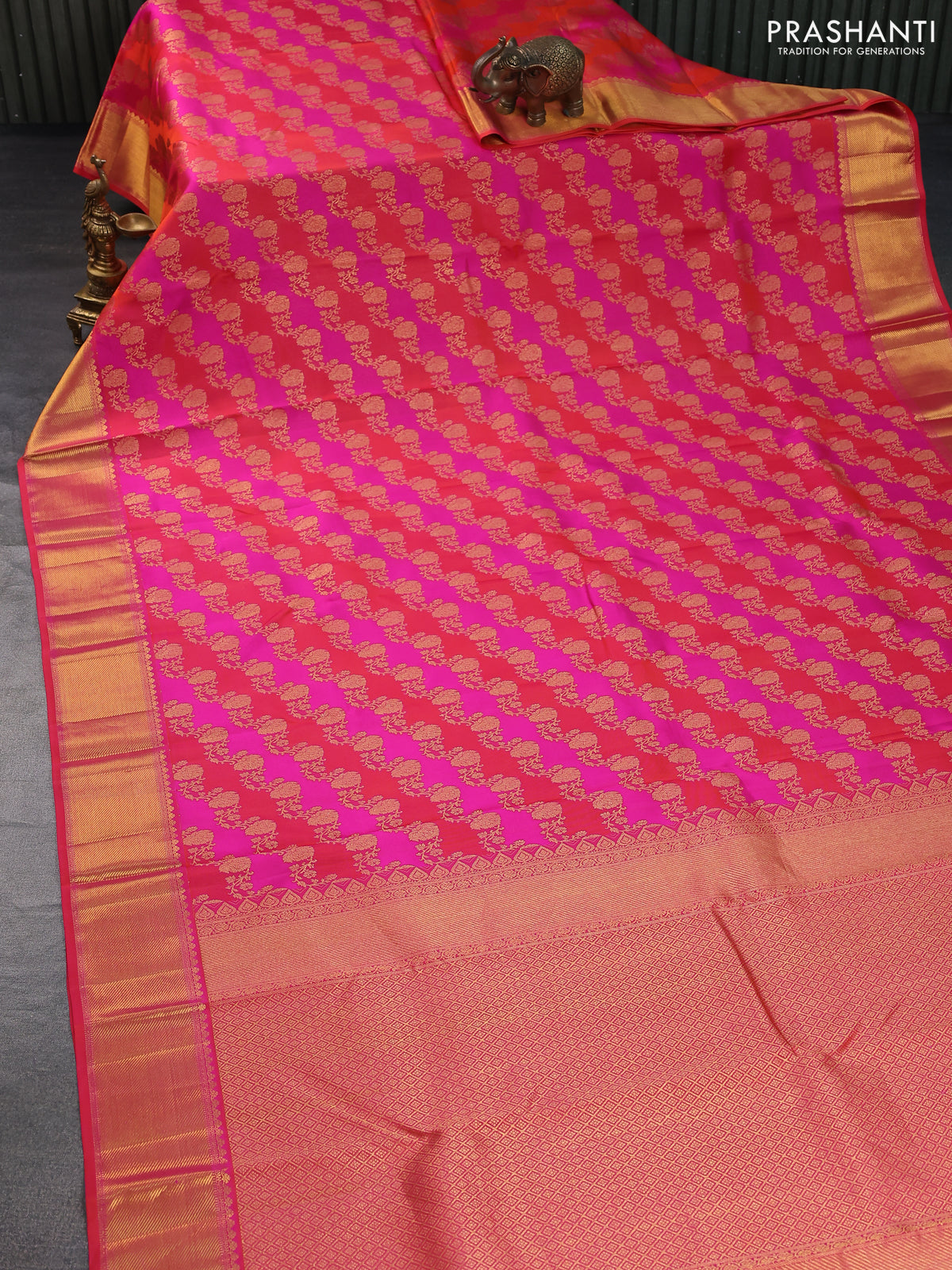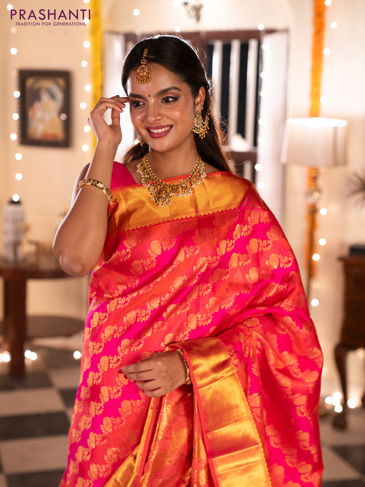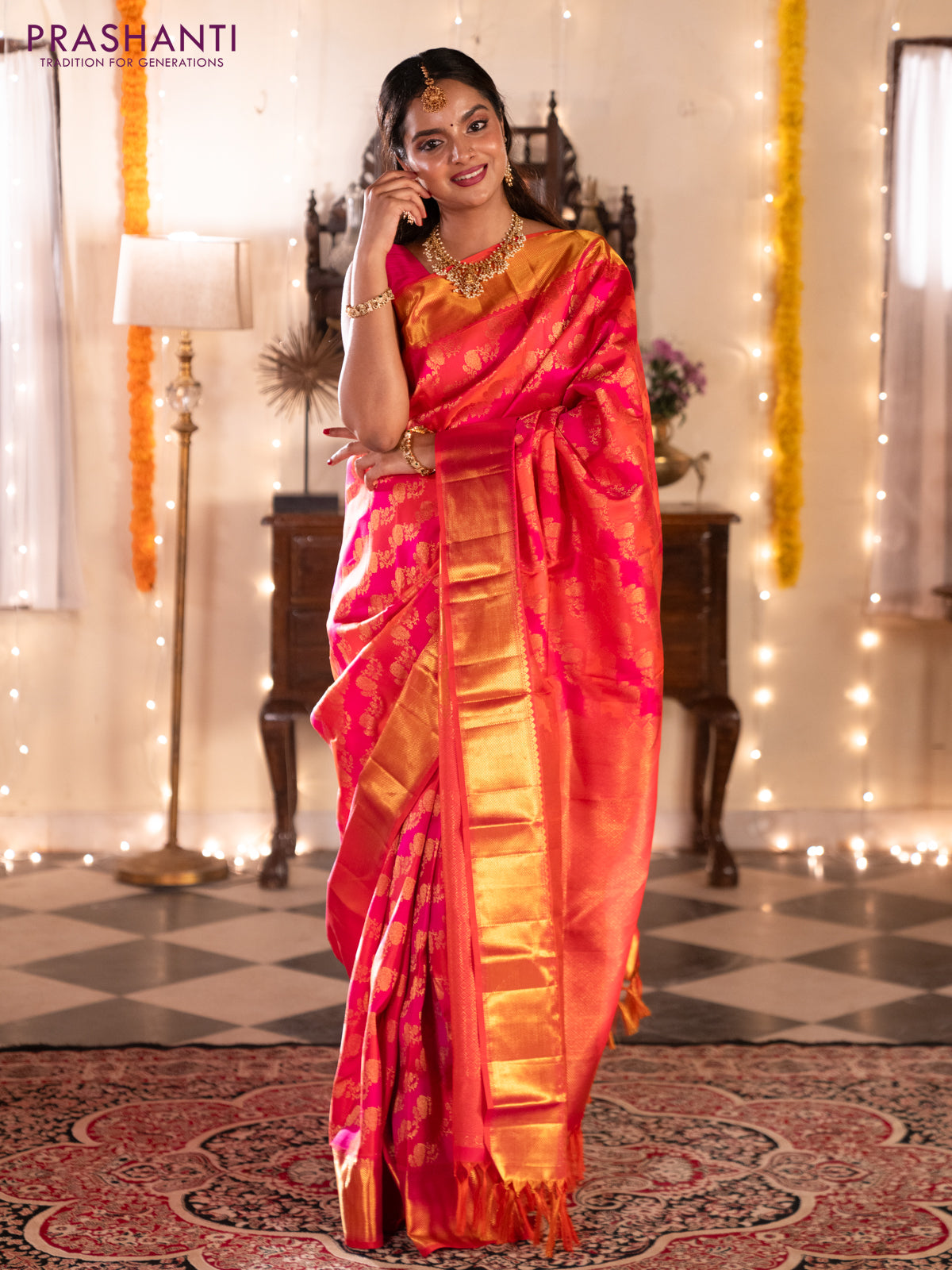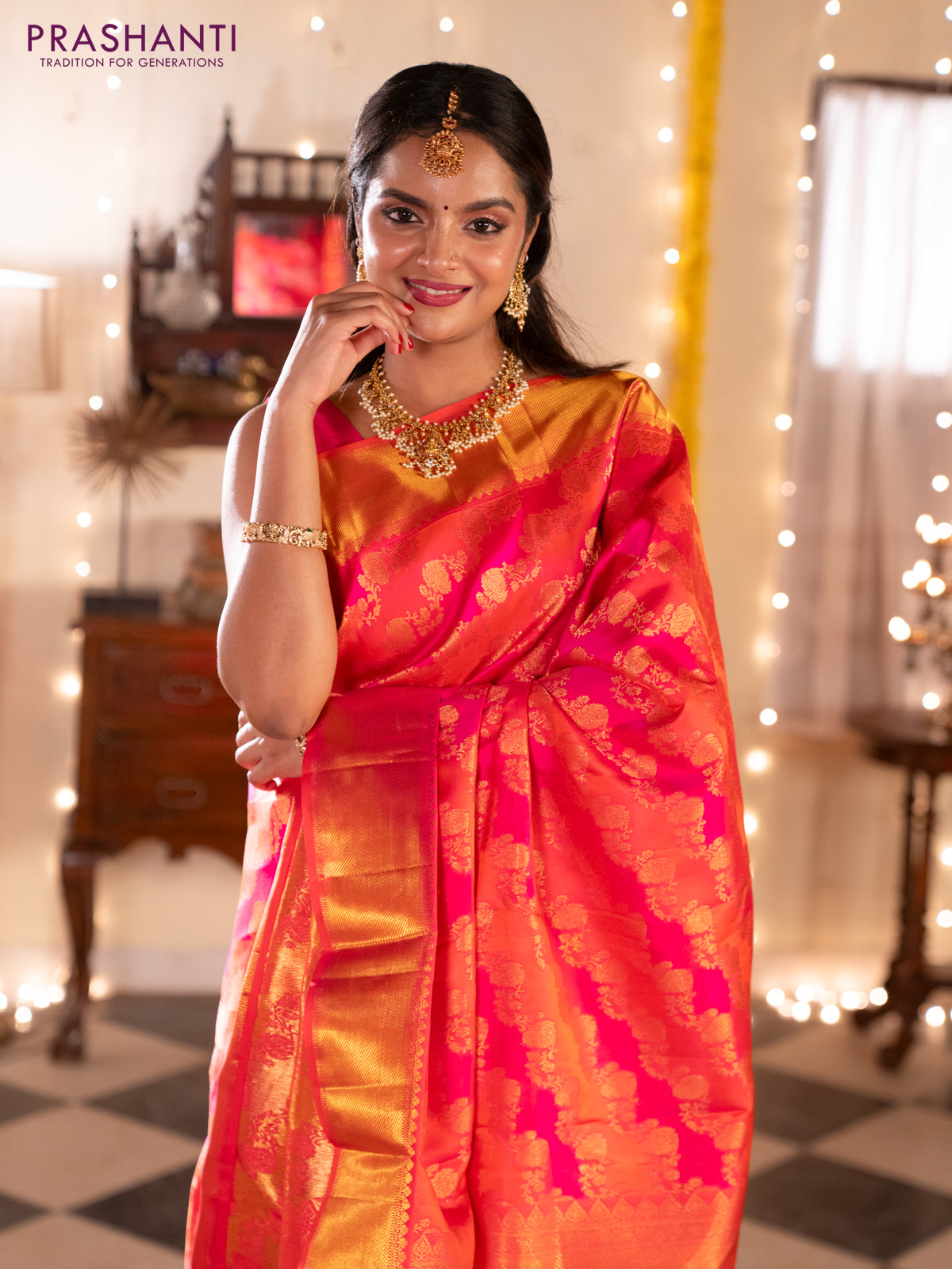 Pure kanchipuram silk saree pink and orange with allover zari woven stripes pattern and zari woven border