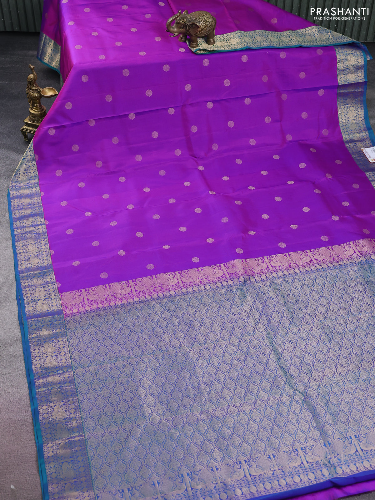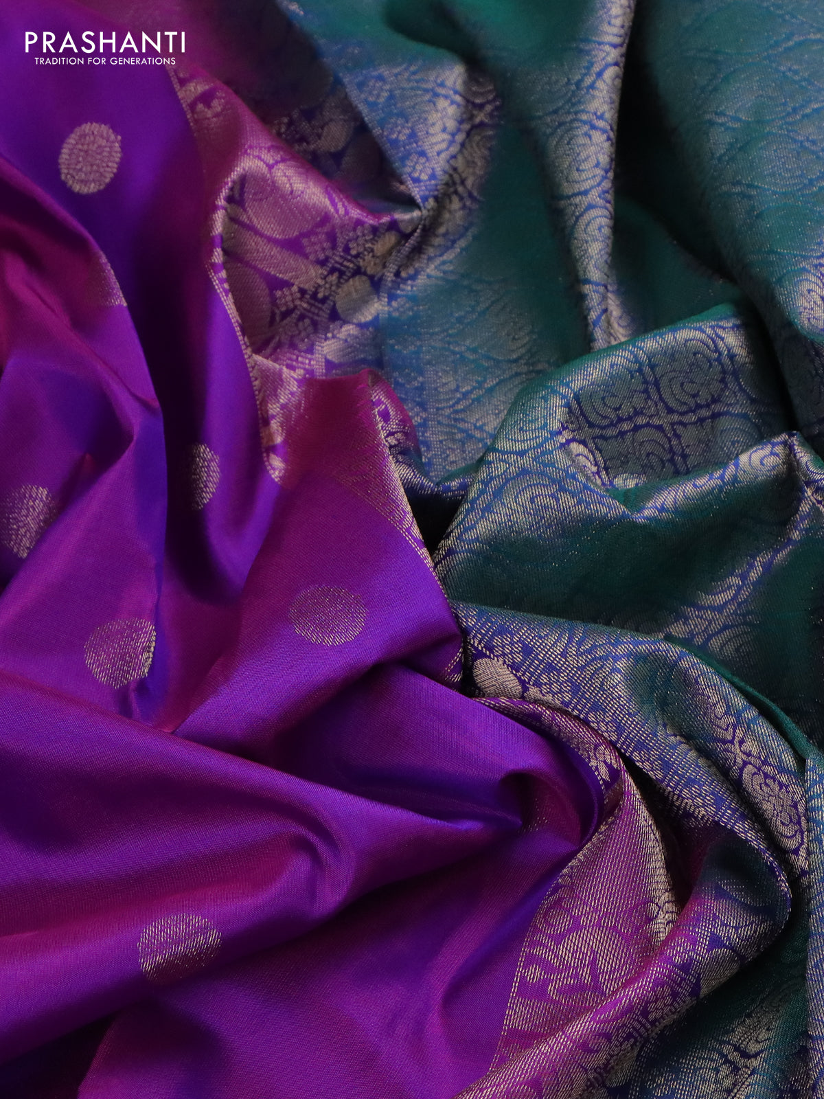 Pure kanchipuram silk saree purple and dual shade of teal green with zari woven buttas and annam zari woven border