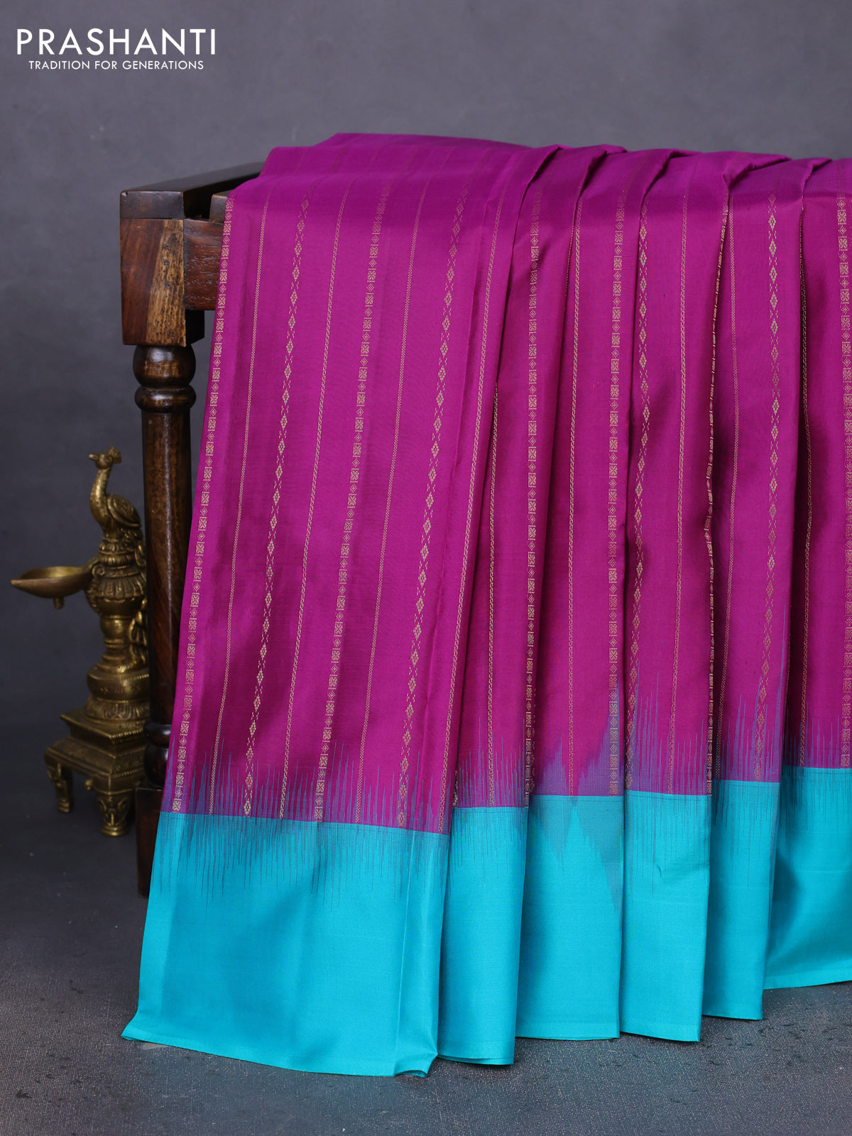 Pure kanchipuram silk saree purple and teal blue with allover stripes pattern and simple border