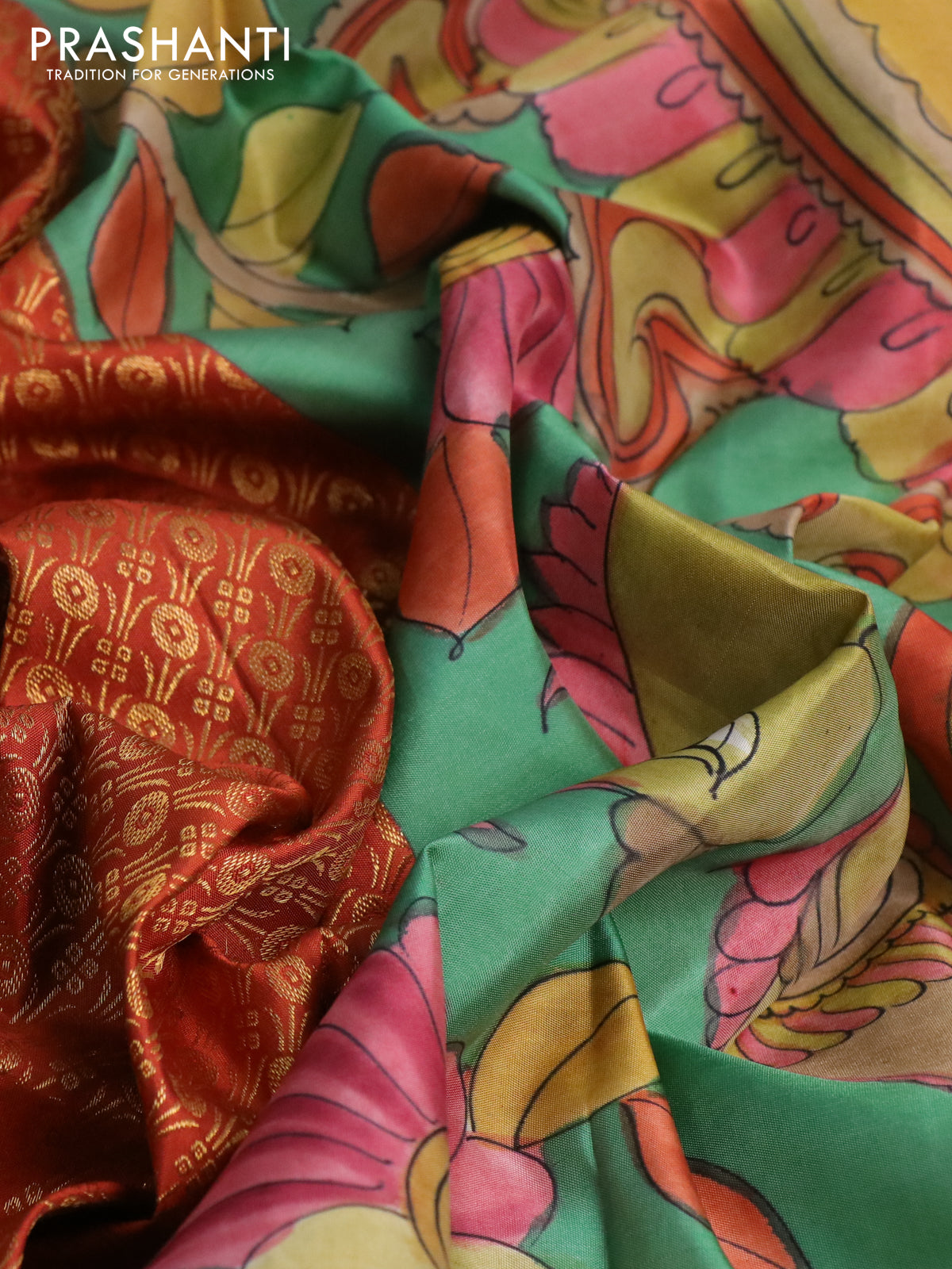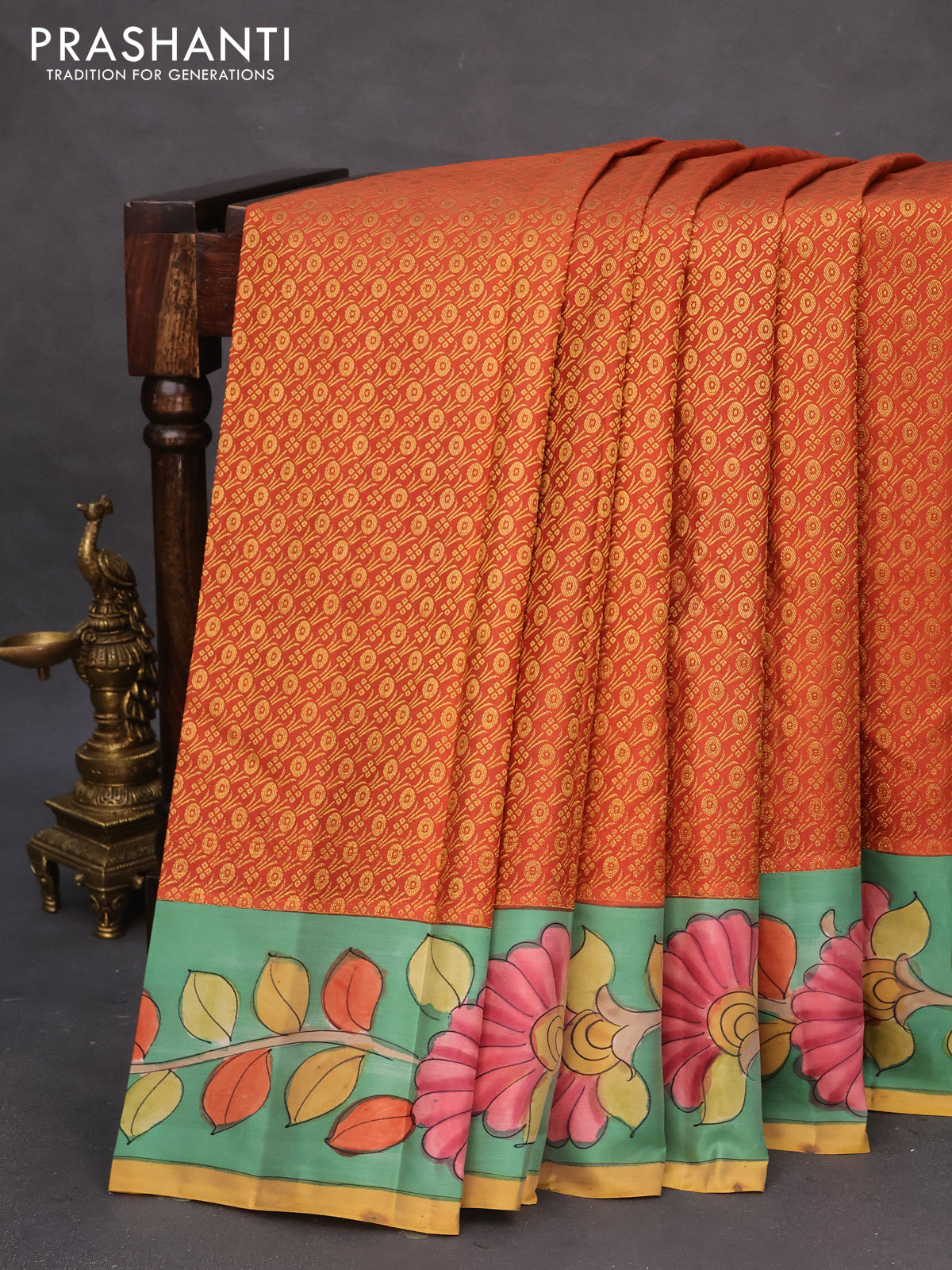 Pure kanchipuram silk saree rustic orange and teal blue shade with allover zari woven brocade weaves and kalamkari printed pallu & border