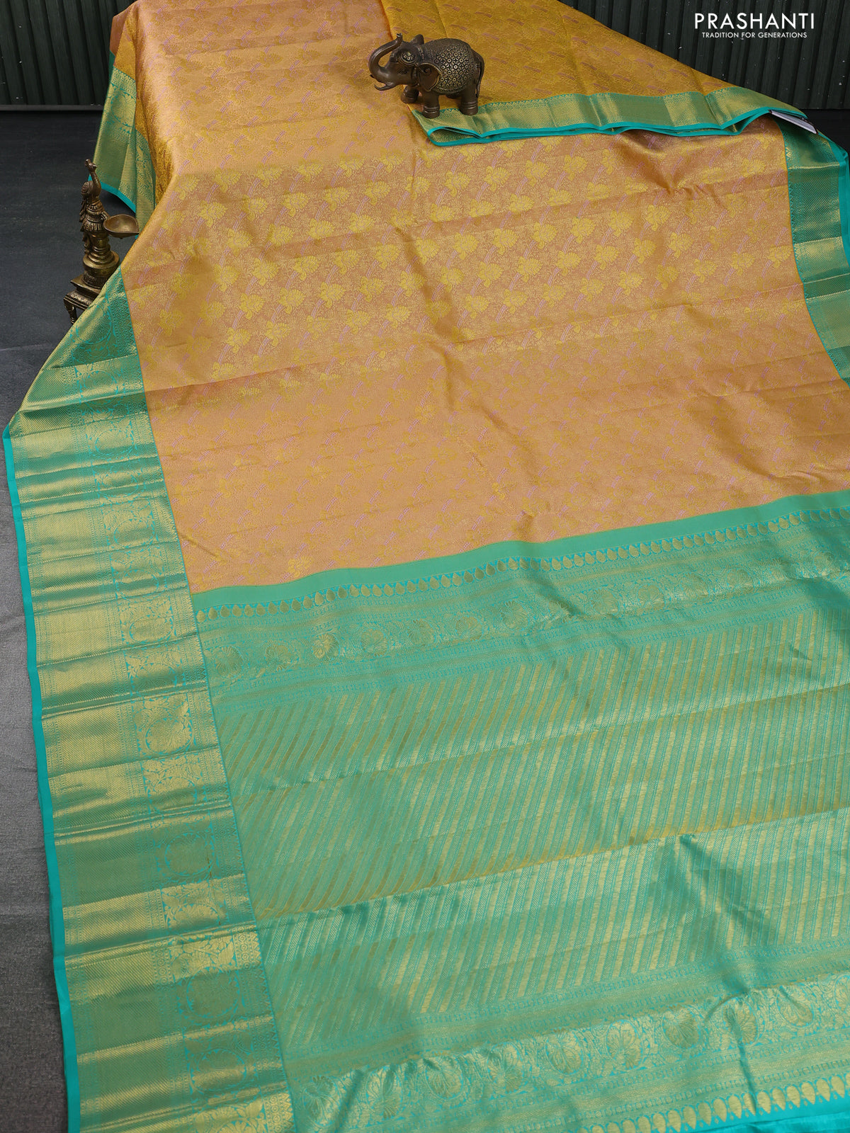 Pure kanchipuram silk saree sandal and teal green with allover zari woven brocade weaves and zari woven border