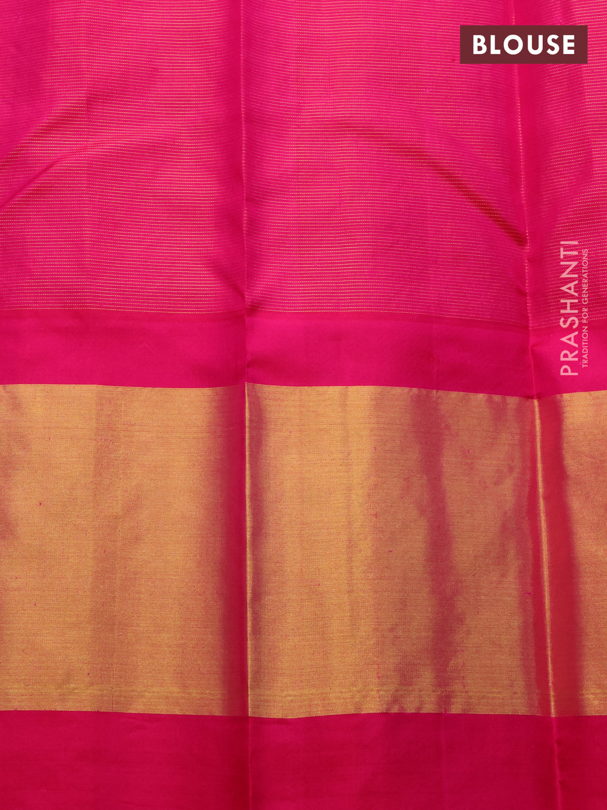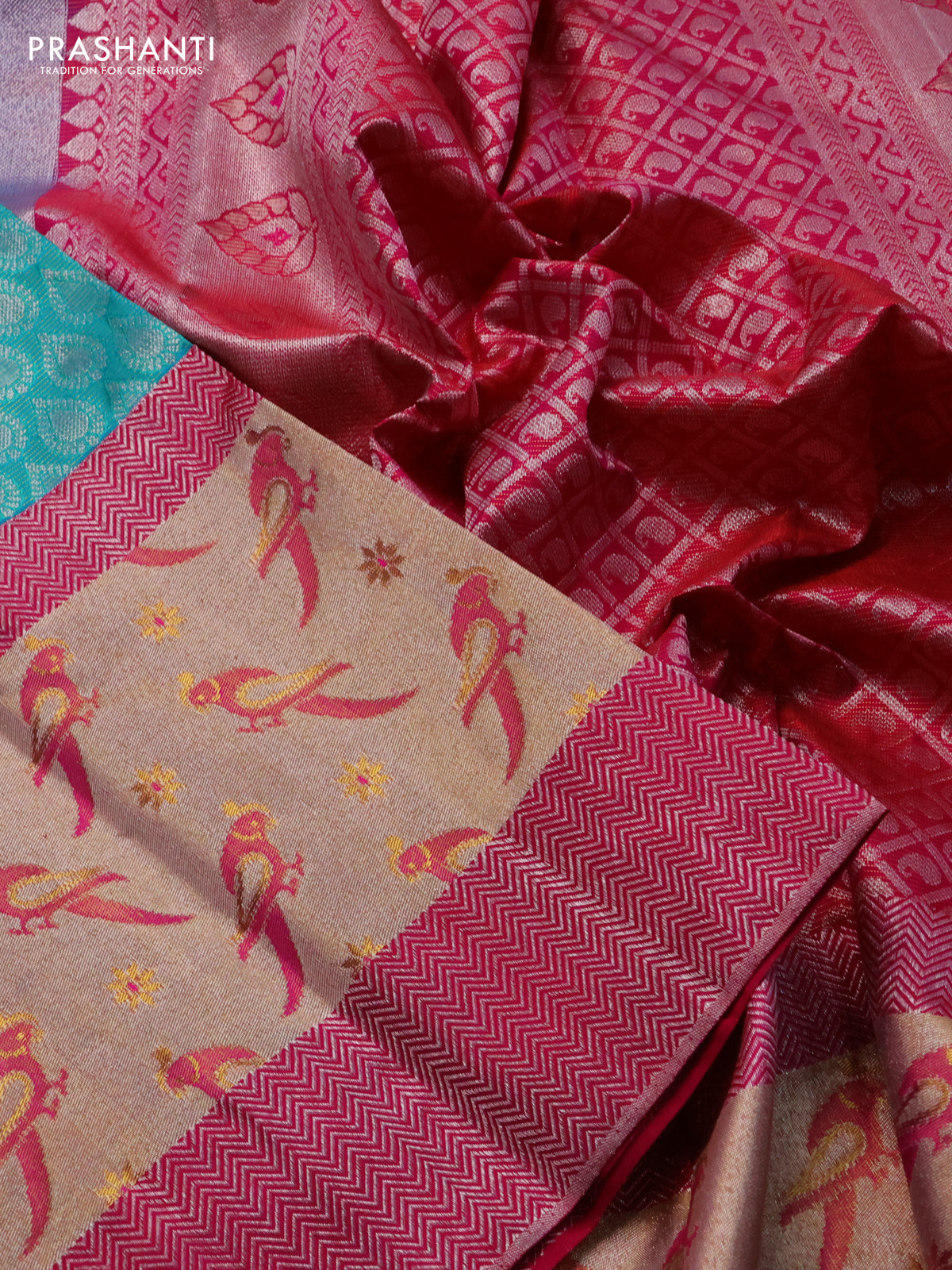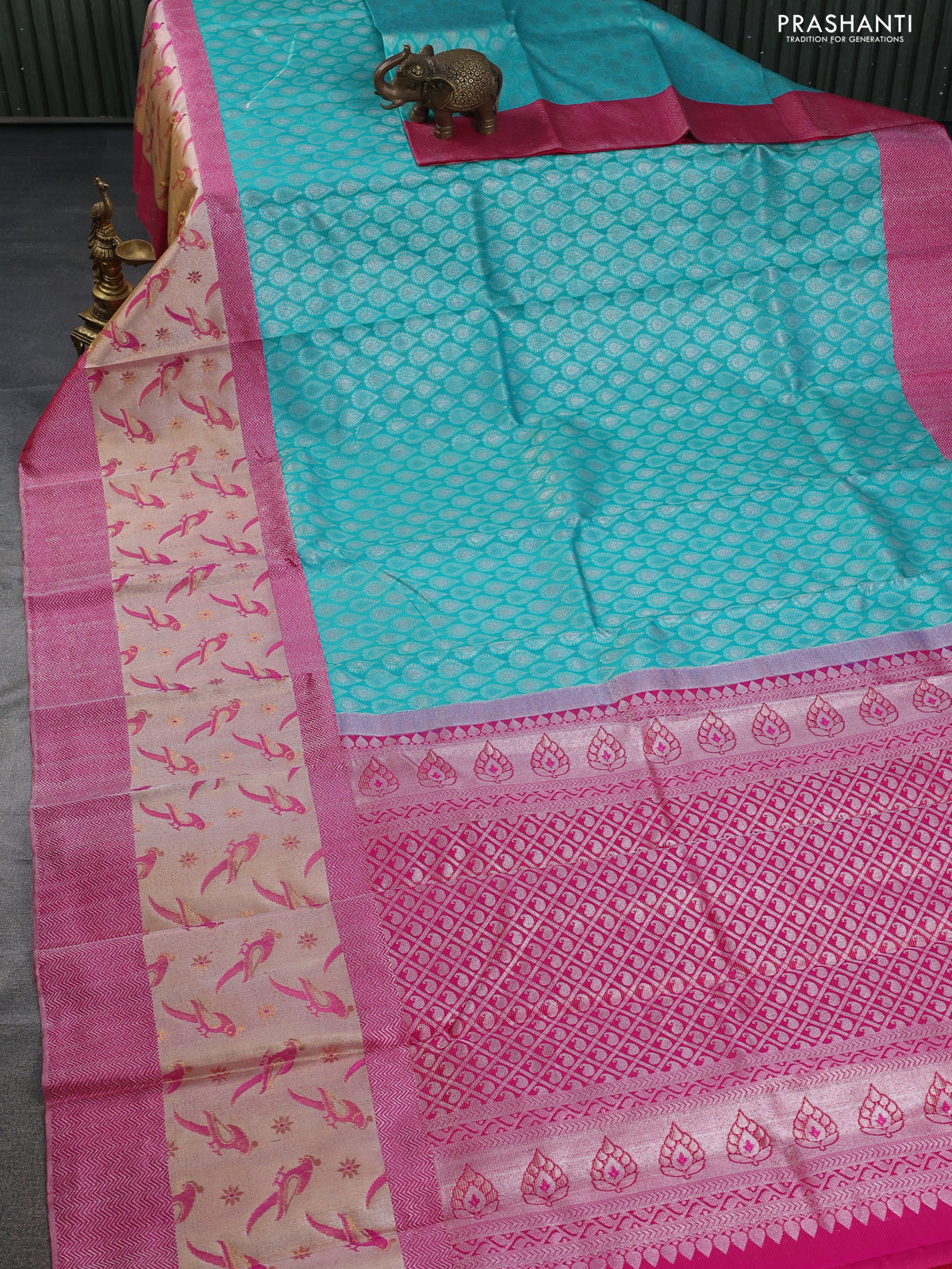 Pure kanchipuram silk saree teal blue and pink with silver zari woven buttas and long rich zari woven border