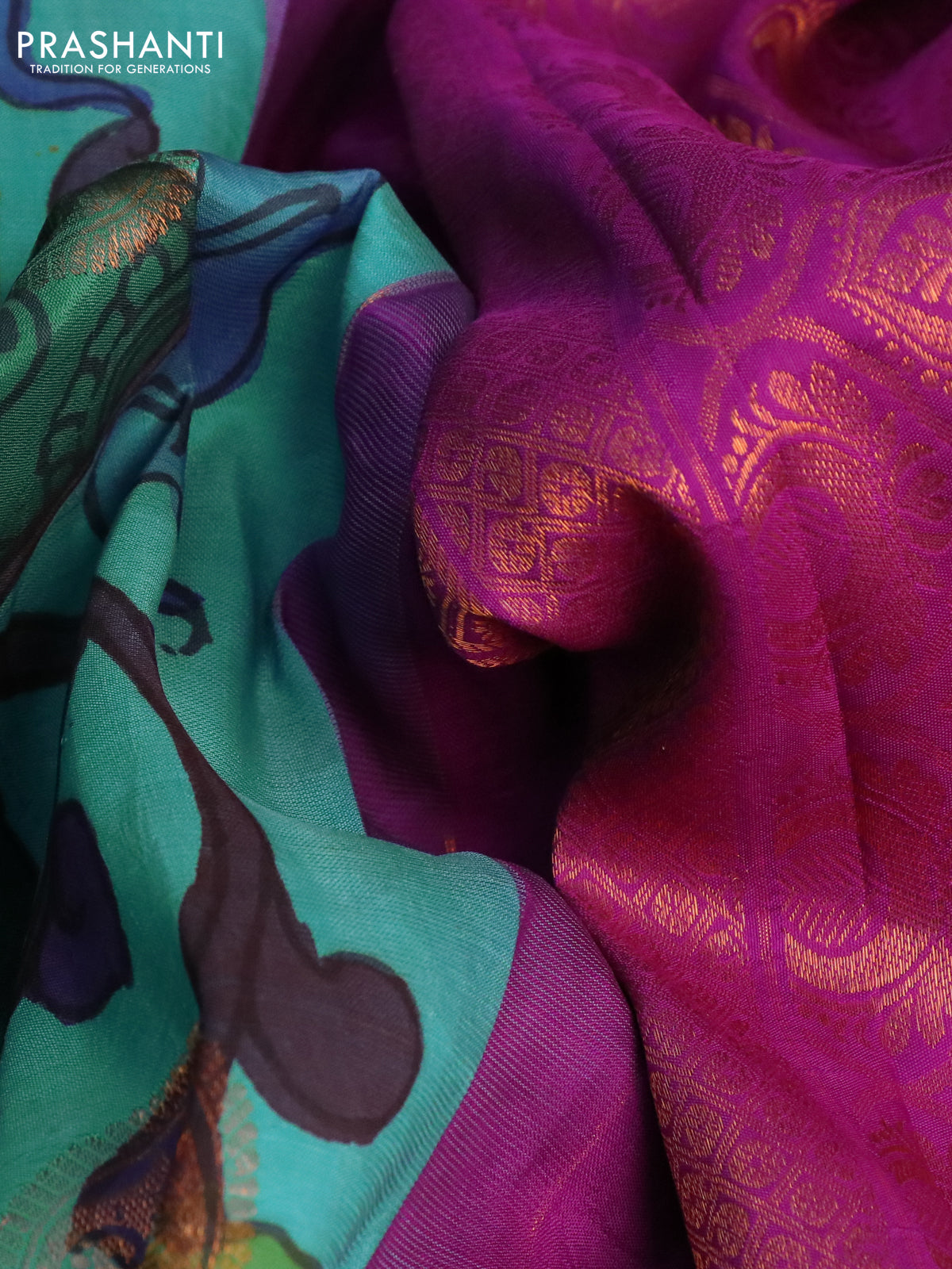 Pure kanchipuram silk saree teal blue and purple with allover pen kalamkari prints & zari buttas and copper zari woven border