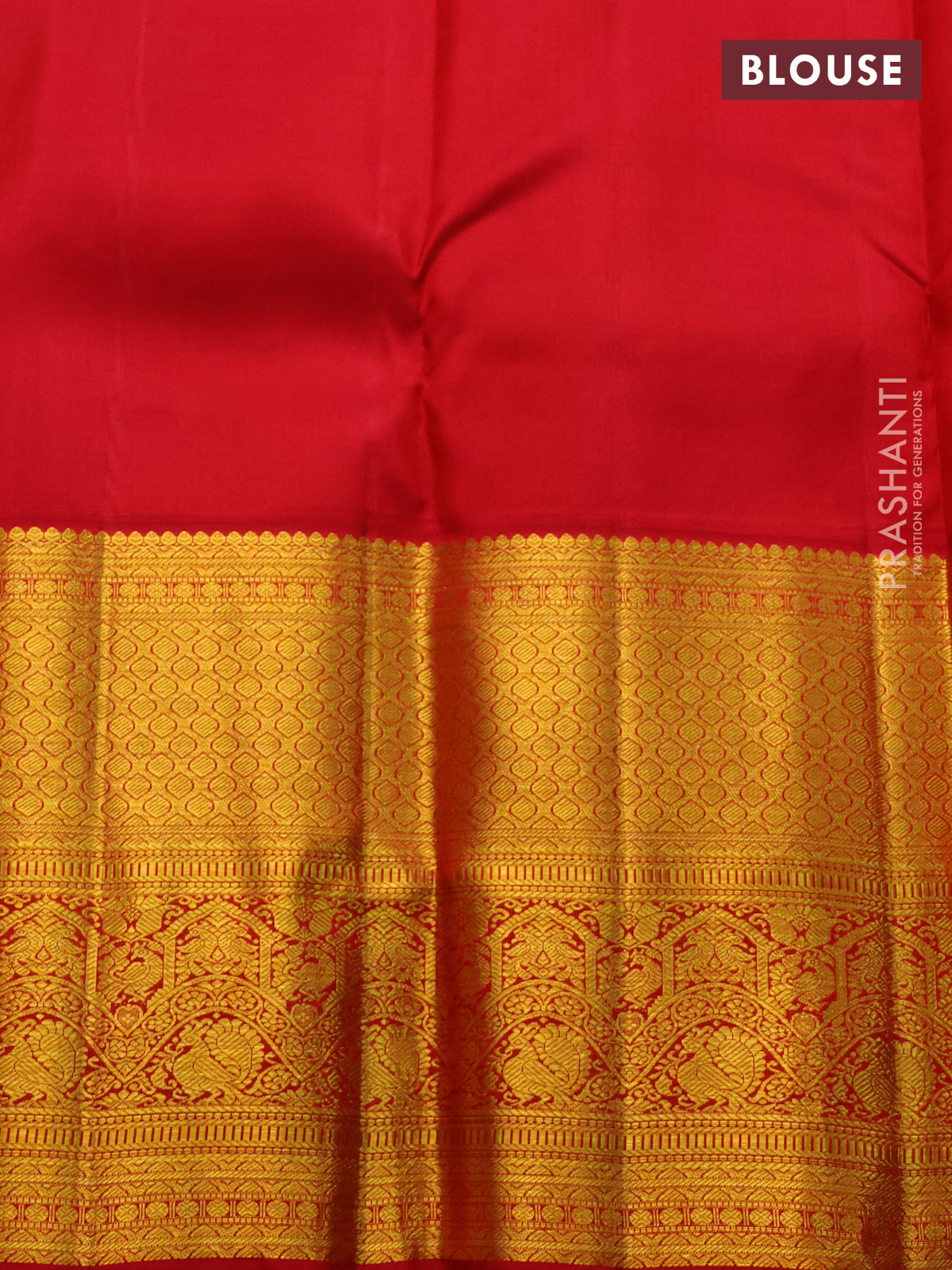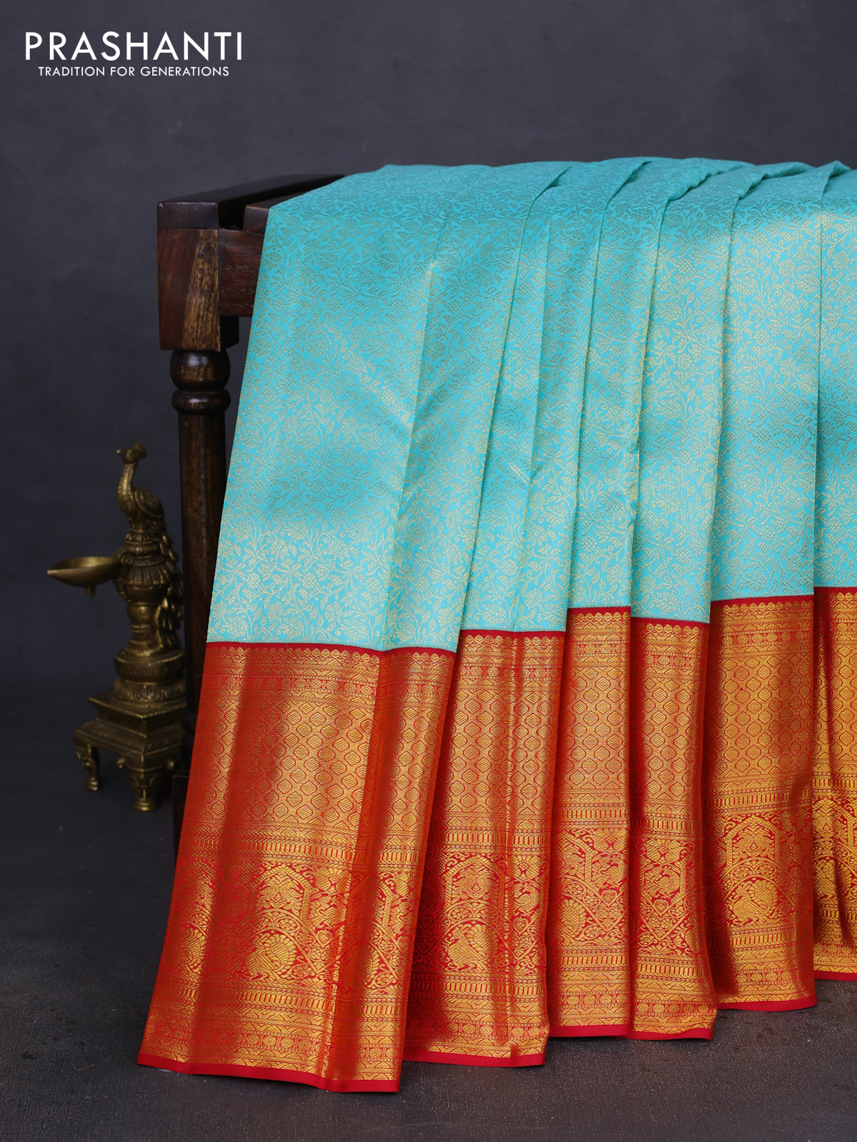 Pure kanchipuram silk saree teal blue and red with allover zari woven brocade weaves and long zari woven border