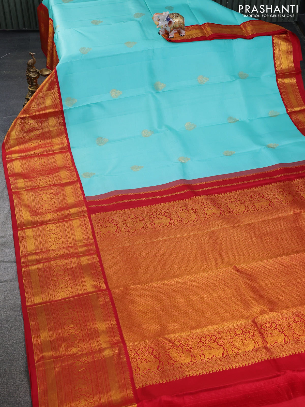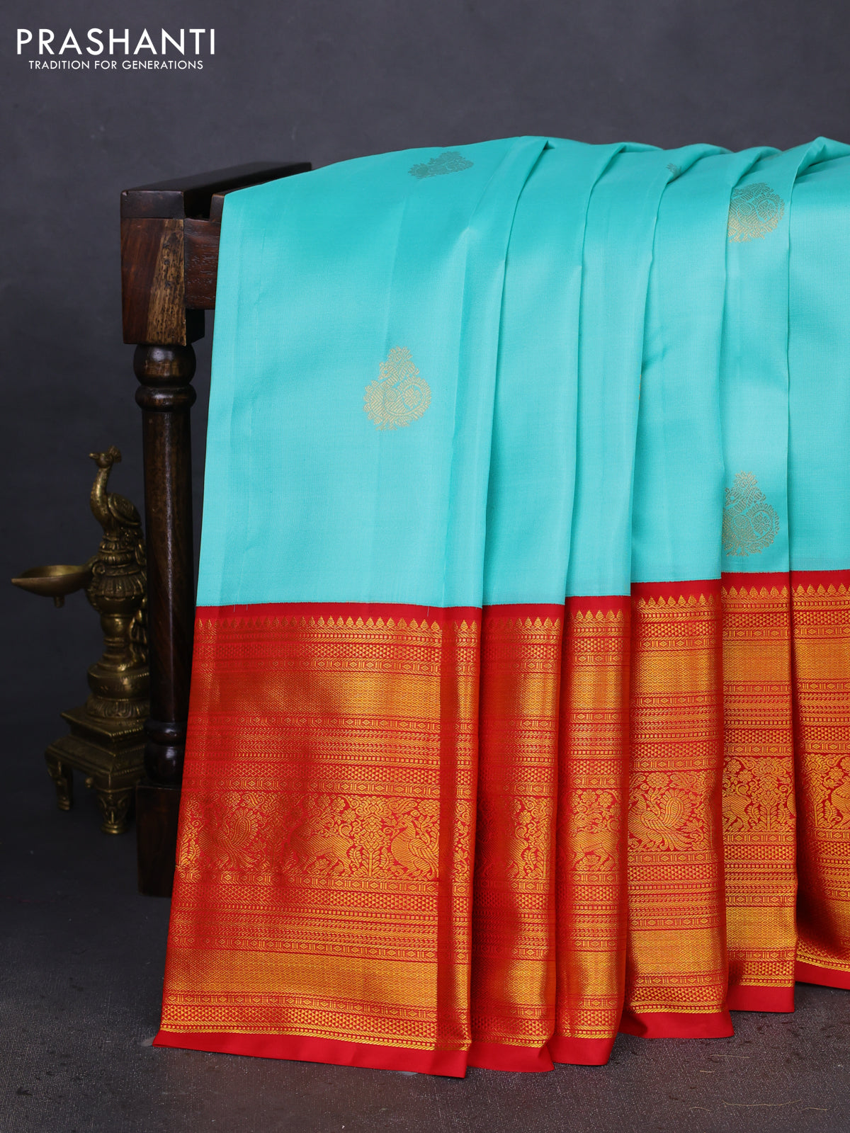 Pure kanchipuram silk saree teal blue and red with zari woven buttas and long zari woven korvai border