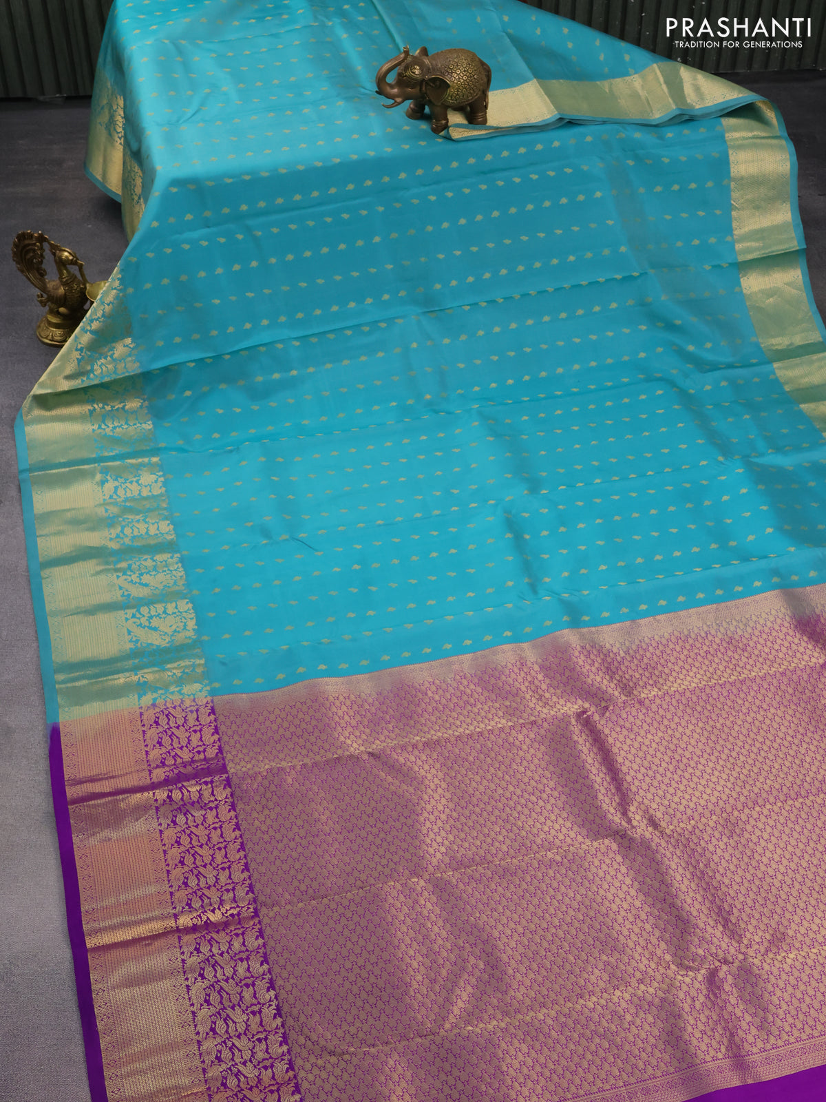 Pure kanchipuram silk saree teal blue and violet with allover zari woven buttas and rich zari woven border