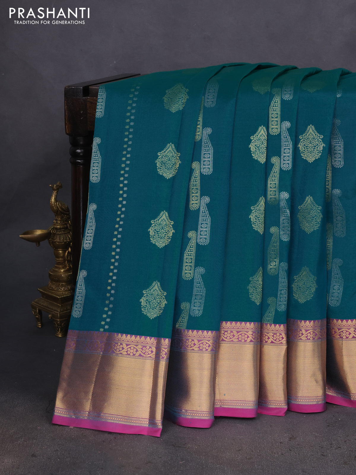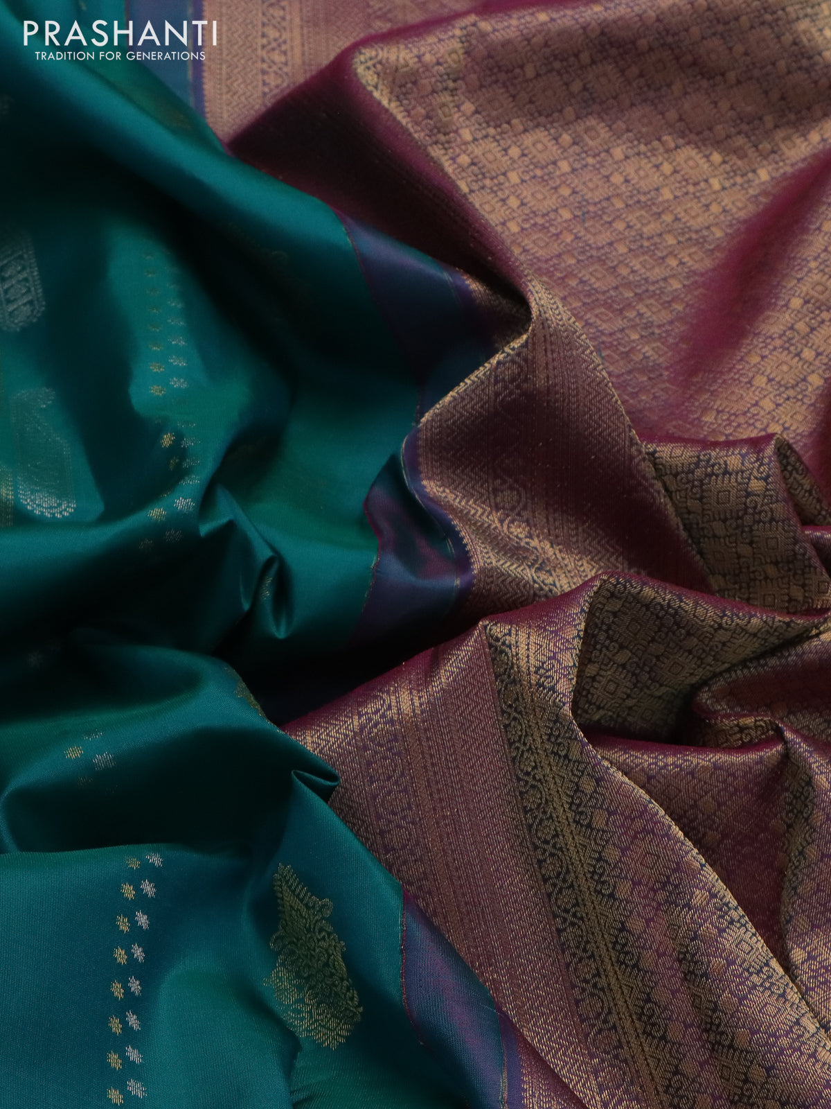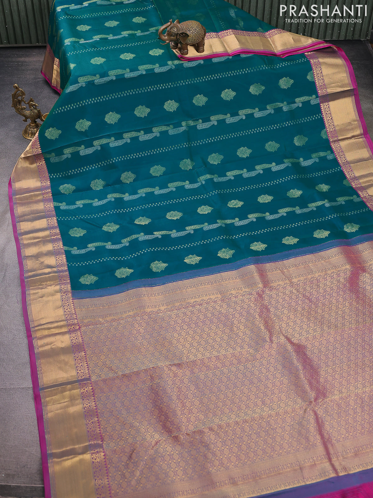 Pure kanchipuram silk saree teal green and pink with alover silver & gold zari weaves & buttas and rich zari woven border