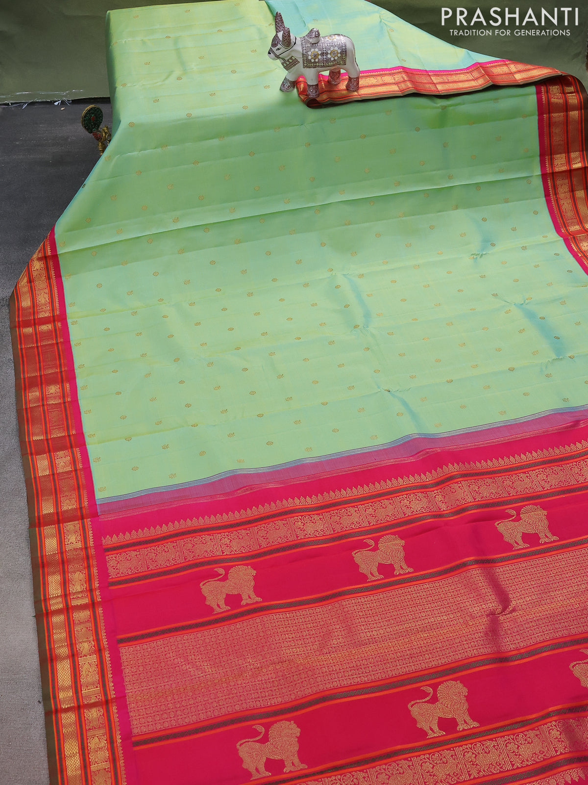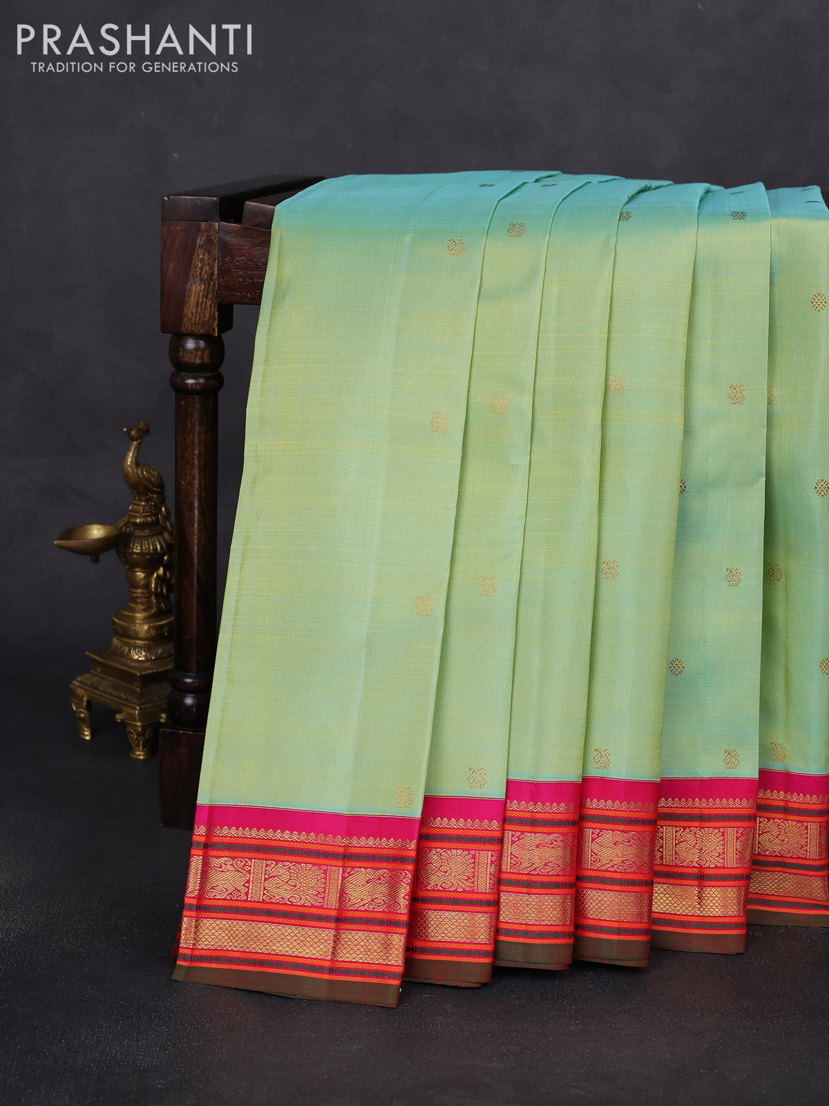 Pure kanchipuram silk saree teal green shade and pink with zari woven buttas and zari woven korvai border