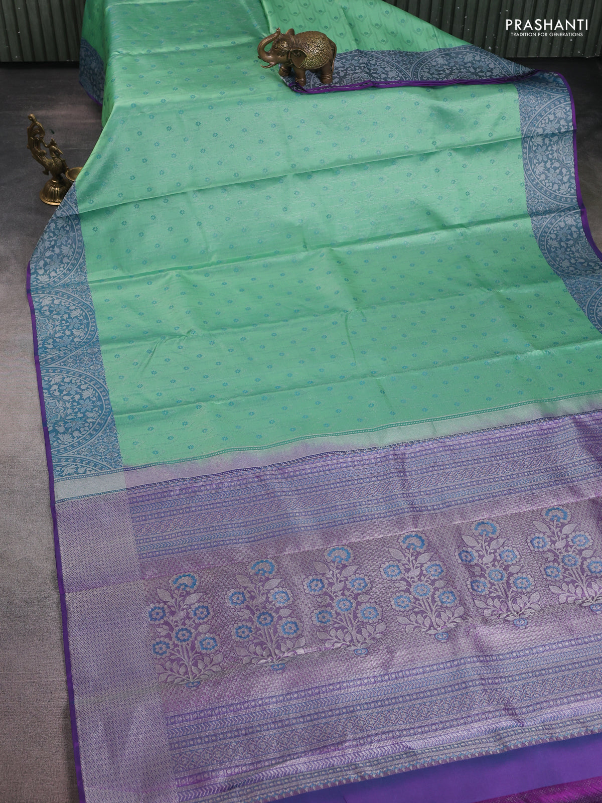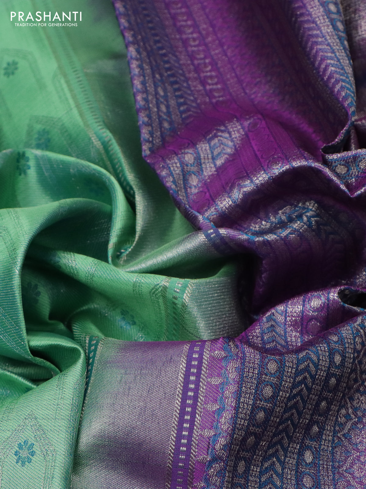 Pure kanchipuram silk saree teal shade and purple with allover silver zari weaves and rich zari woven border