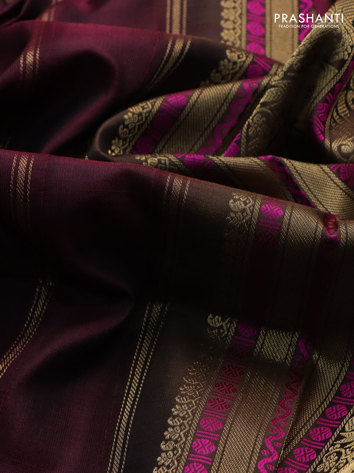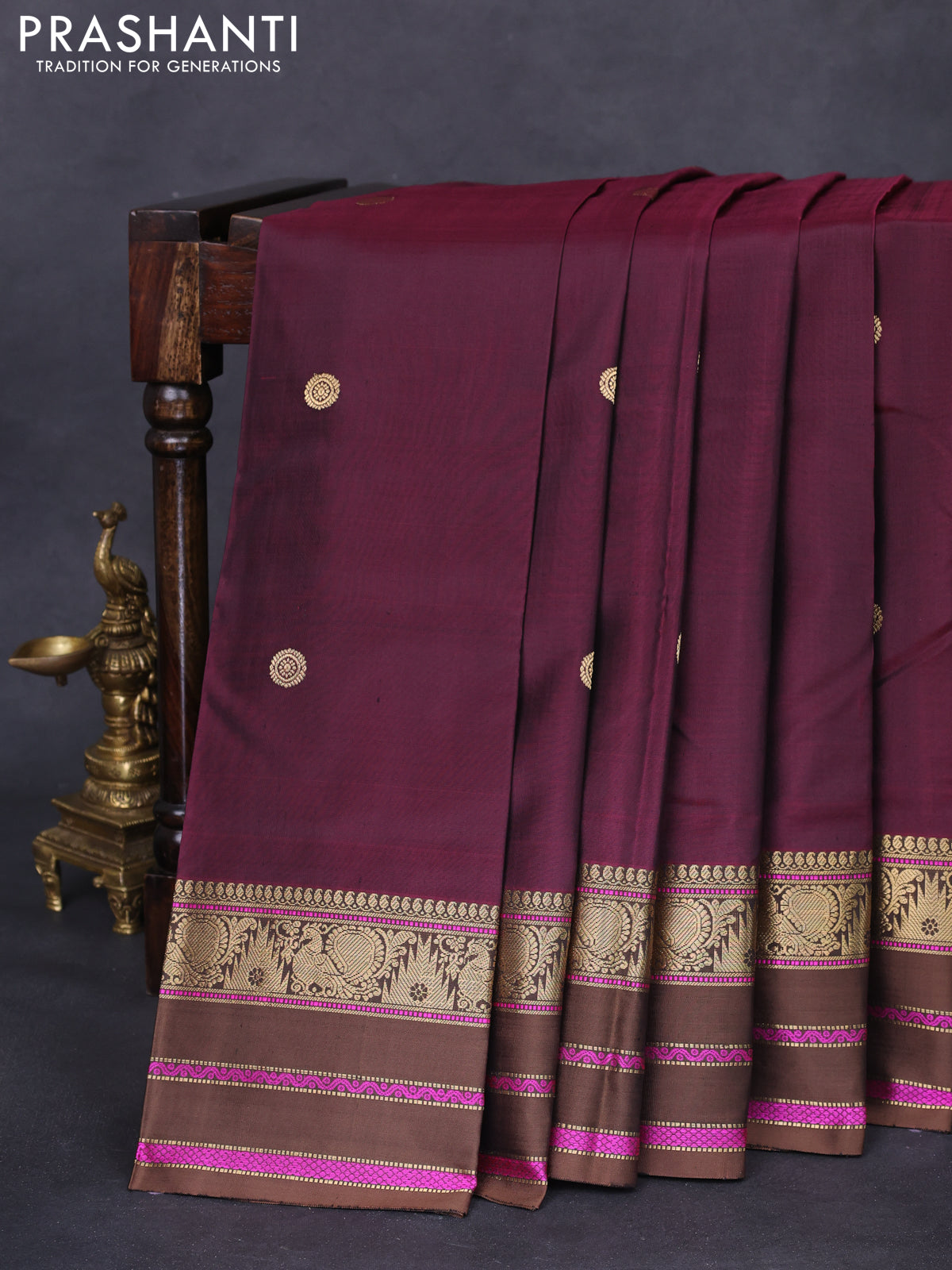Pure kanchipuram silk saree wine shade and brown with zari woven buttas and annam & temple design zari border