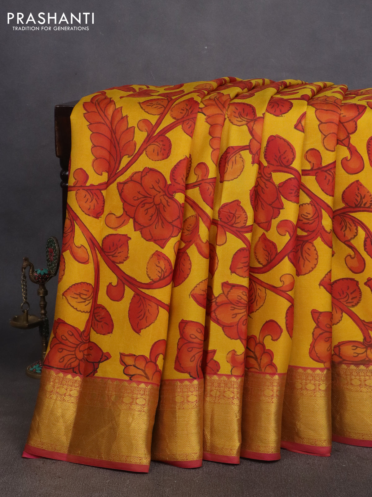 Pure kanchipuram silk saree yellow and pink with allover pen kalamkari prints & zari buttas and zari woven border