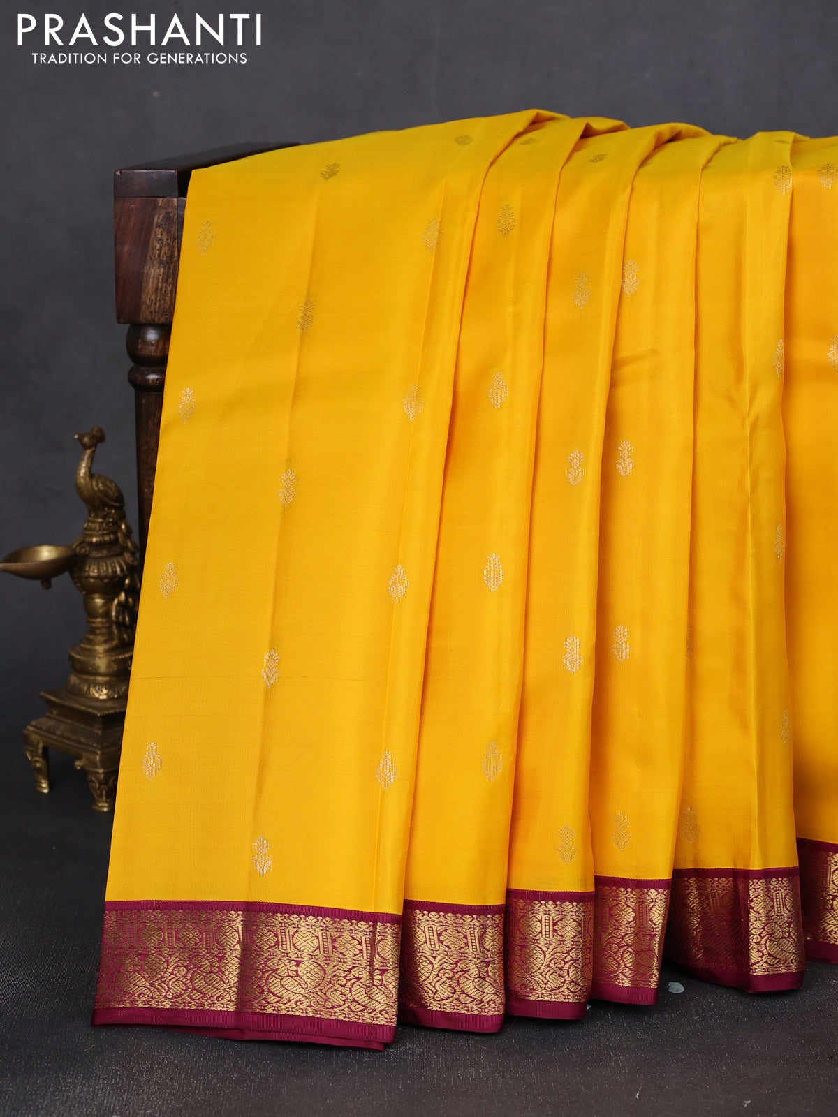 Pure kanchipuram silk saree yellow and wine shade with zari woven buttas and zari woven korvai border
