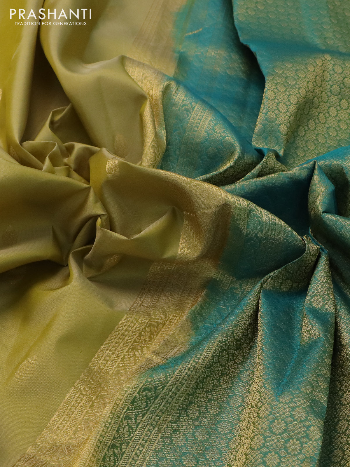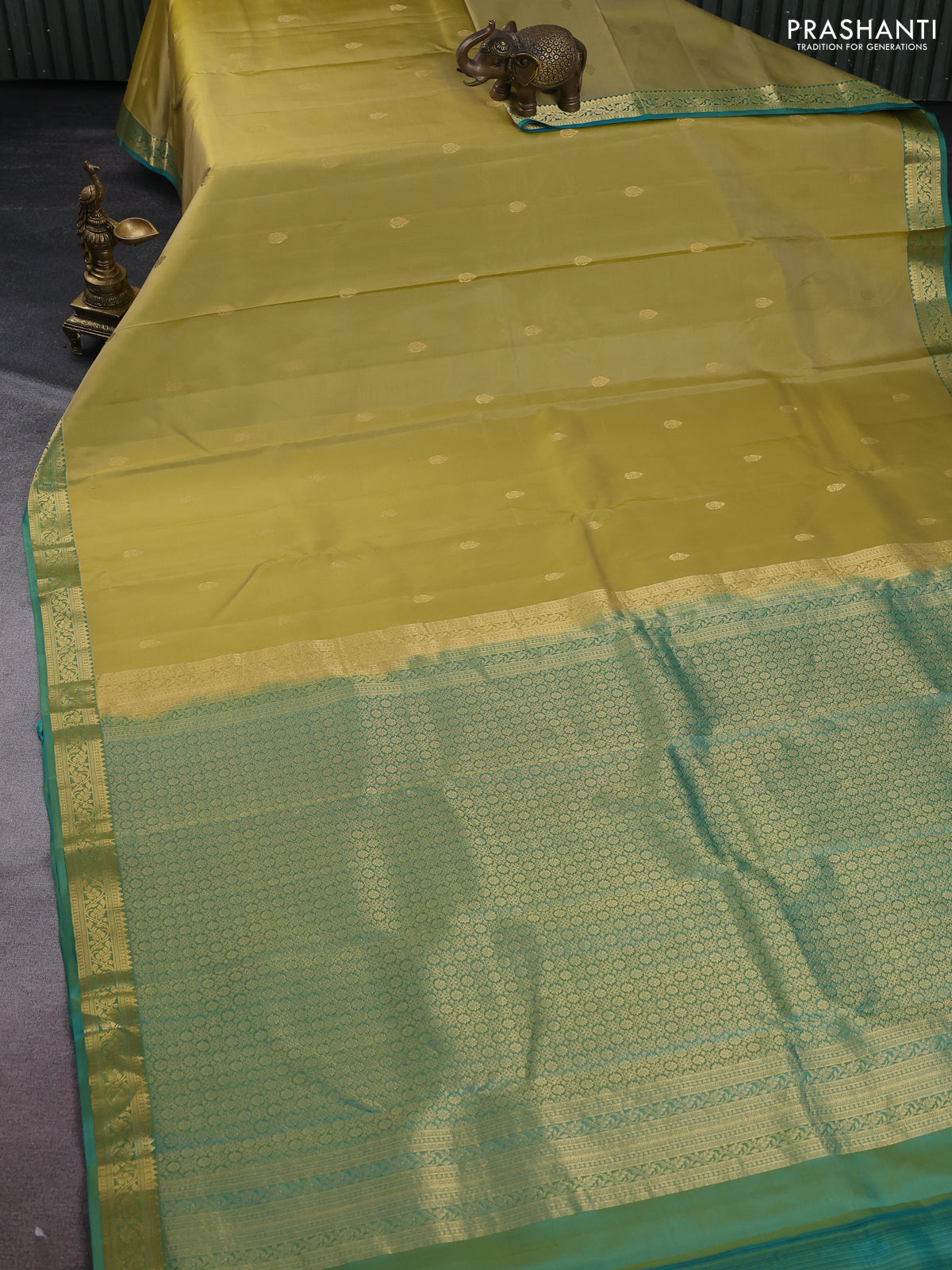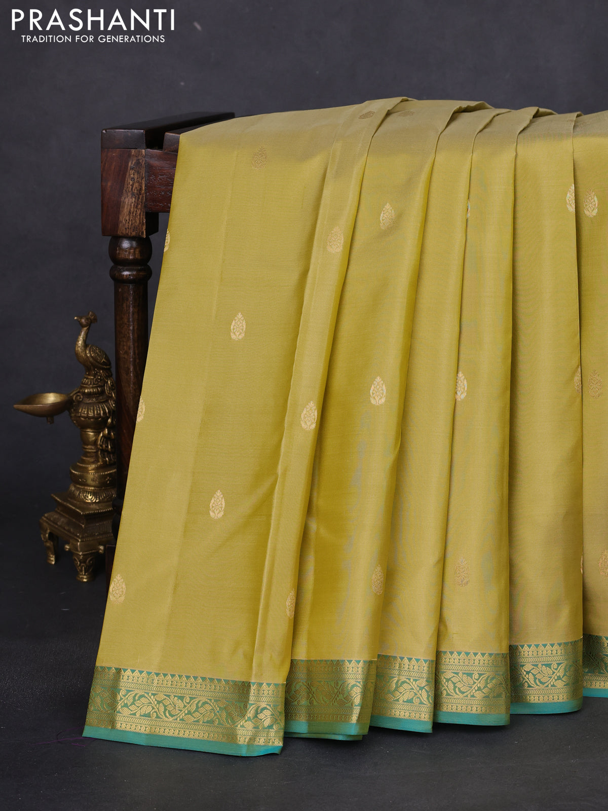 Pure kanchipuram silk saree yellow shade and teal green with zari woven buttas and zari woven border