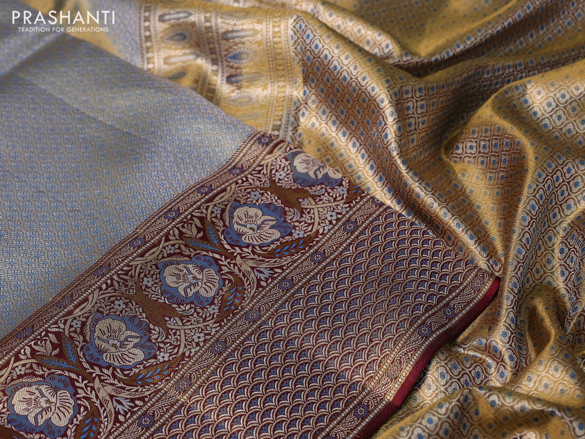Pure Kanchipuram tissue silk saree dual shade of blue and deep maroon with allover zari woven brocade weaves and long zari woven mina border