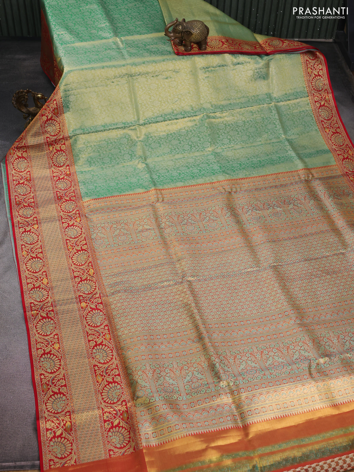 Pure Kanchipuram tissue silk saree dual shade of teal and red with allover silver zari woven brocade weaves and long zari woven border