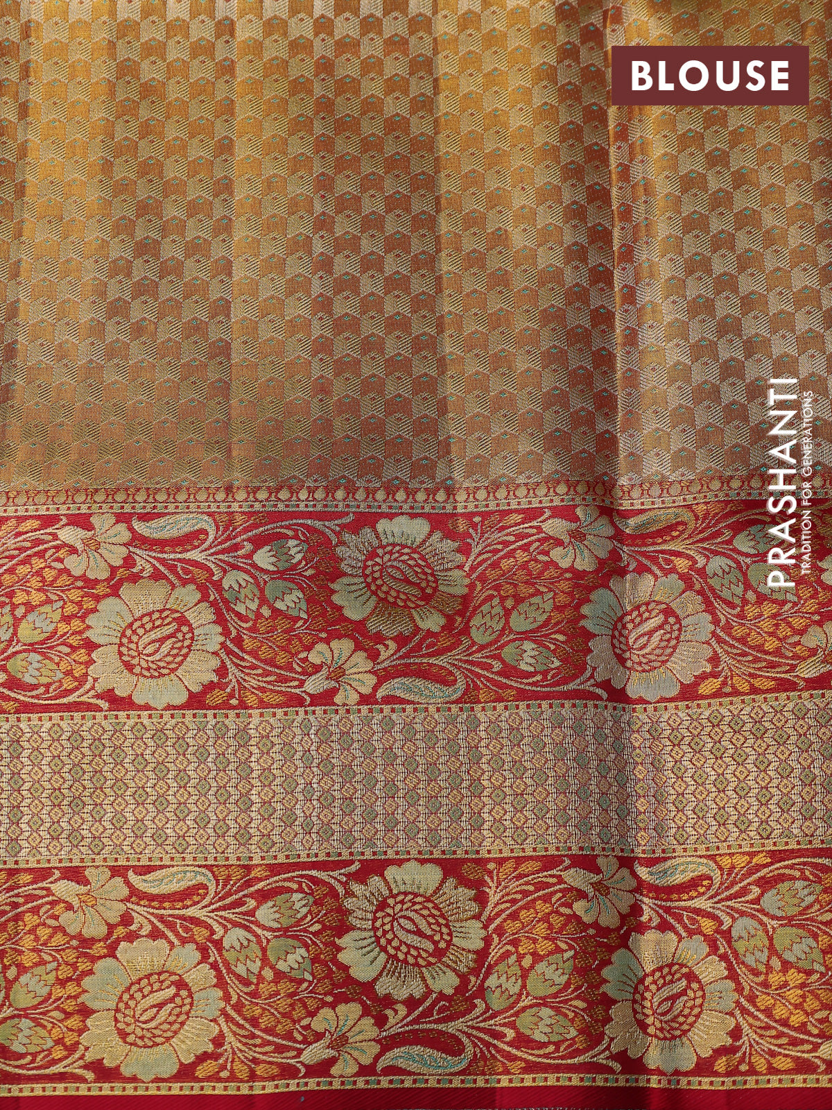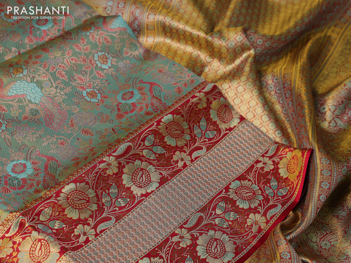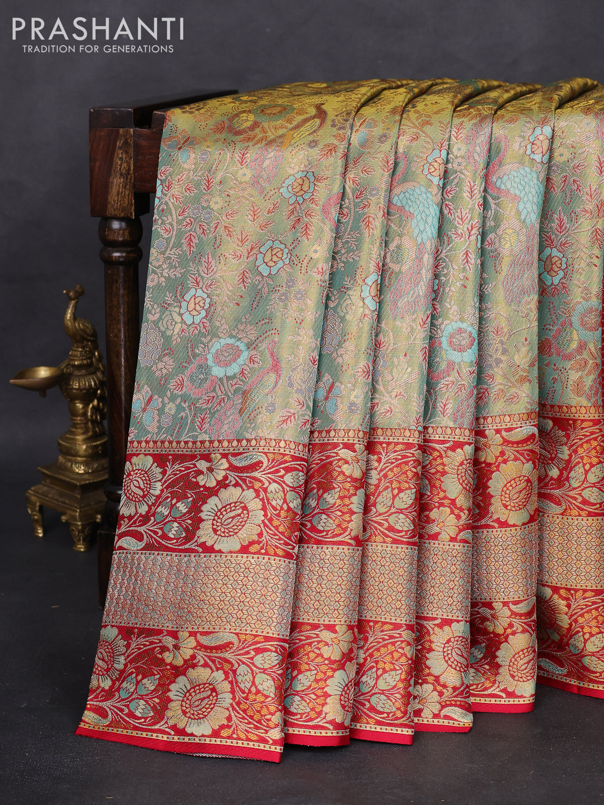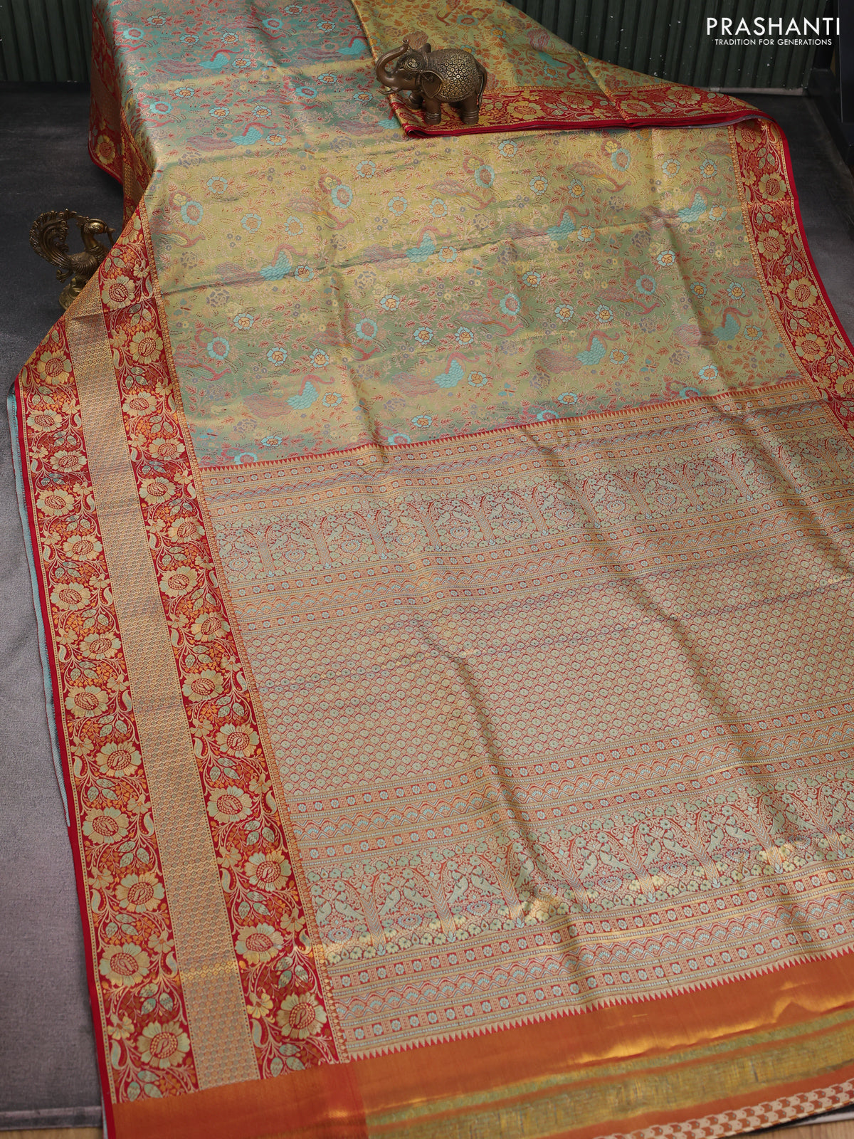 Pure Kanchipuram tissue silk saree dual shade of teal and red with allover zari woven peacock brocade weaves and long zari woven mina border