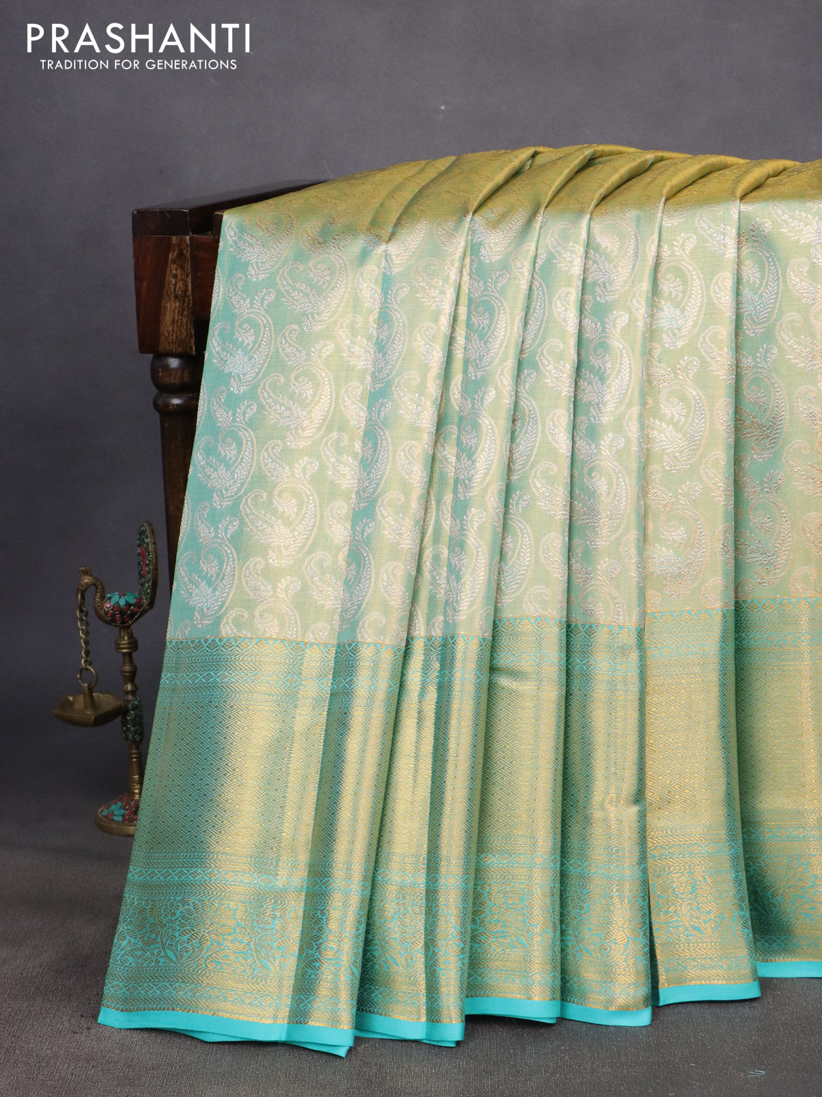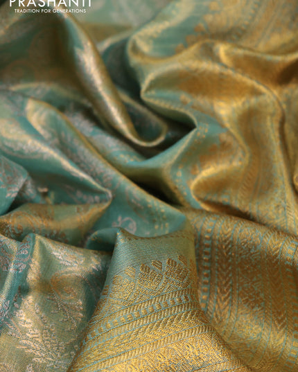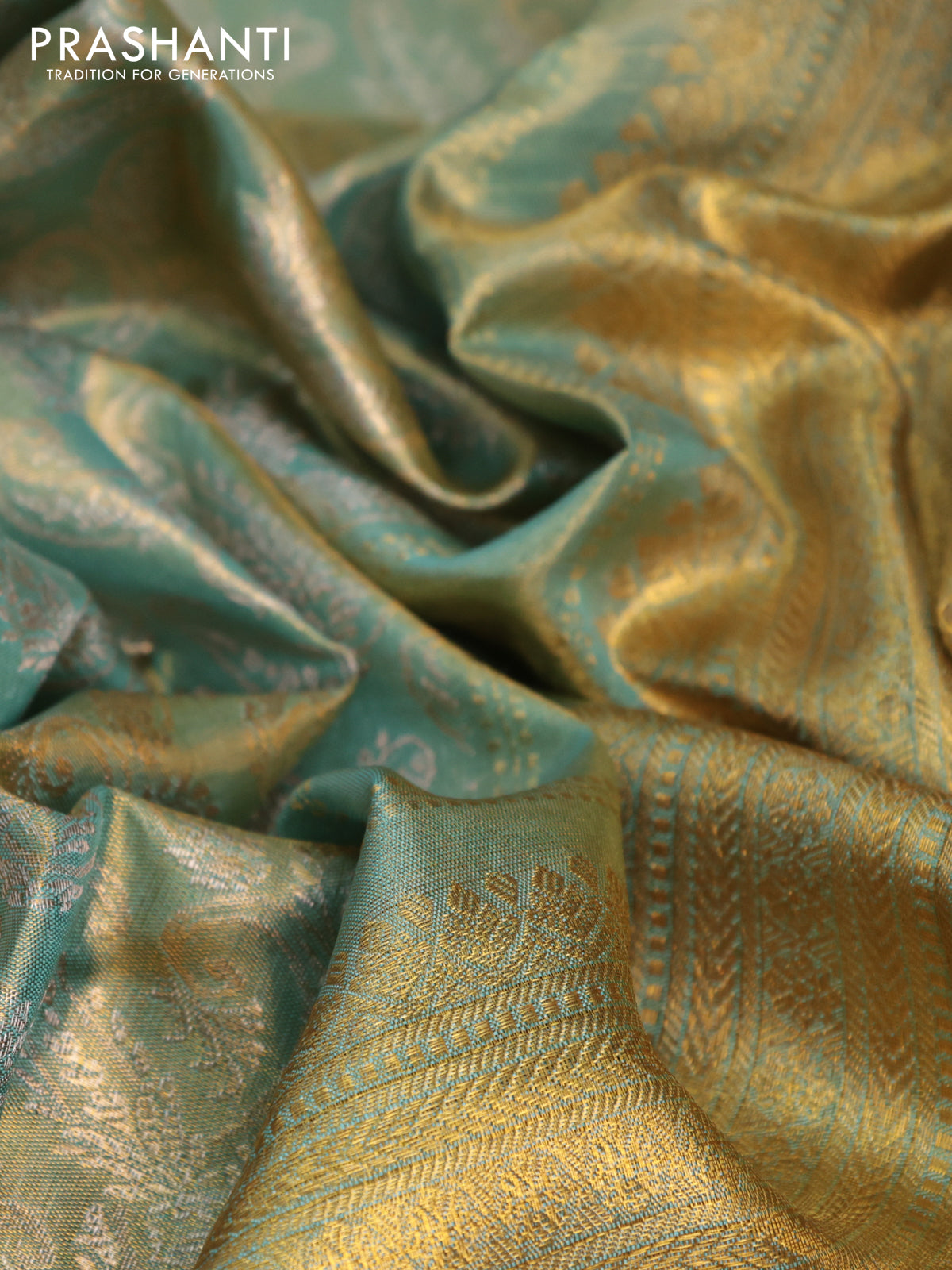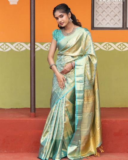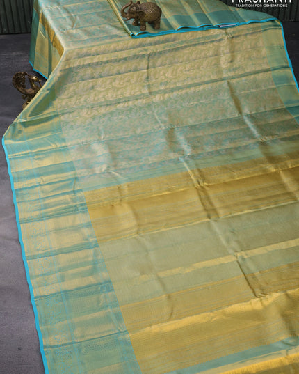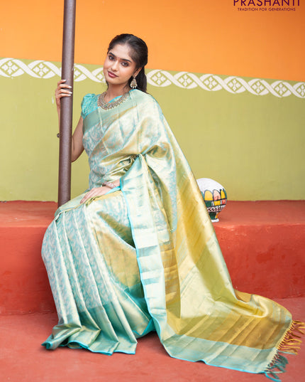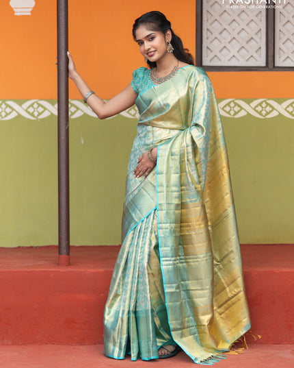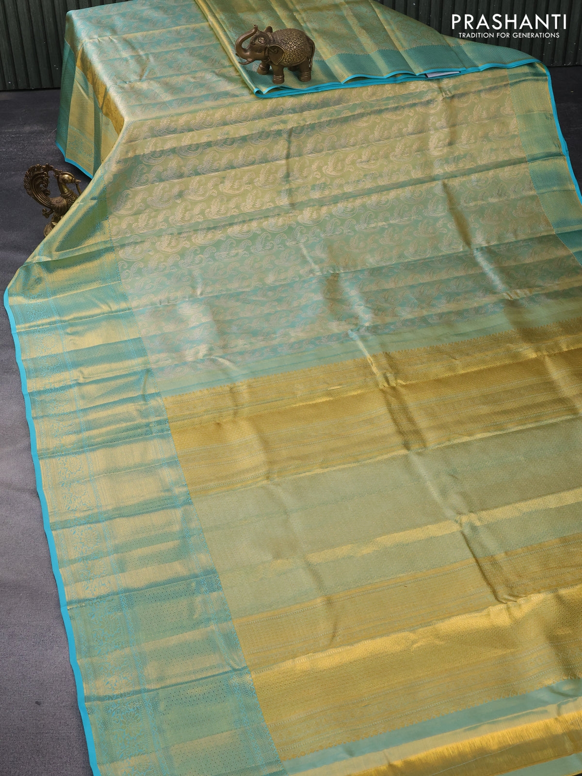 Pure kanchipuram tissue silk saree dual shade of teal blue with allover silver zari woven brocade weaves and long zari woven border