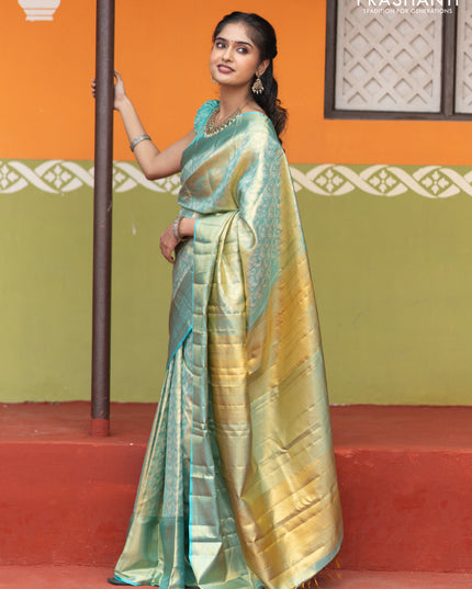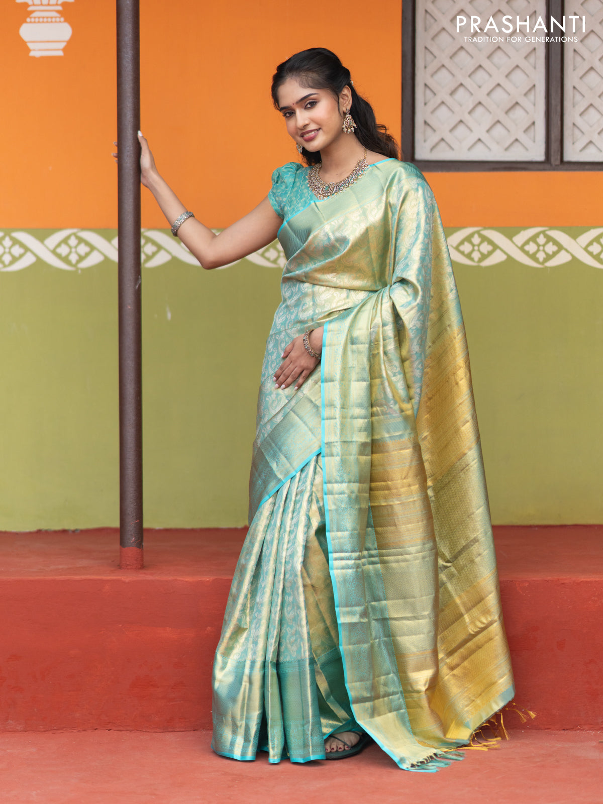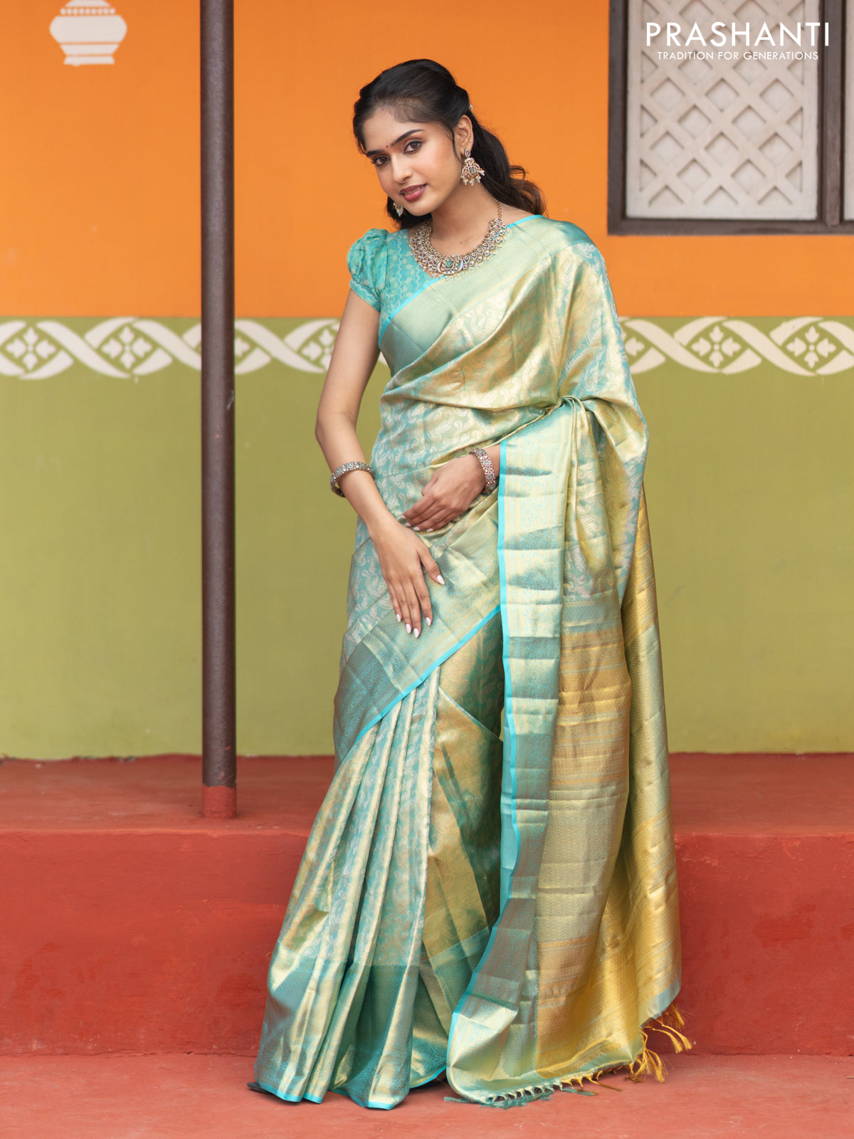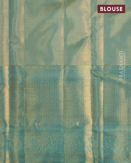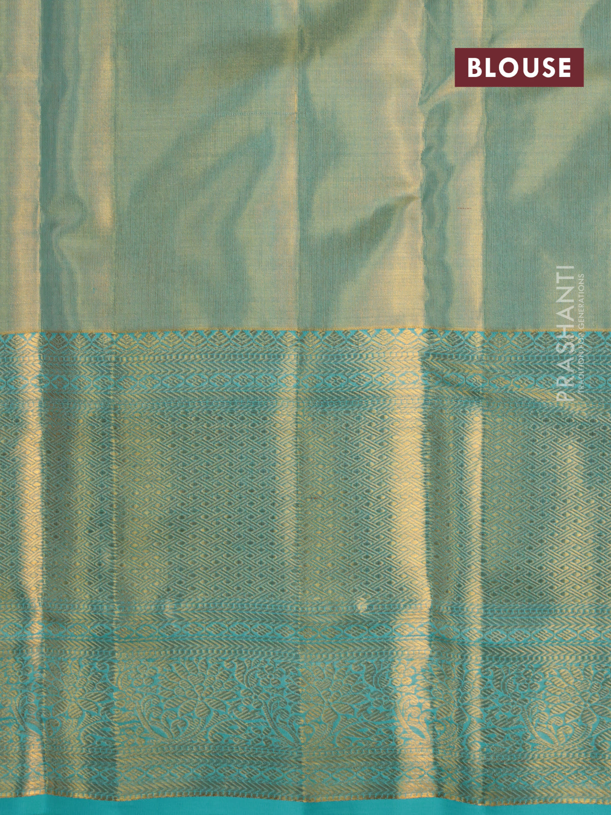 Pure kanchipuram tissue silk saree dual shade of teal blue with allover silver zari woven brocade weaves and long zari woven border