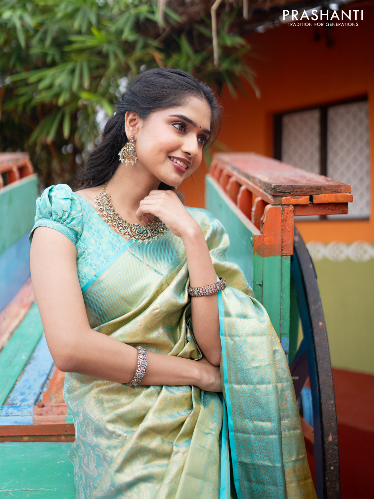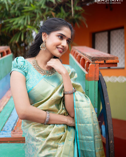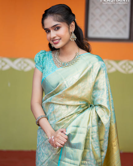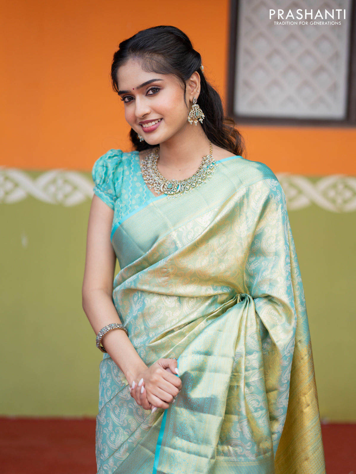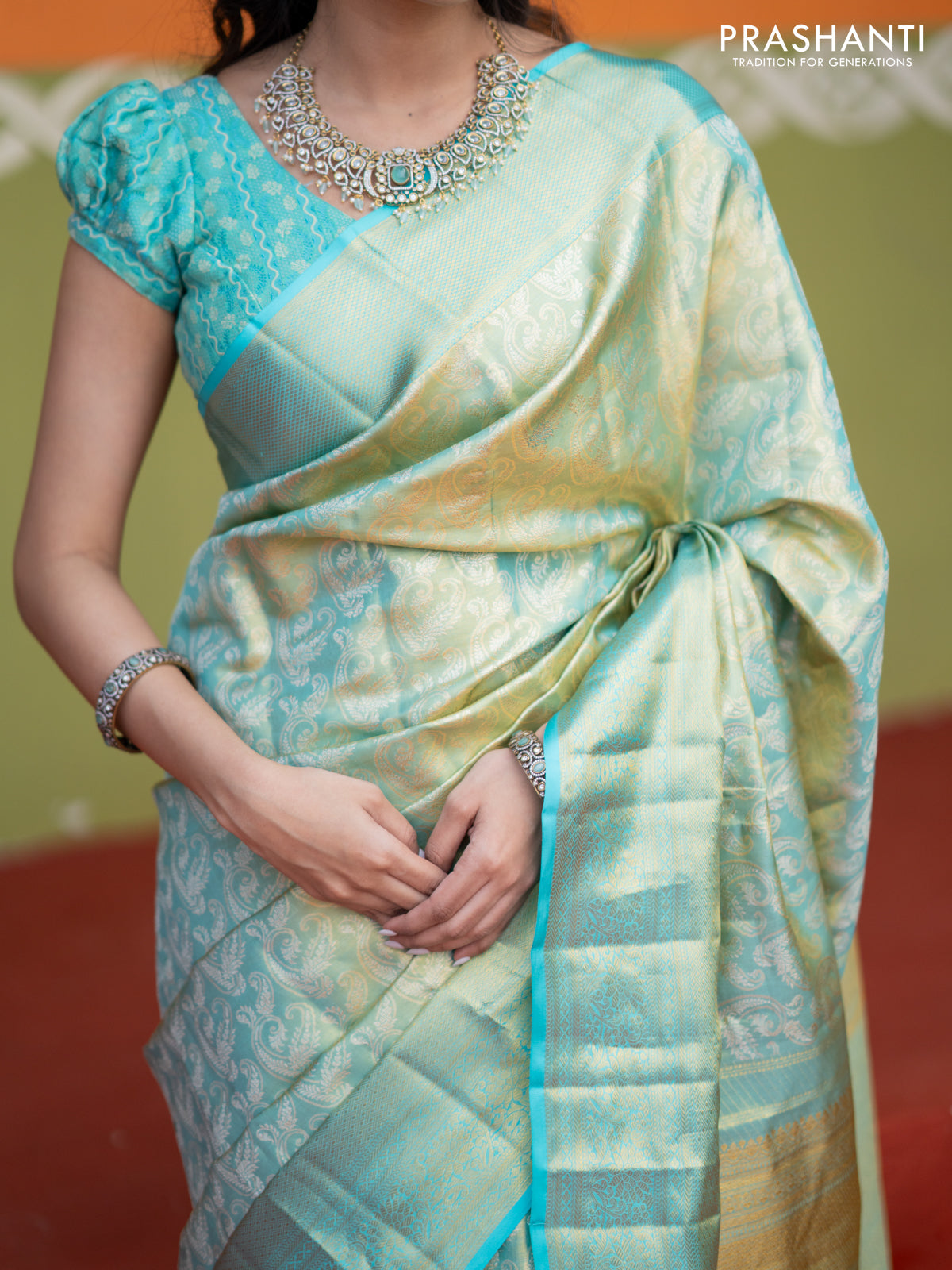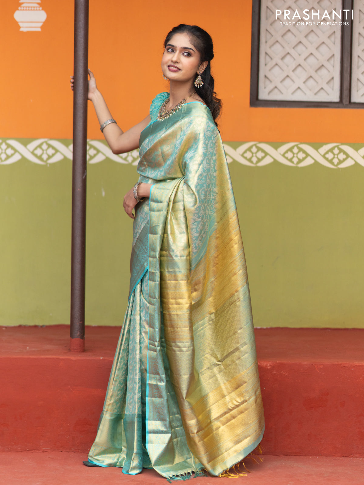 Pure kanchipuram tissue silk saree dual shade of teal blue with allover silver zari woven brocade weaves and long zari woven border