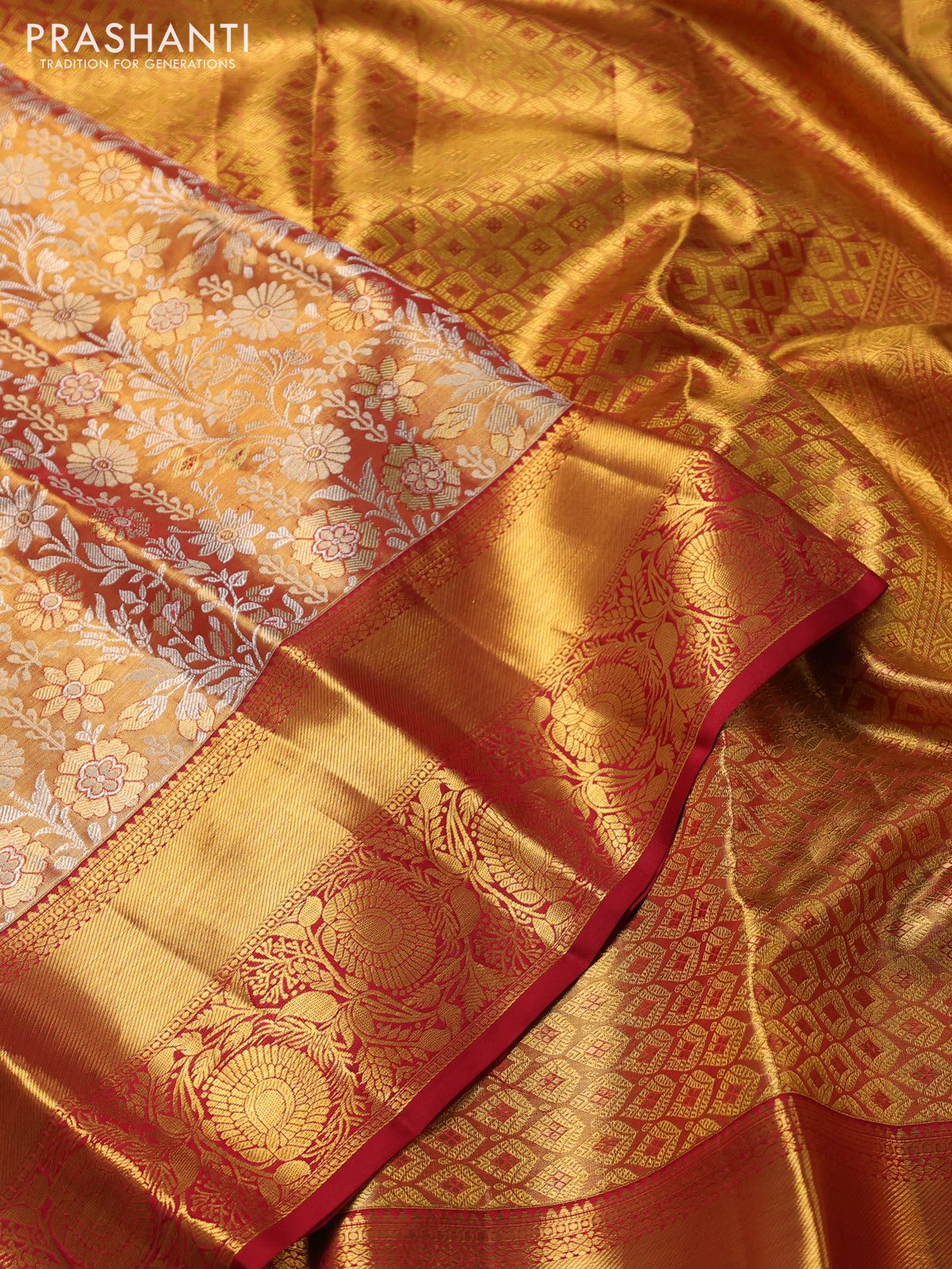 Pure kanchipuram tissue silk saree gold and maroon with allover zari woven brocade weaves and zari woven border
