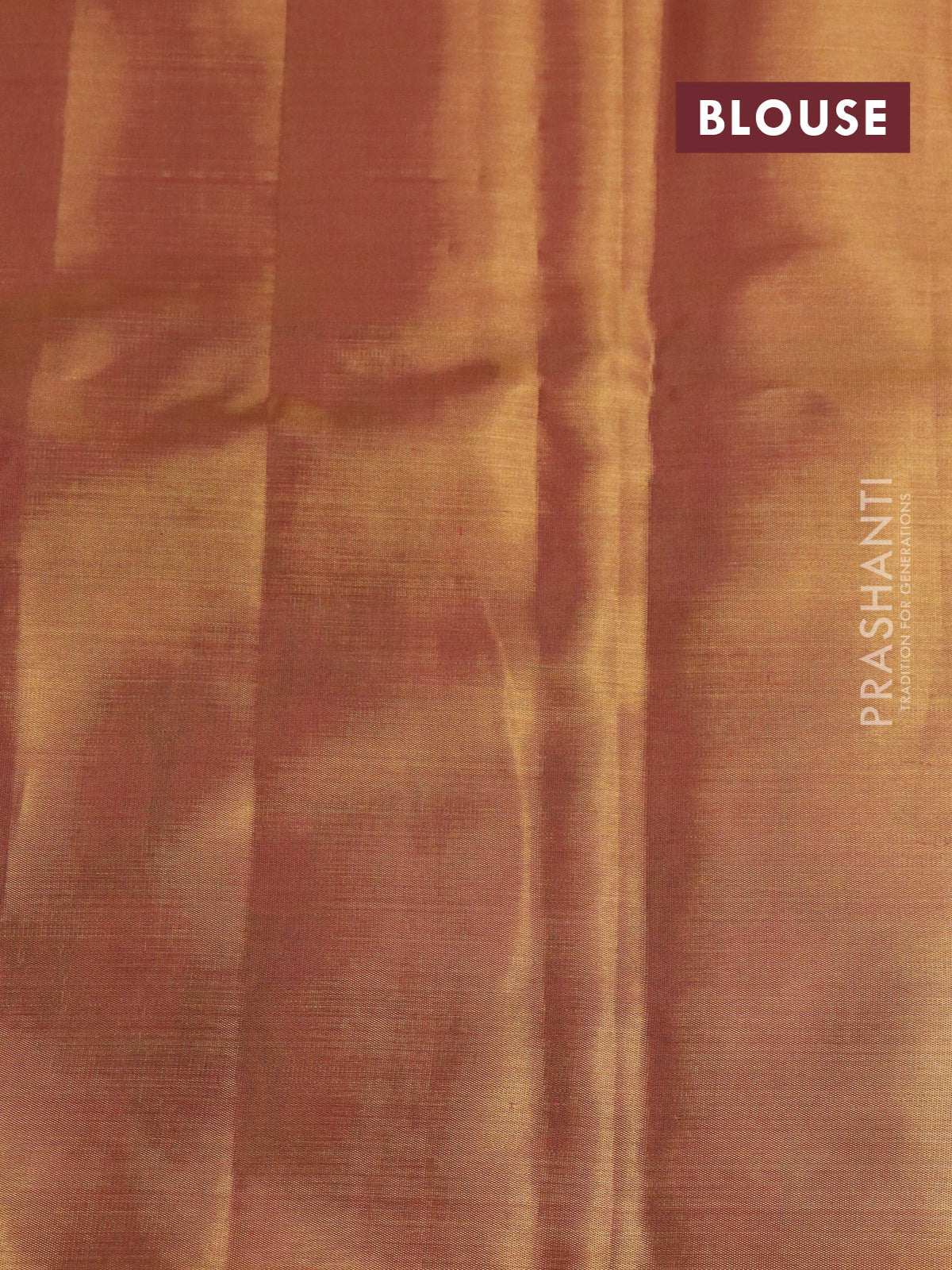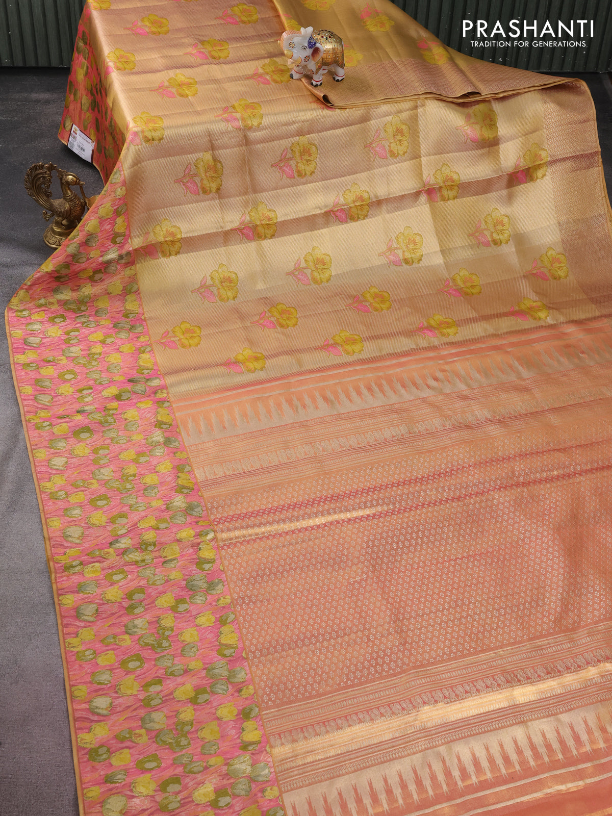 Pure kanchipuram tissue silk saree gold and peach pink with floral design motif and long rich floral design border