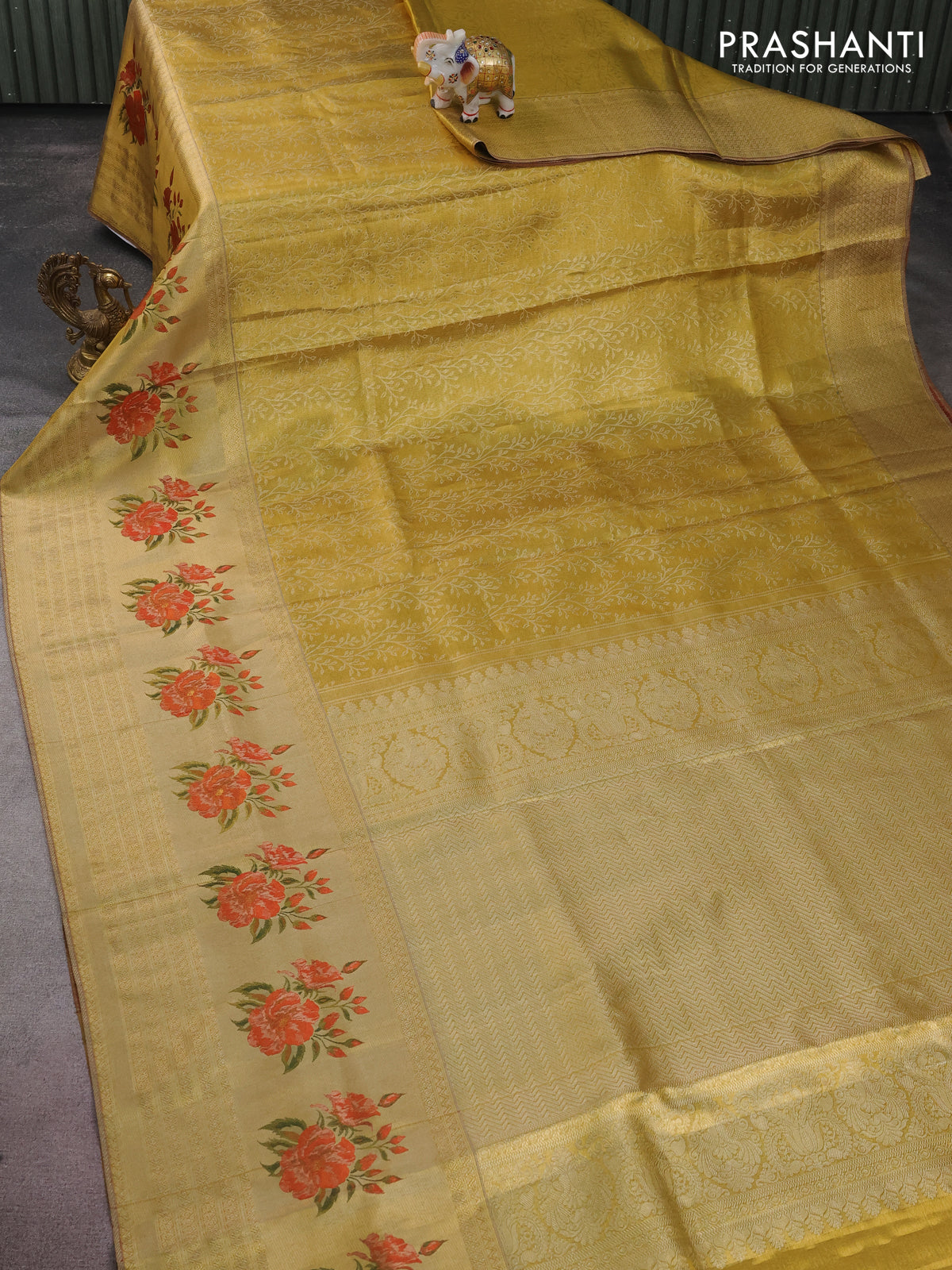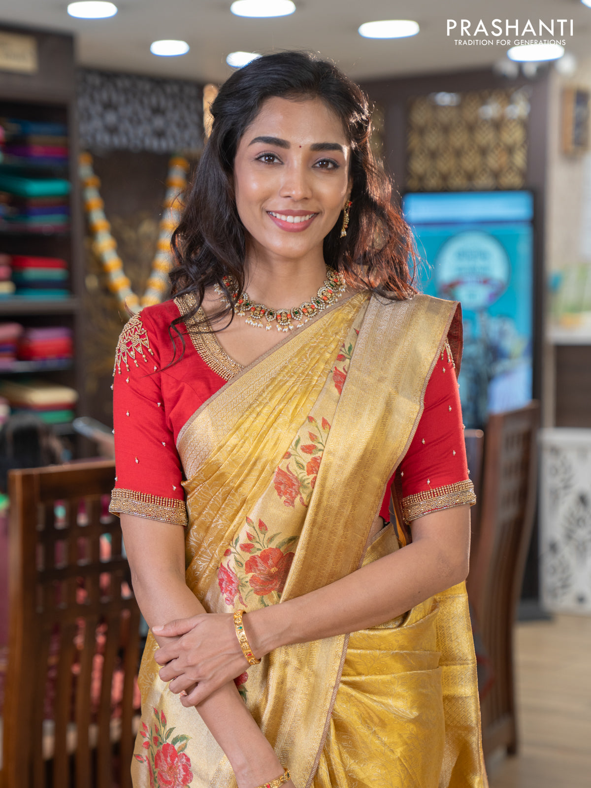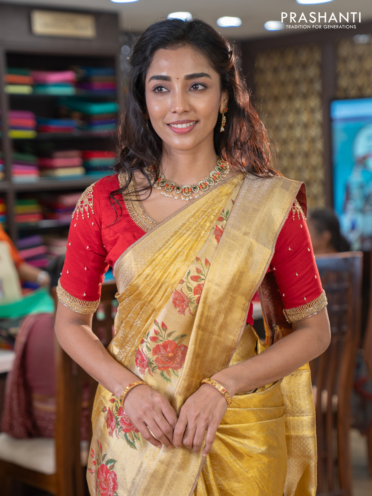 Pure kanchipuram tissue silk saree gold and red with allover zari weaves and floral design butta border