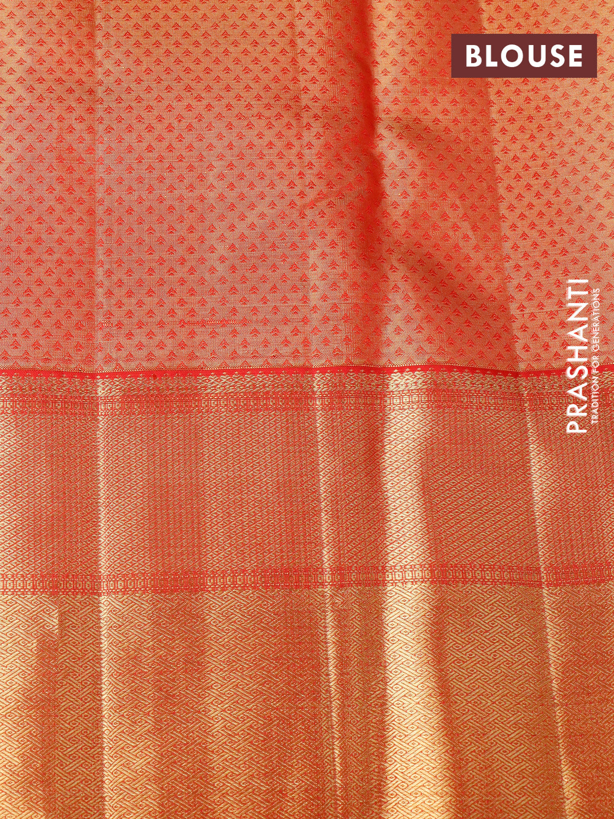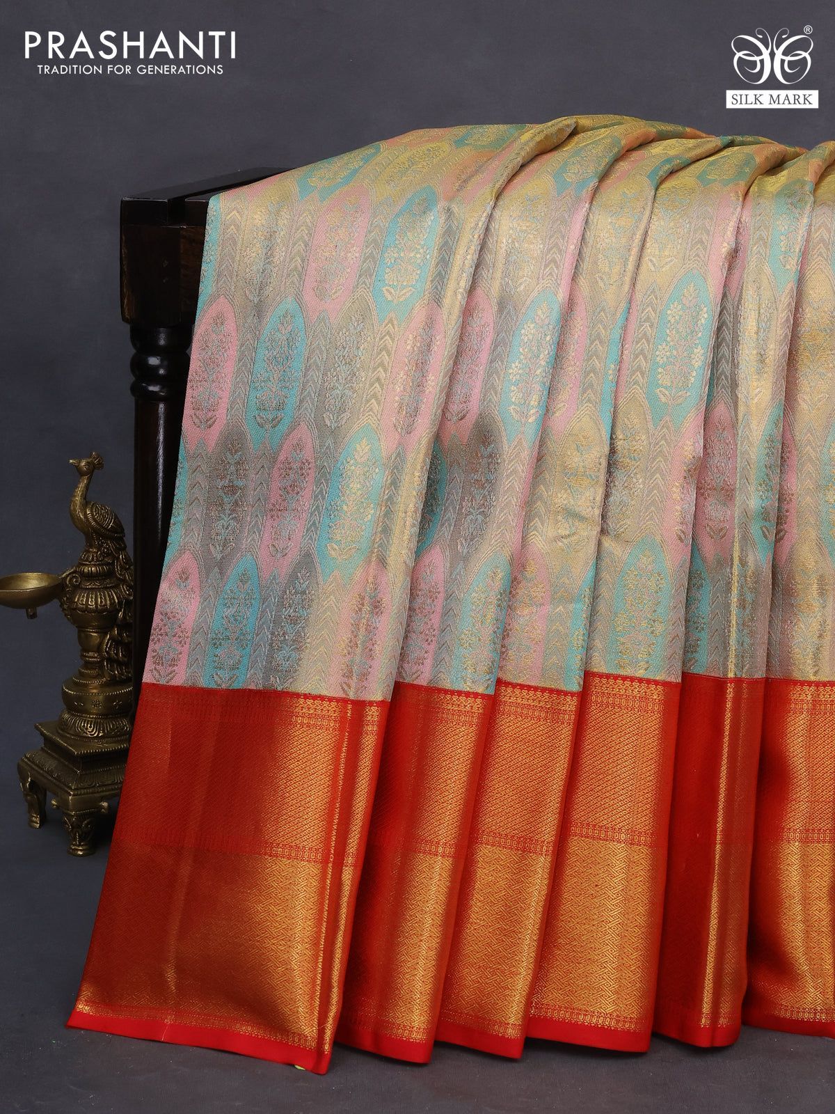 Pure kanchipuram tissue silk saree light pink teal blue and red with allover zari woven brocade weaves and long rich zari woven border