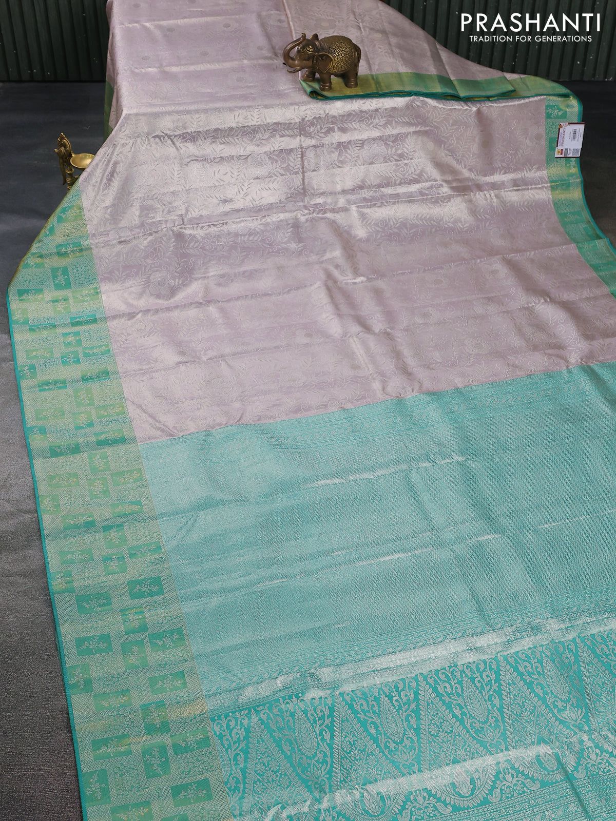 Pure kanchipuram tissue silk saree pastel grey and teal green with allover silver zari woven brocade weaves and silver zari woven border