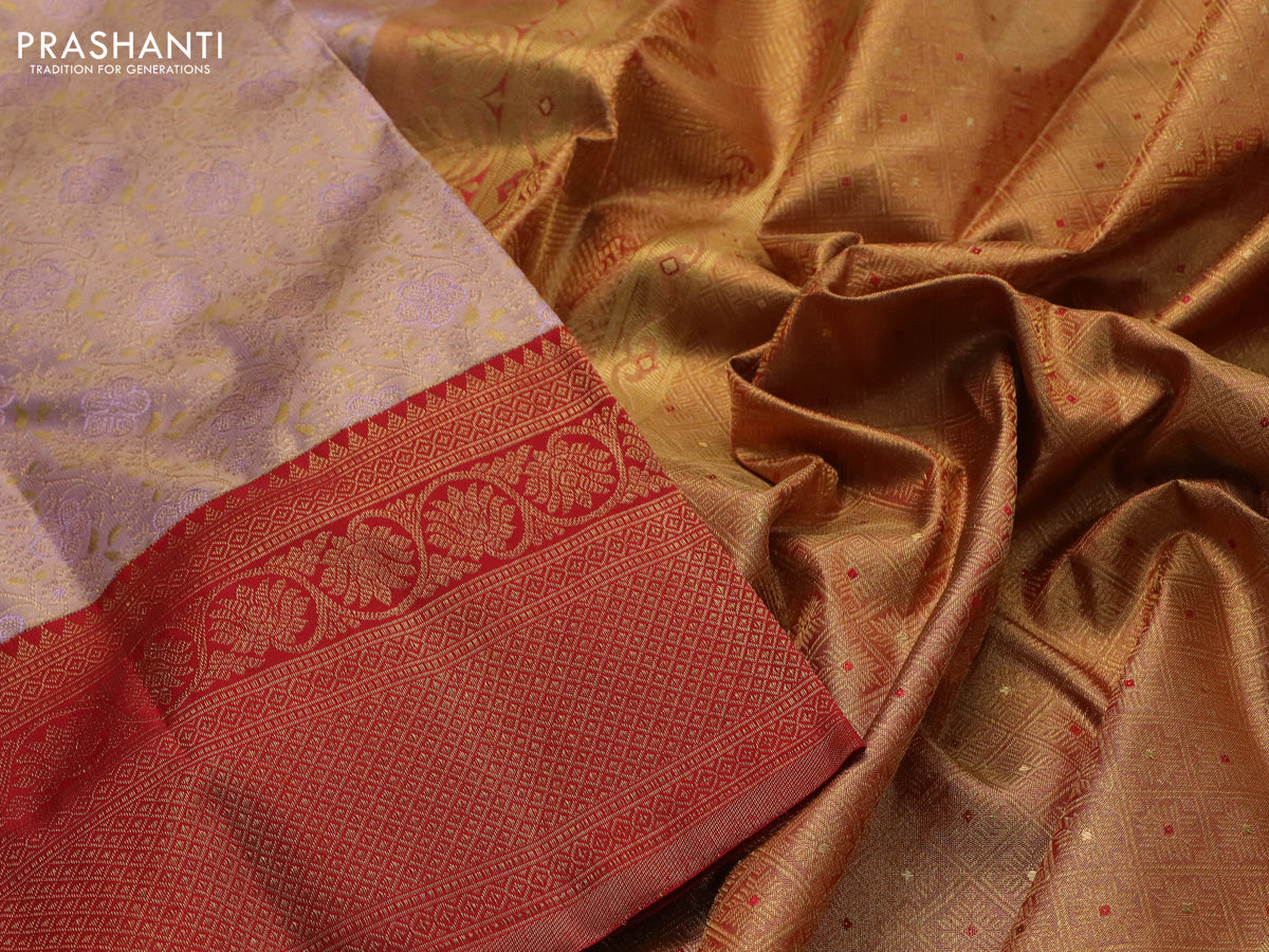Pure kanchipuram tissue silk saree pastel lavender and red with allover zari woven brocade weaves and zari woven border