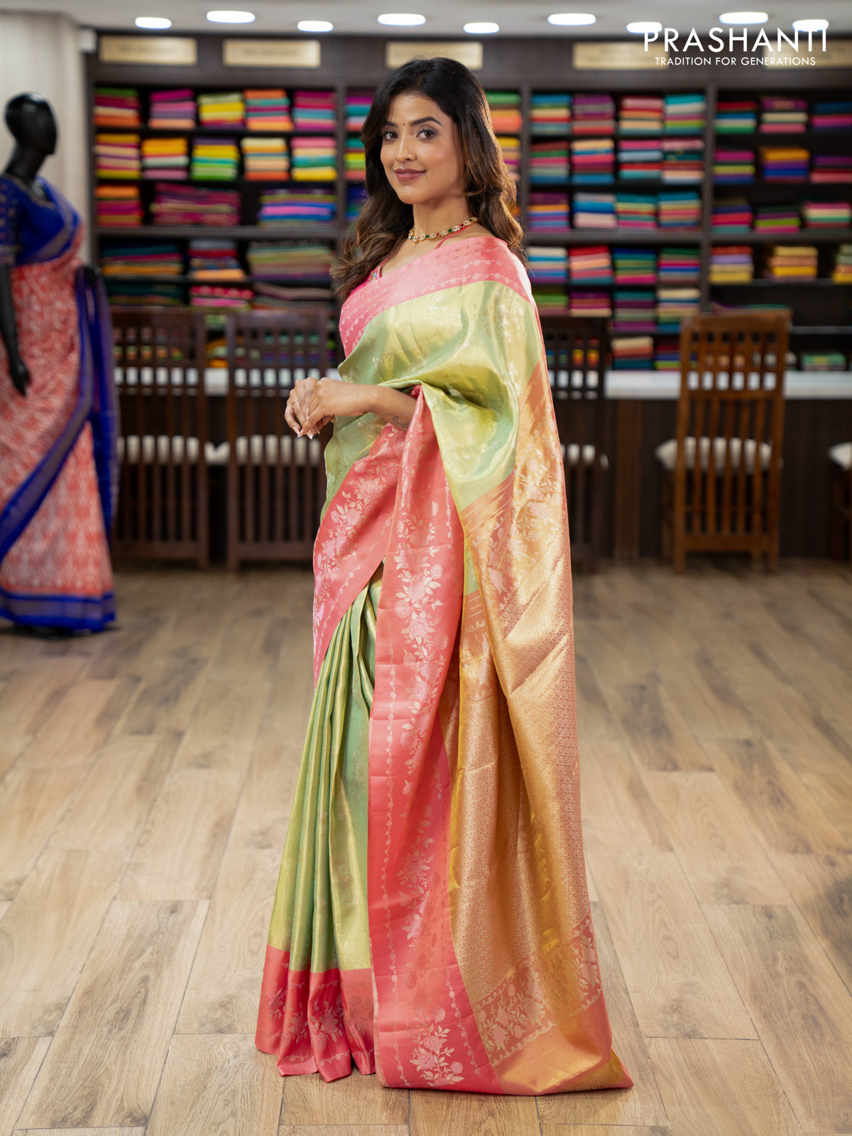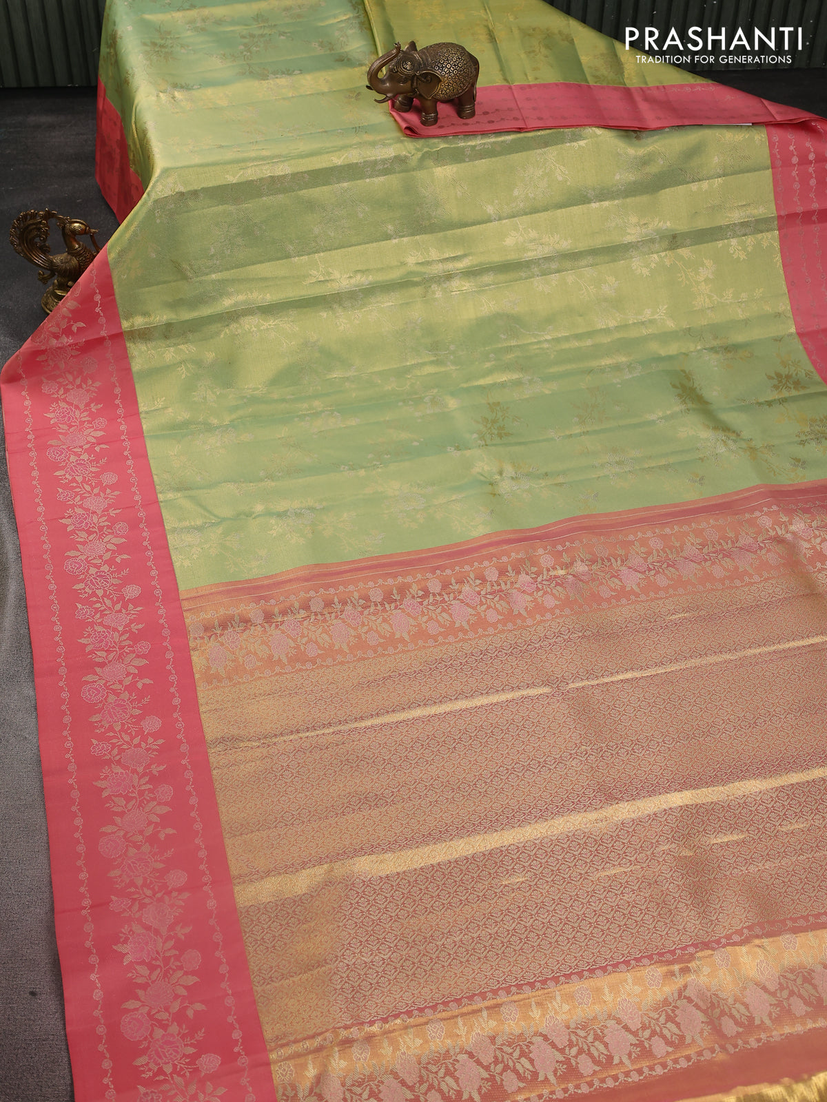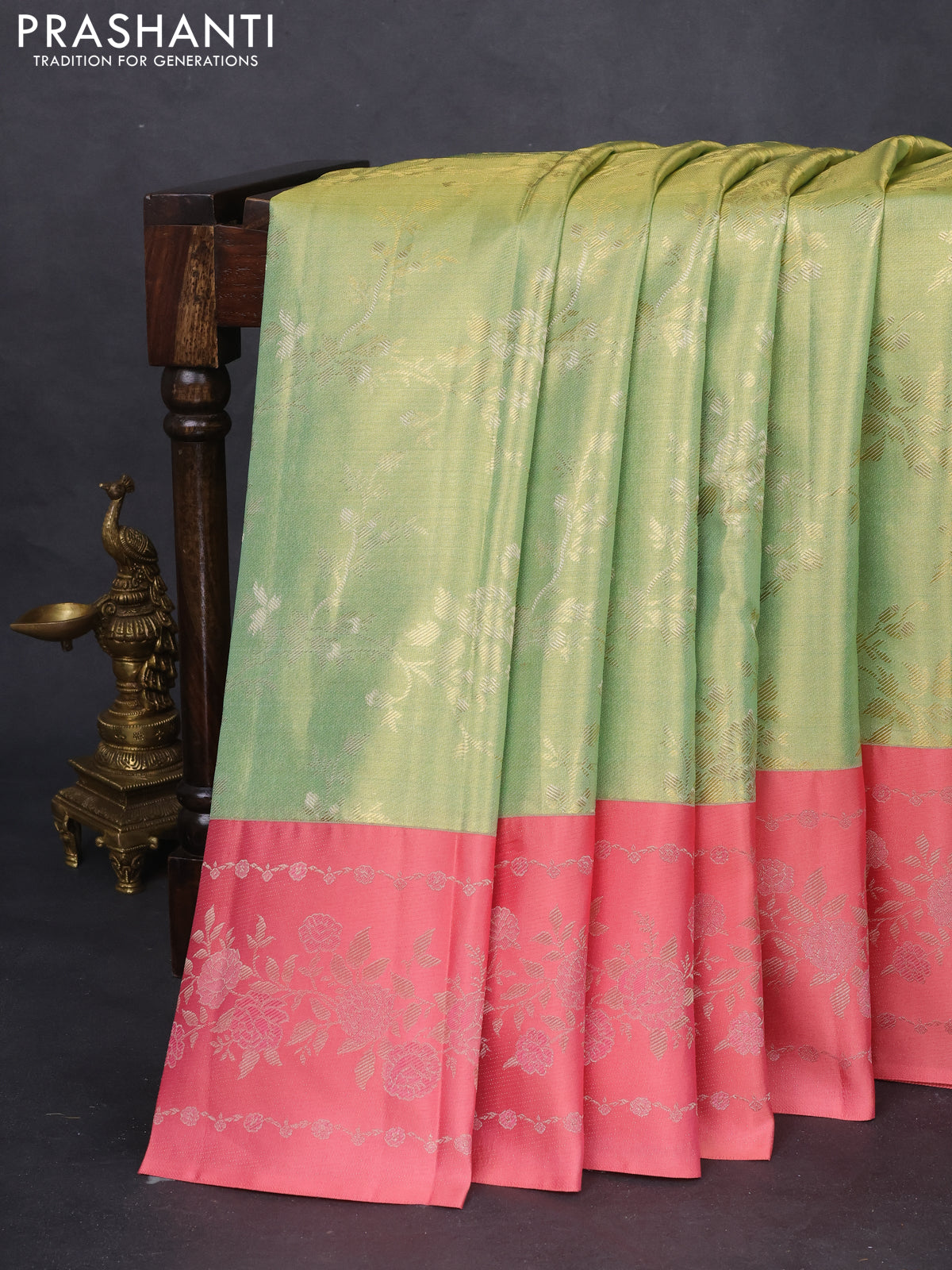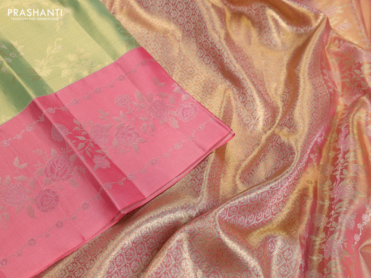 Pure kanchipuram Tissue silk saree pista green and peach shade with allover zari weaves and floral design zari border