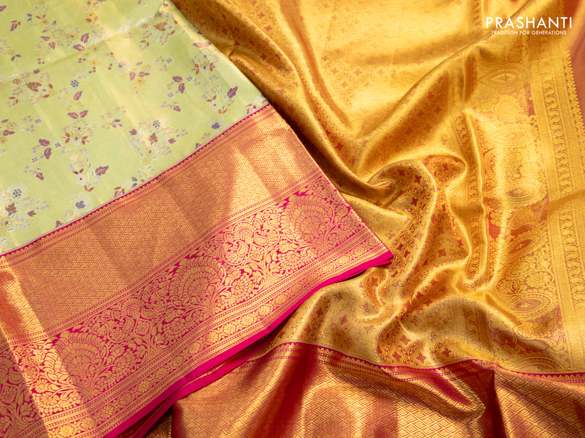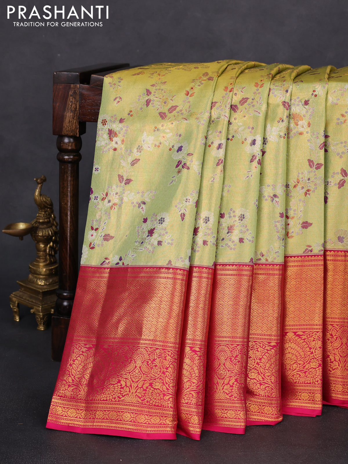 Pure kanchipuram tissue silk saree pista green and pink with allover zari woven mina weaves and long zari woven border