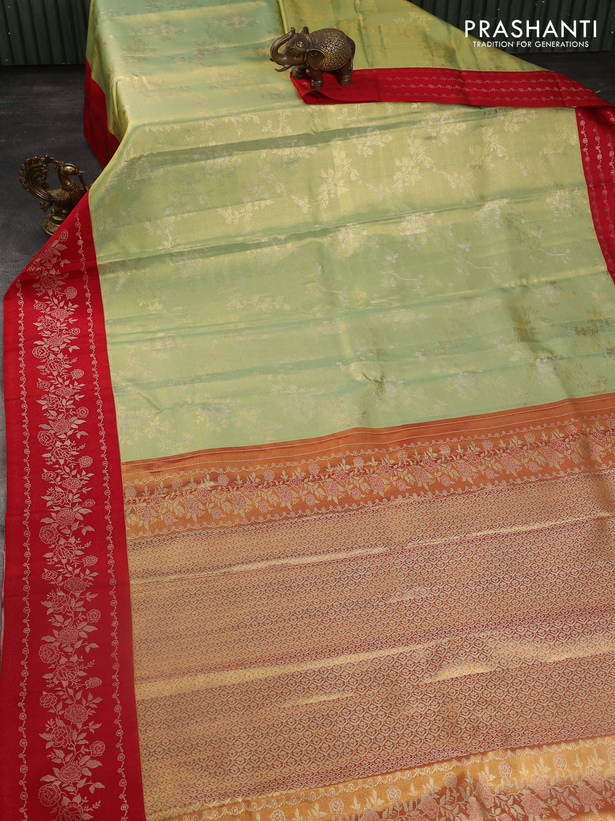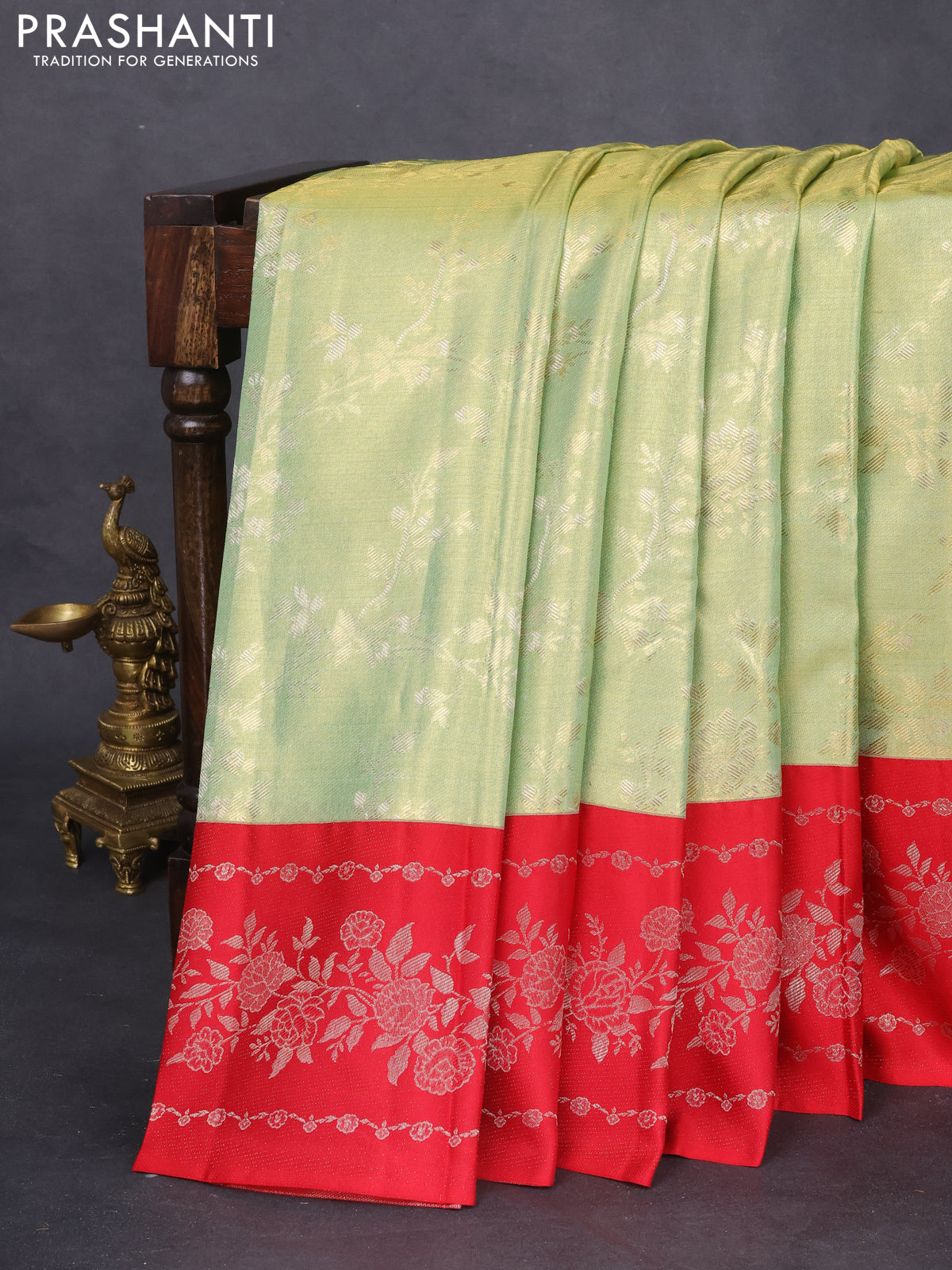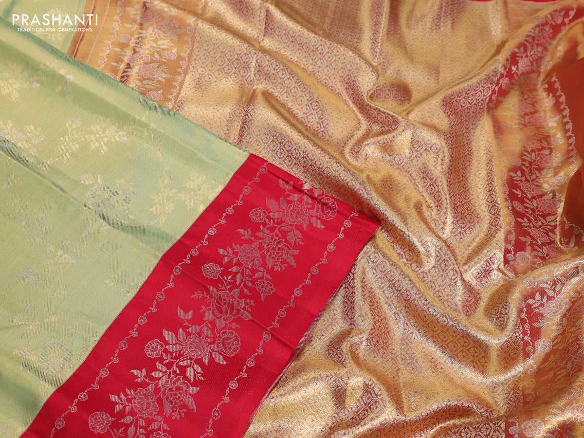 Pure kanchipuram Tissue silk saree pista green and red with allover zari weaves and floral design zari border