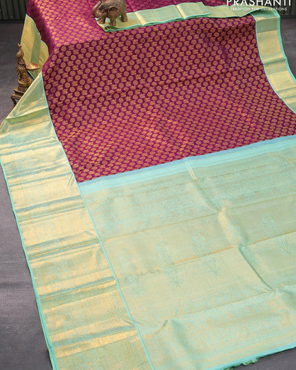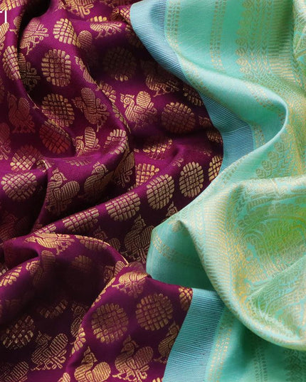 Pure kanjivaram silk saree deep purple and teal blue shade with allover annam zari woven butta weaves and rich zari woven border
