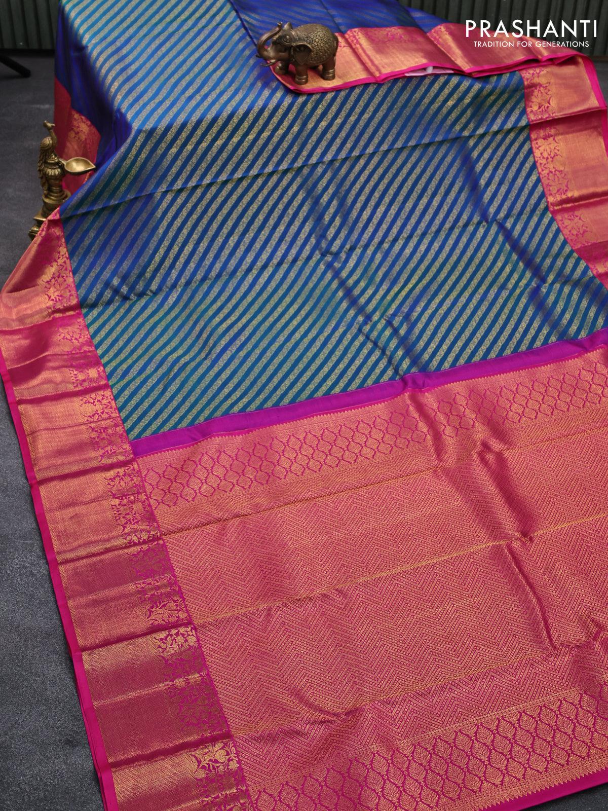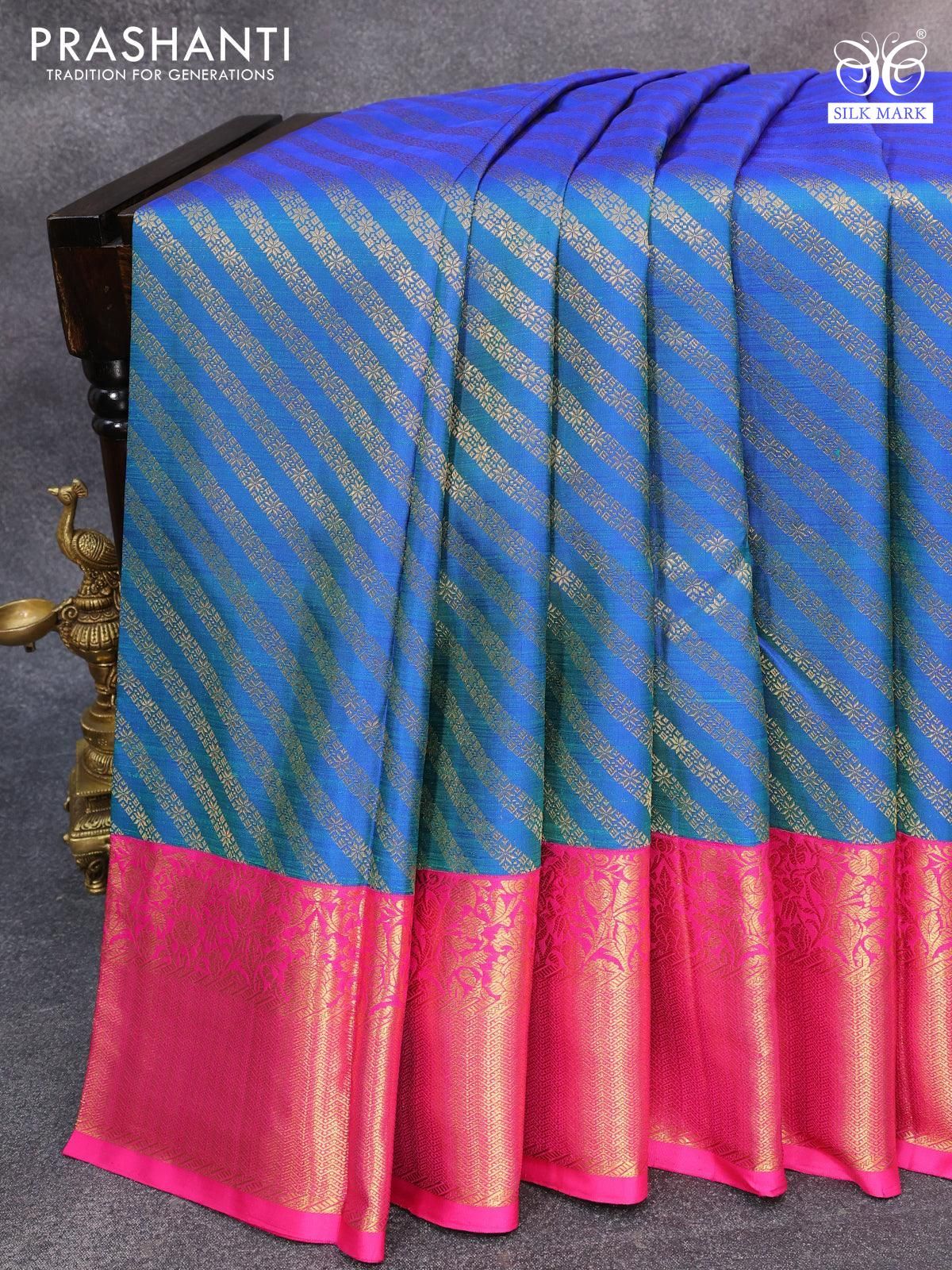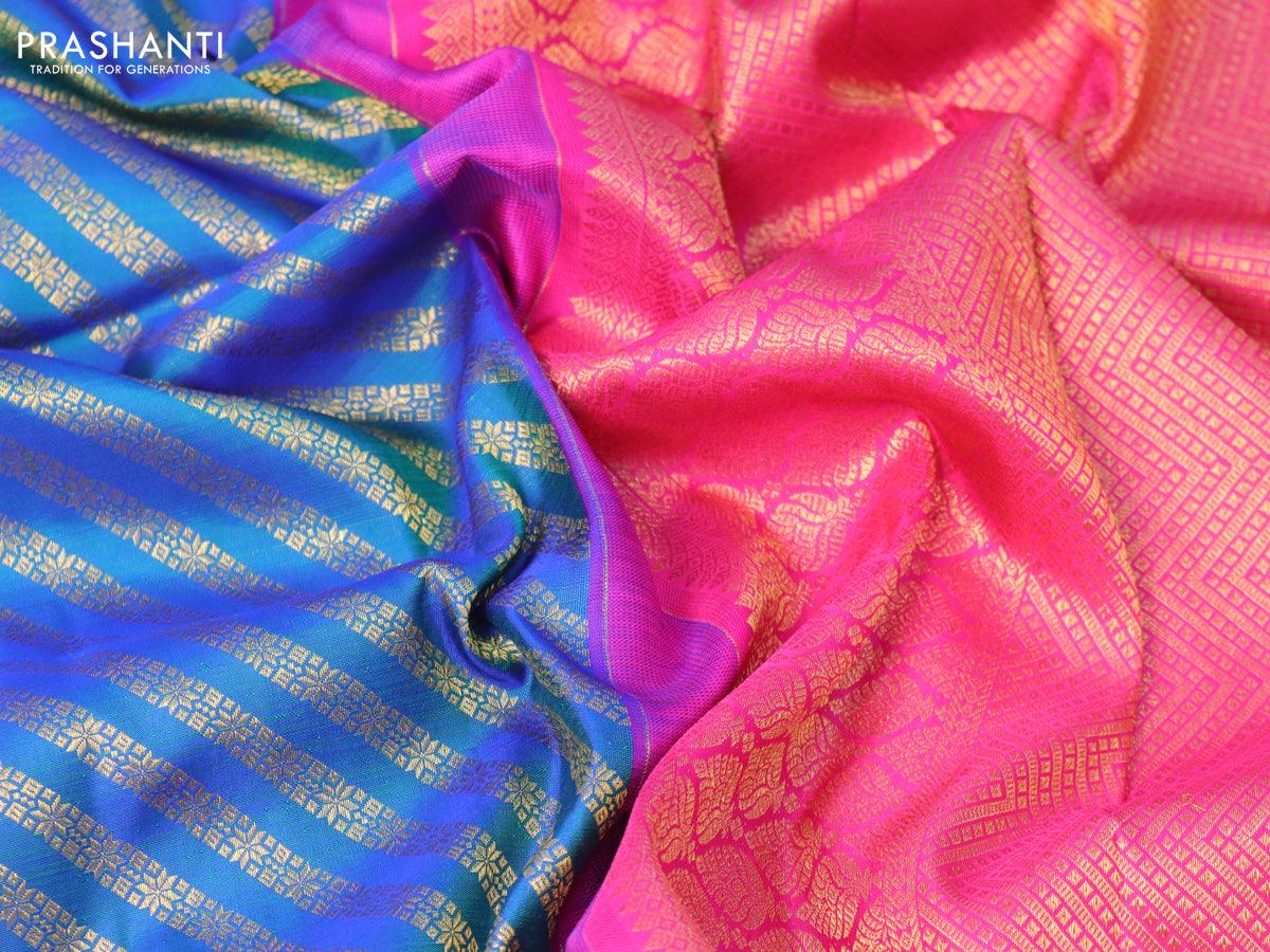 Pure kanjivaram silk saree dual shade of bluish green and pink with allover zari weaves and rich floral zari woven border