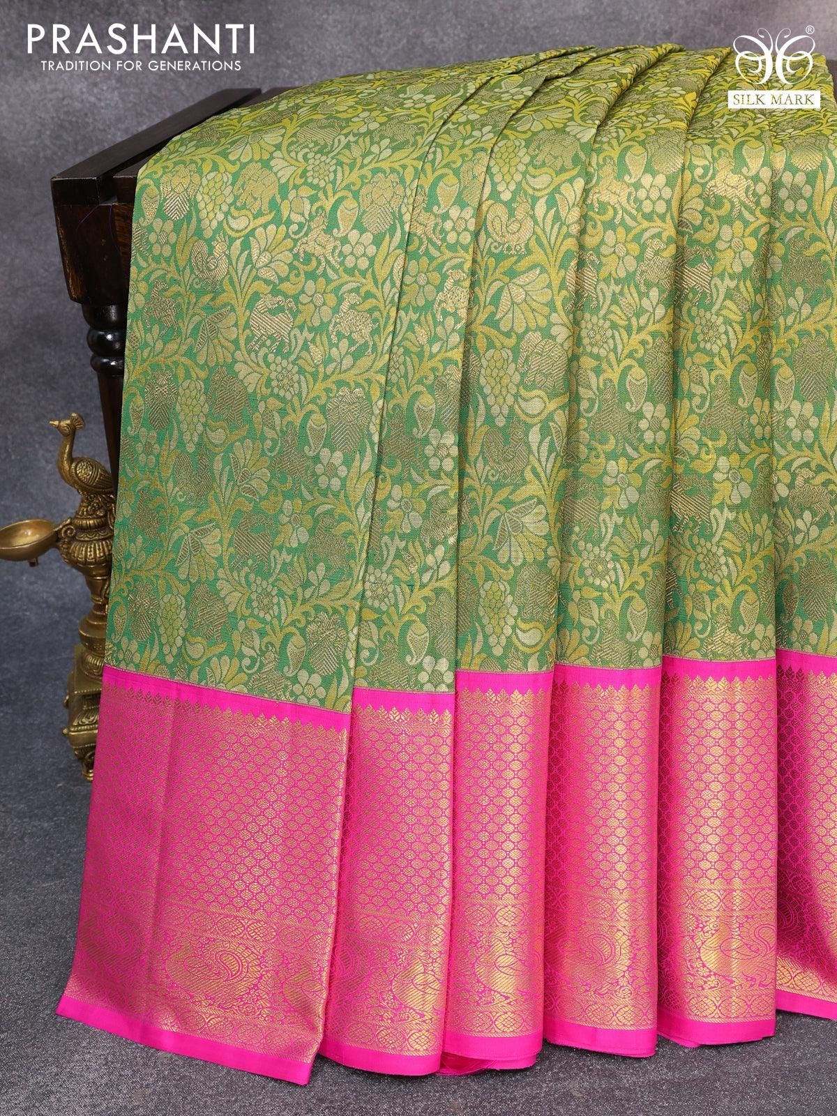 Pure kanjivaram silk saree green and pink with allover zari woven brocade weaves and long zari woven annam border
