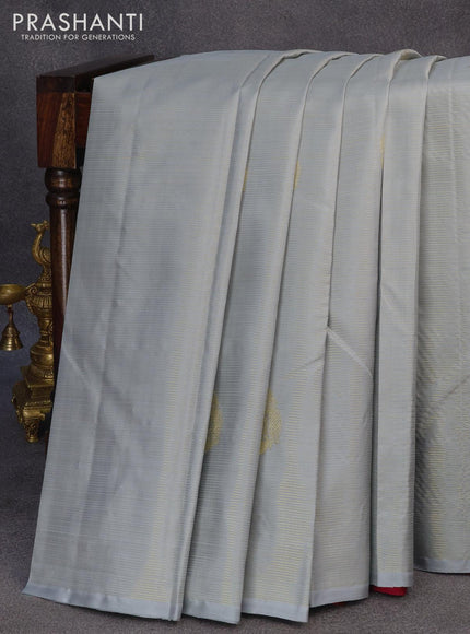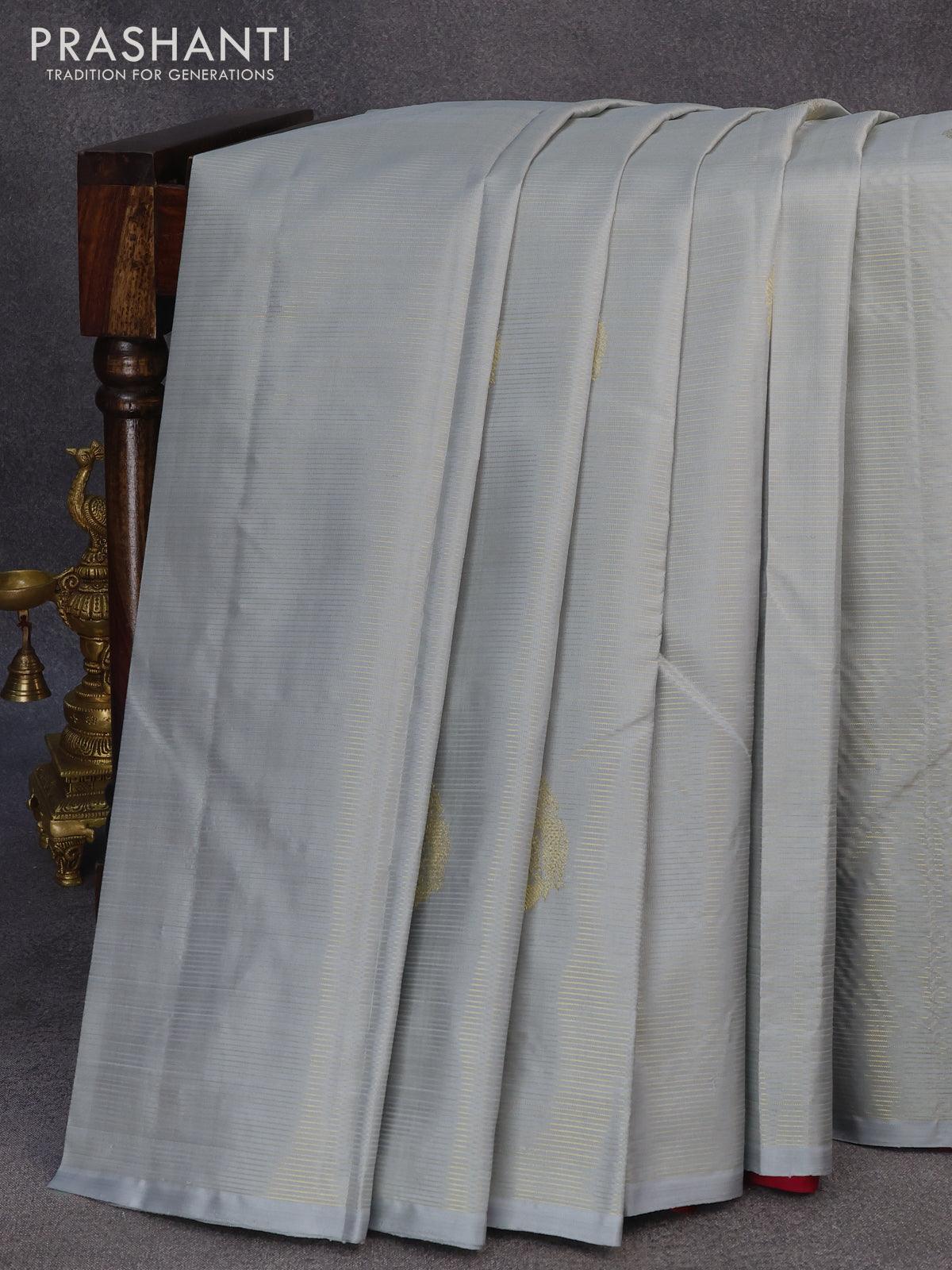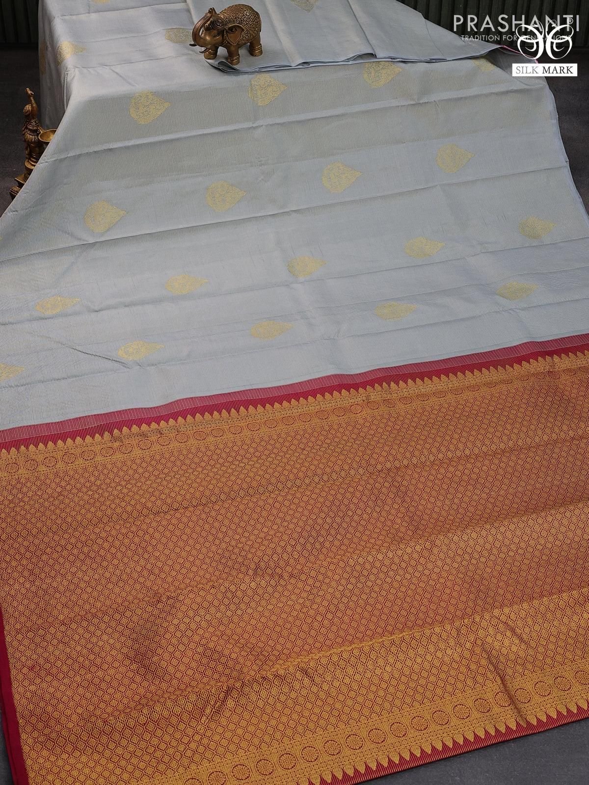 Pure kanjivaram silk saree grey and maroon with allover zari weaves & zari buttas in borderless style
