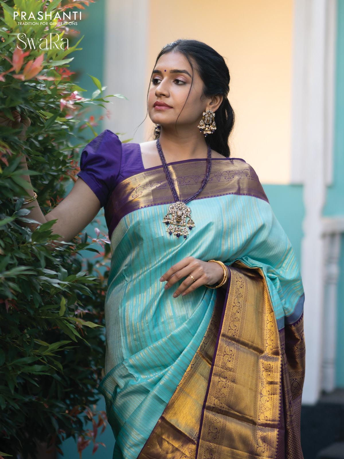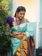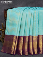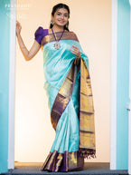Pure kanjivaram silk saree light blue and violet with allover silver & gold zari weaves and long zari woven border