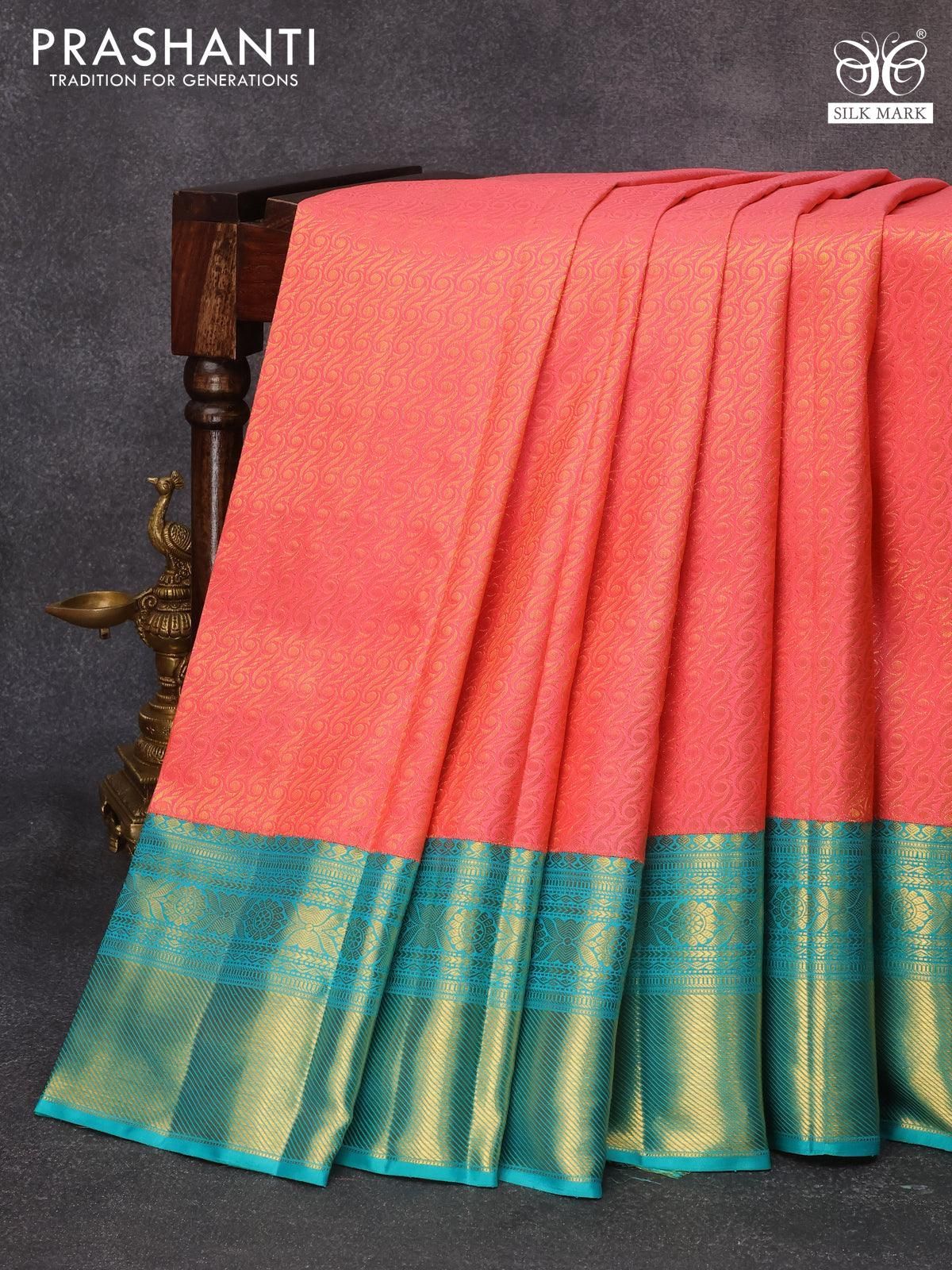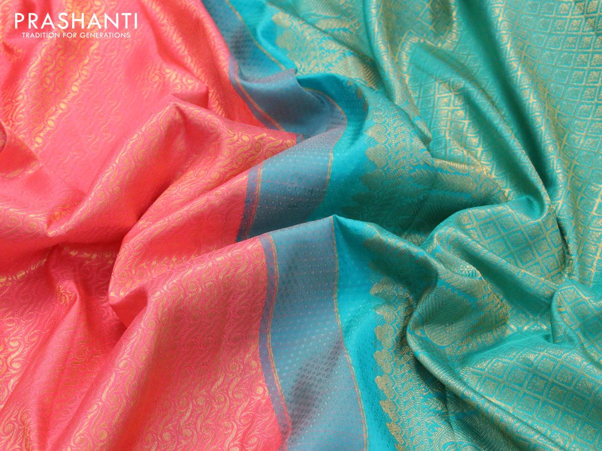 Pure kanjivaram silk saree peach pink and teal green with allover zari woven brocade weaves and rich zari woven border