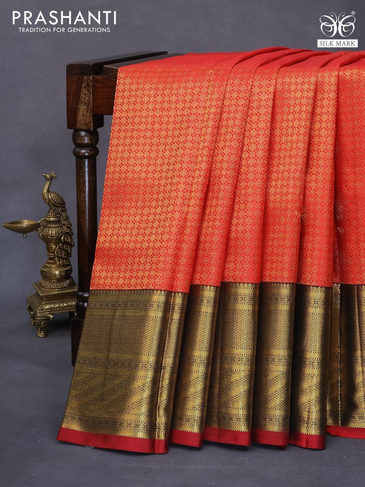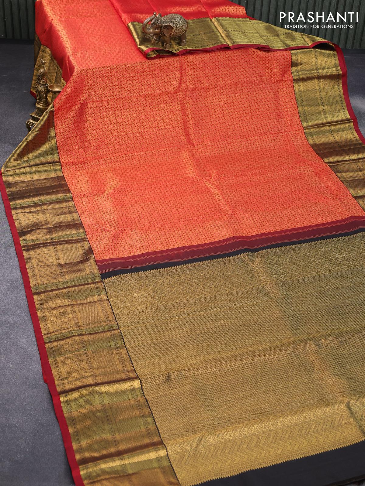 Pure kanjivaram silk saree red and black with allover zari woven brocade weaves and rich zari woven border