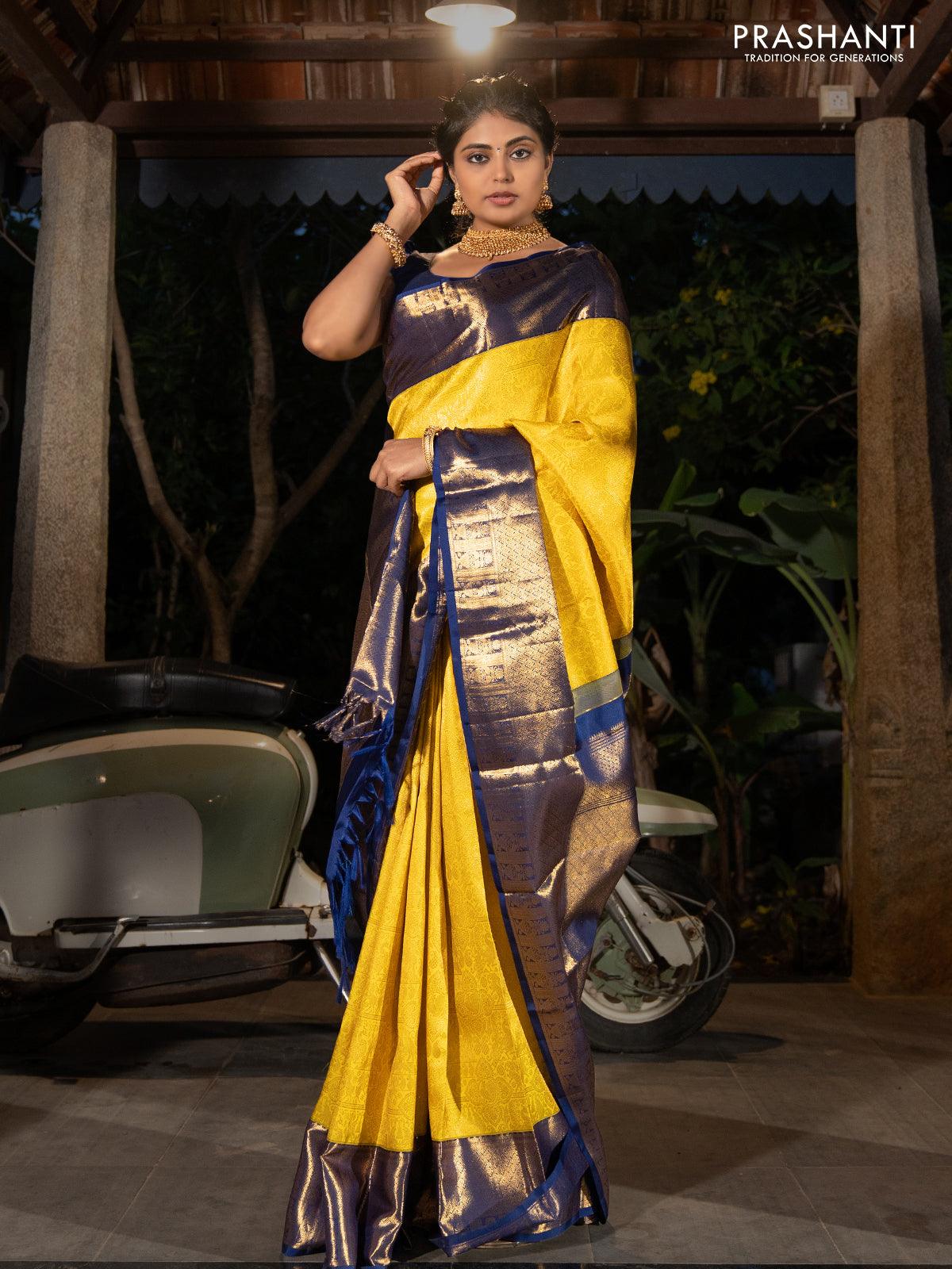 Pure kanjivaram silk saree yellow and blue with allover zari woven vanasingaram brocade weaves and peacock design zari woven korvai border