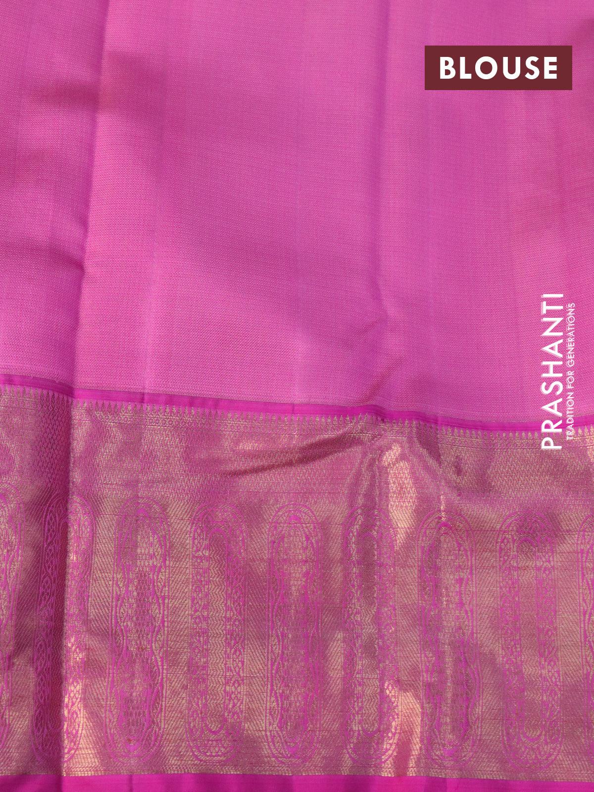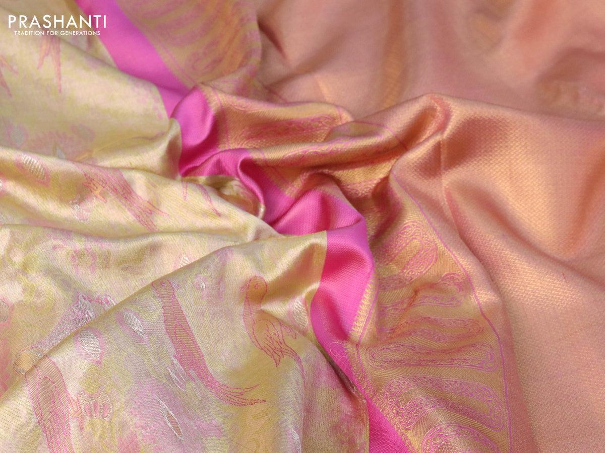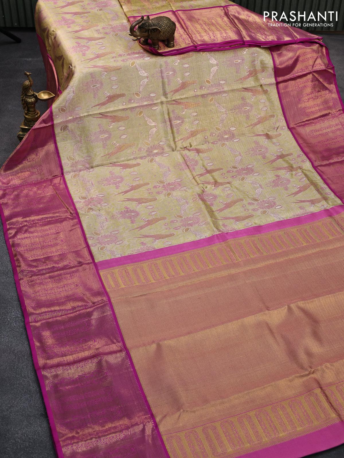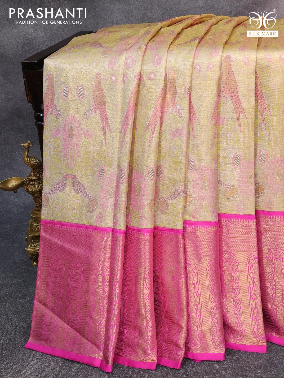 Pure kanjivaram tissue silk saree elaichi green and pink with allover zari woven parrot designbrocade weaves and long zari woven korvai border