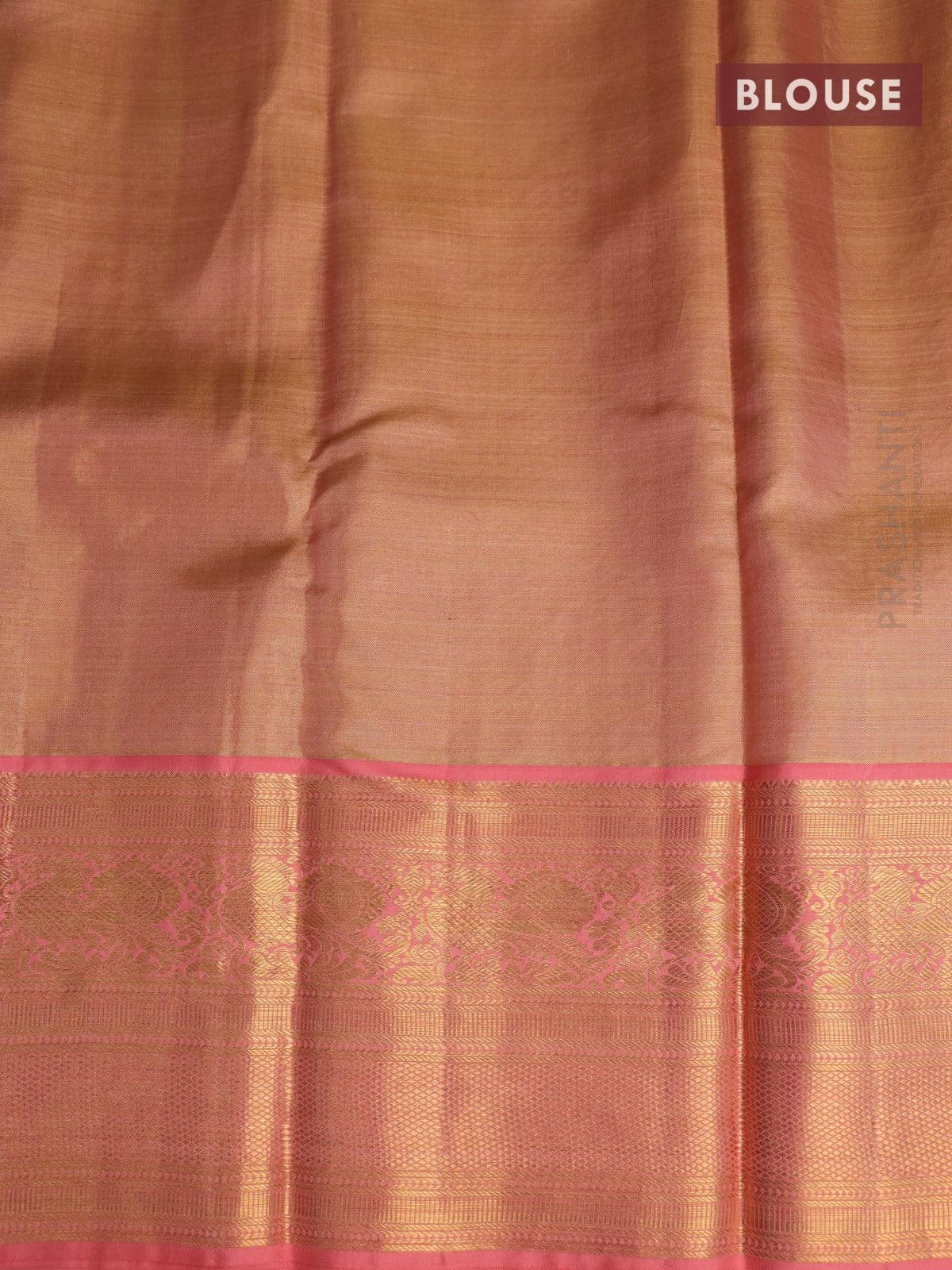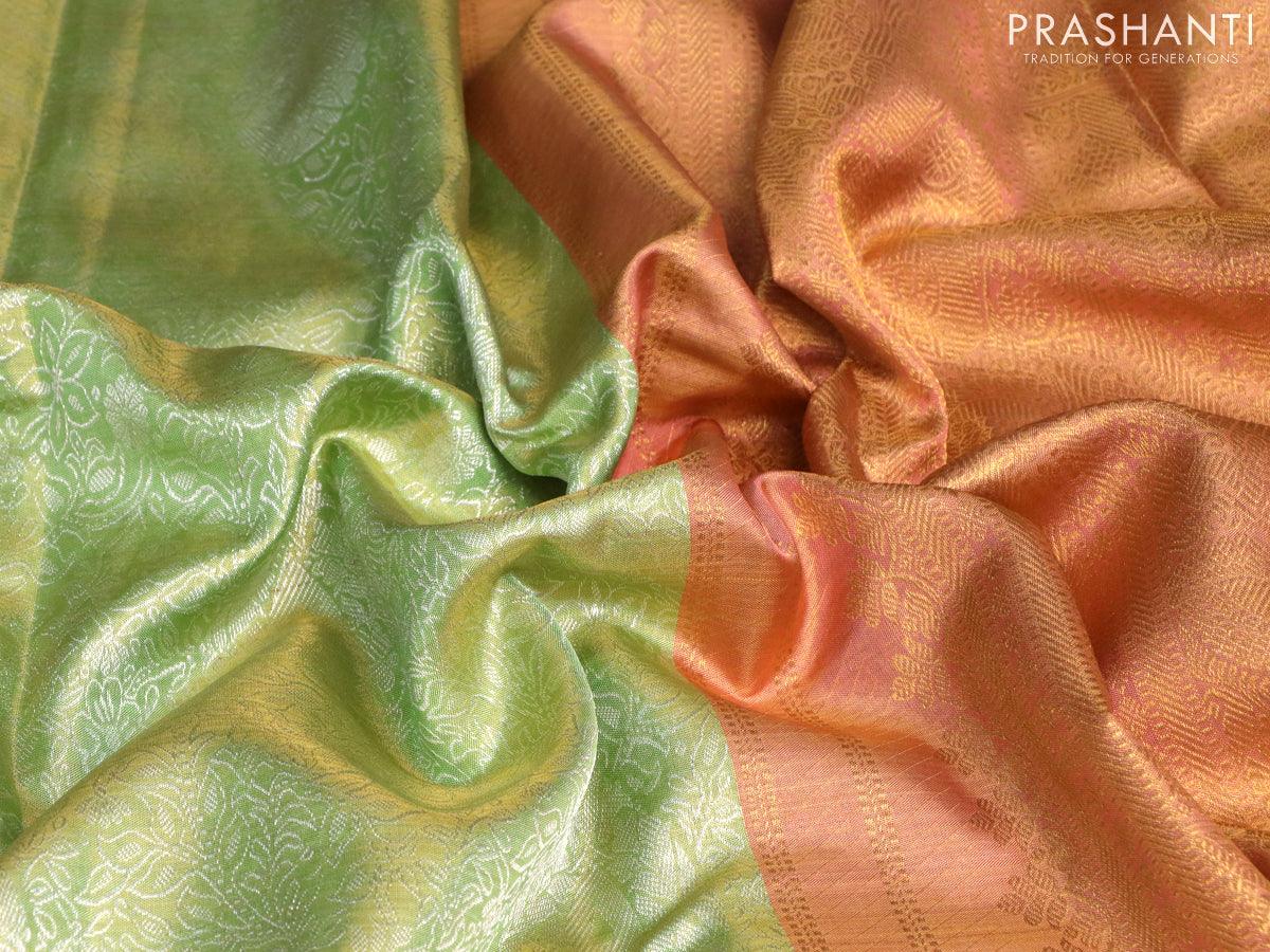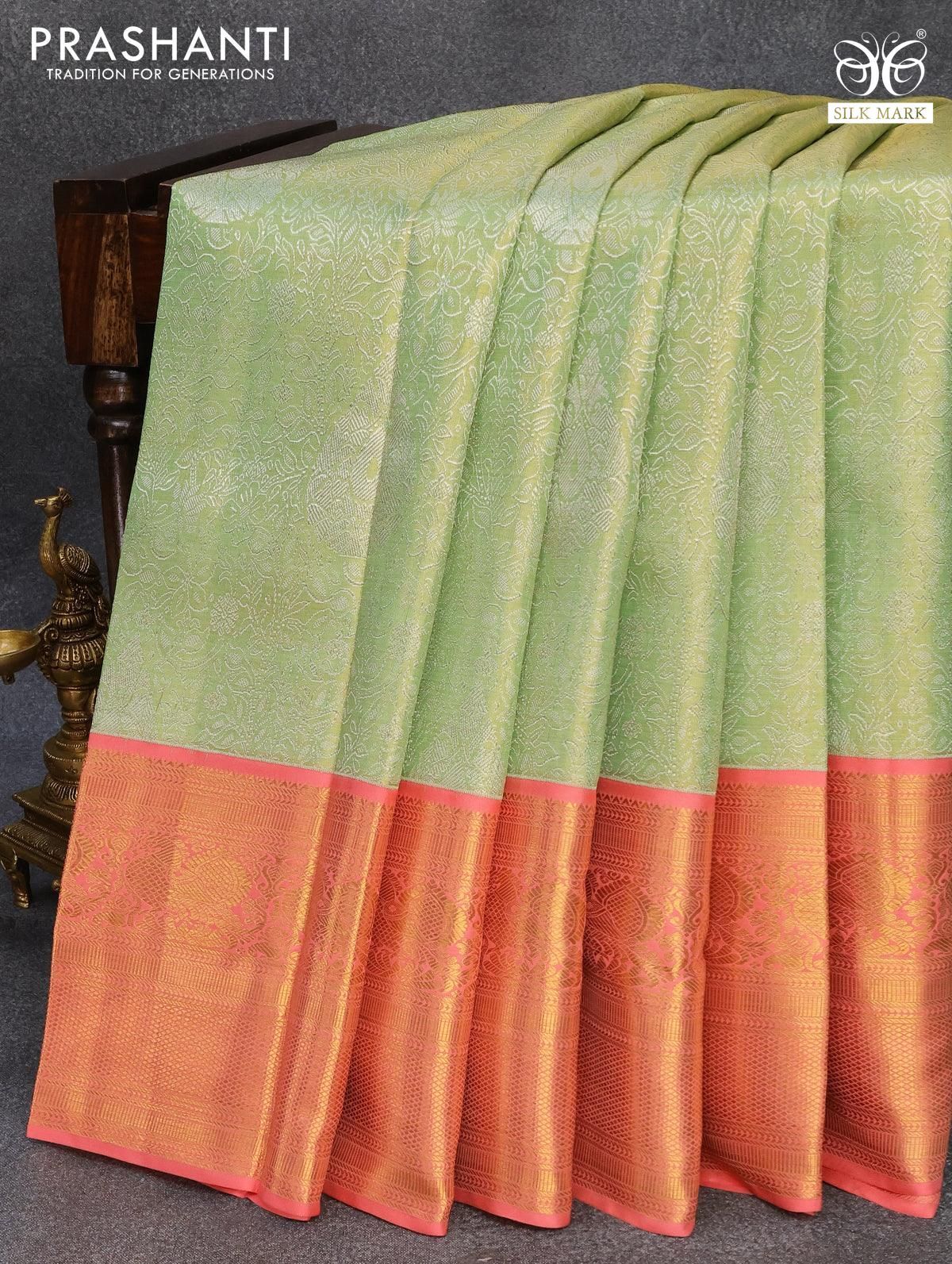 Pure kanjivaram tissue silk saree pista green and peach pink with allover silver zari woven brocade weaves and long annam zari woven border