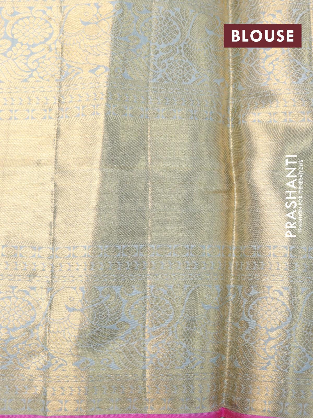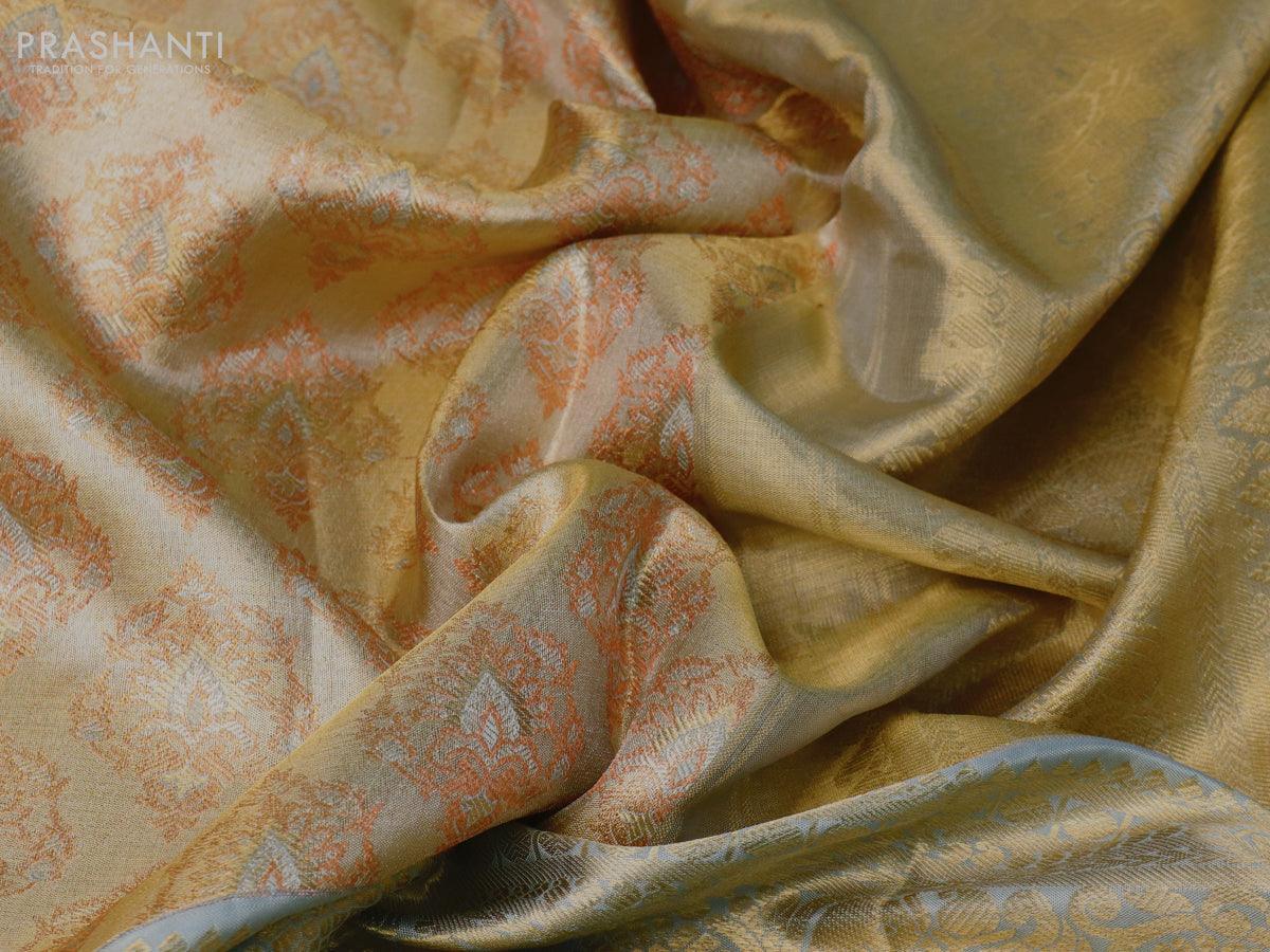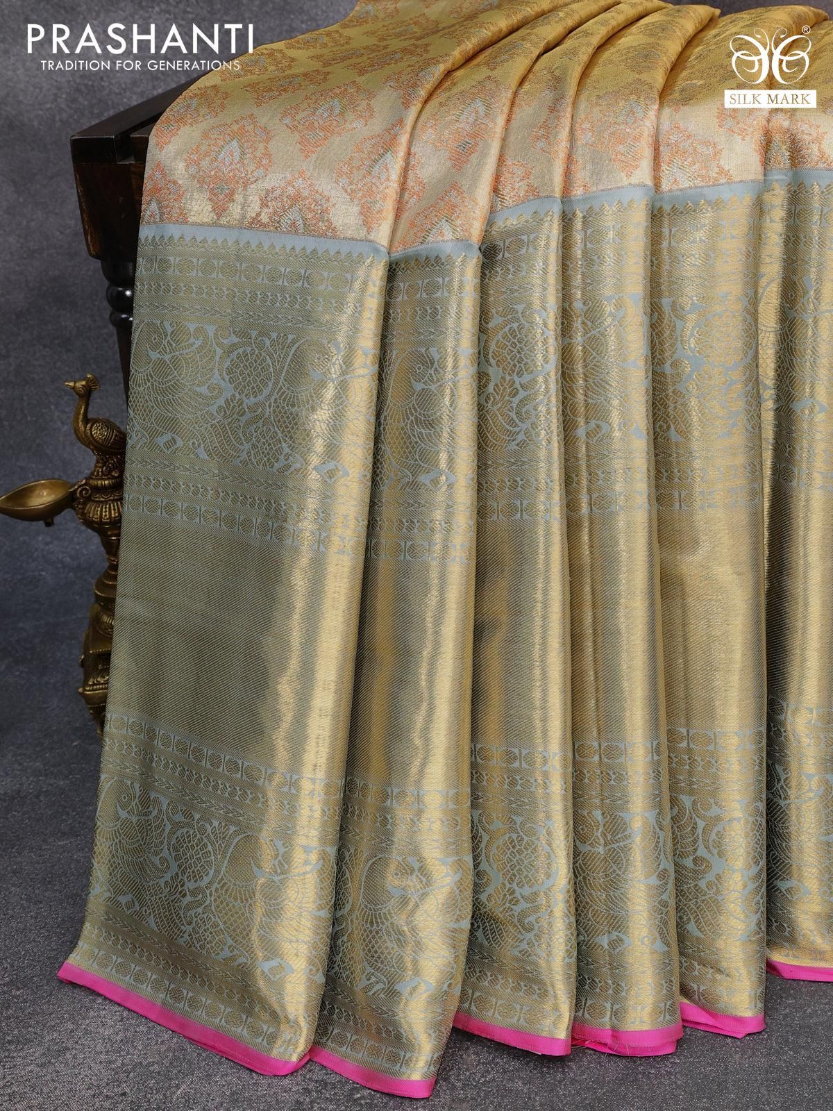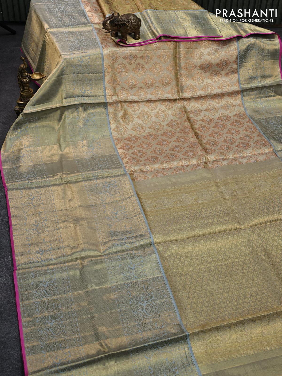 Pure kanjivaram tissue silk saree sandal and grey with allover zari woven butta weaves and long rich peacock zari woven border