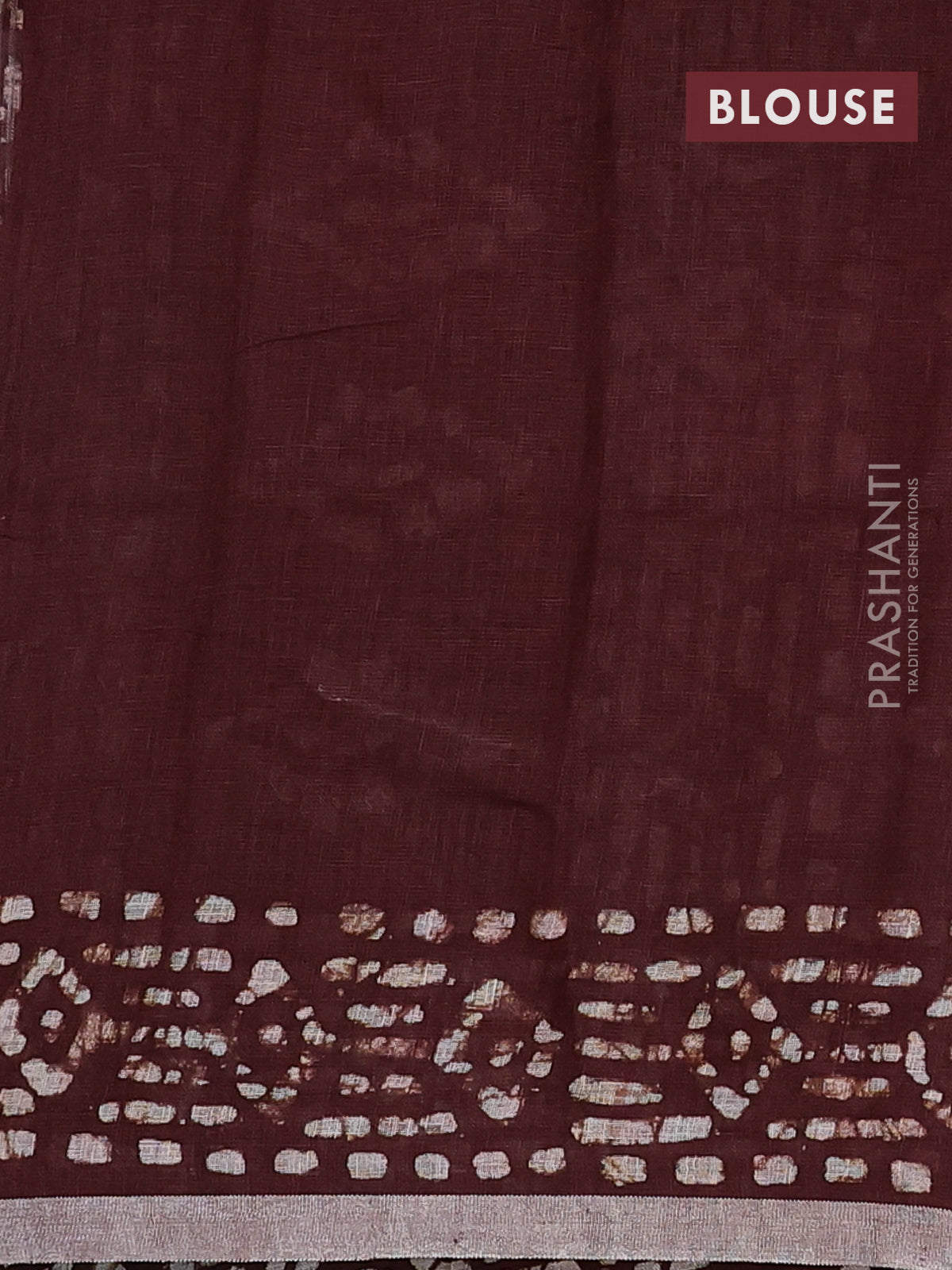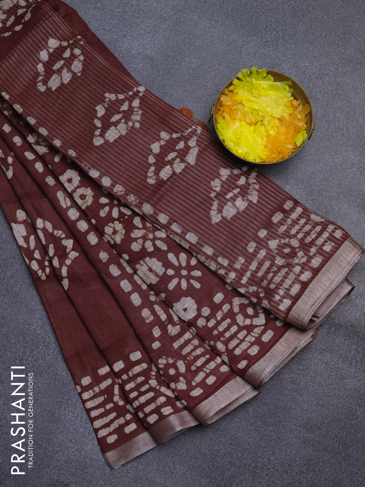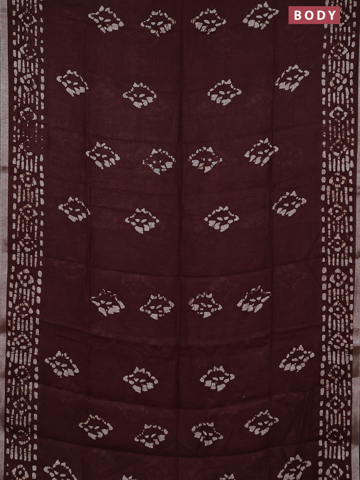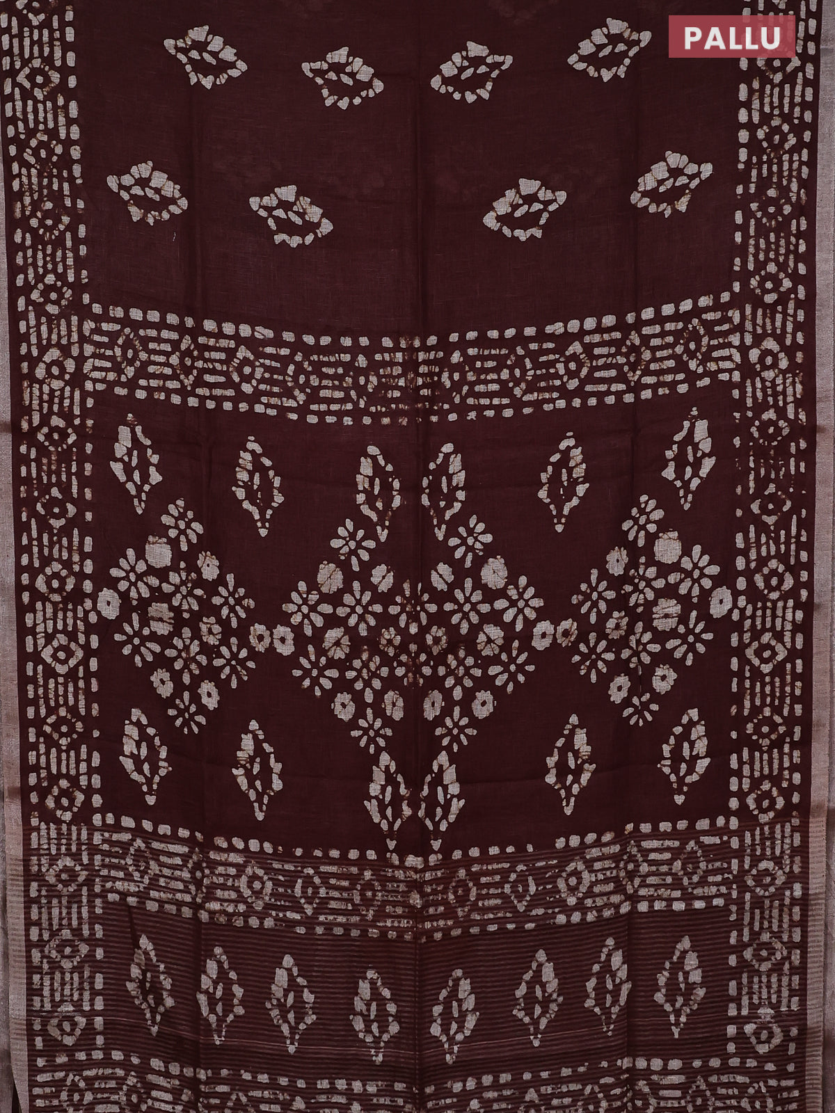 Pure linen saree brown with allover batik prints and silver zari woven border